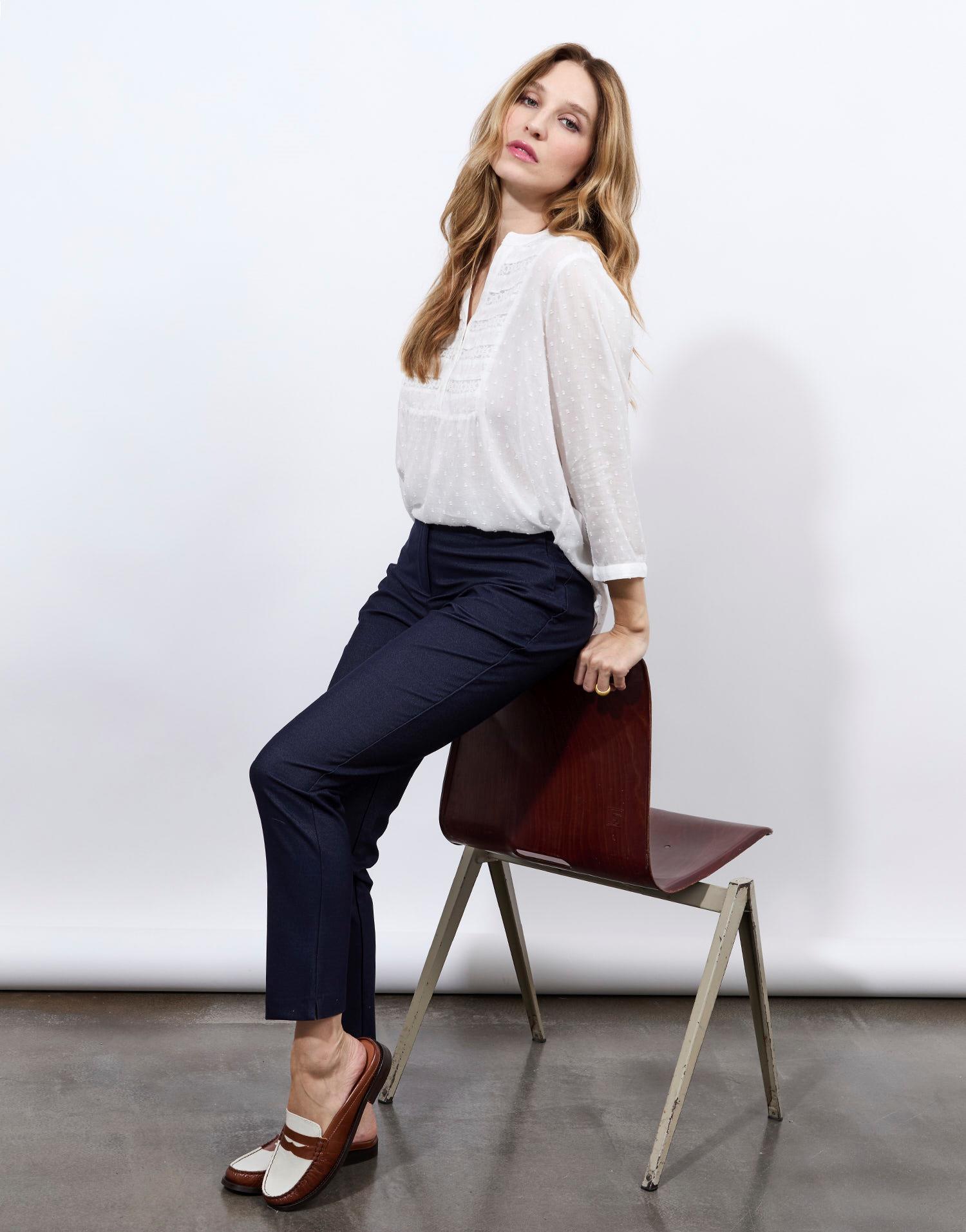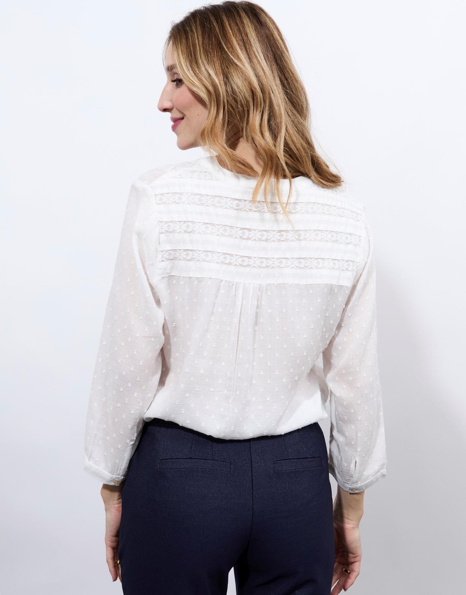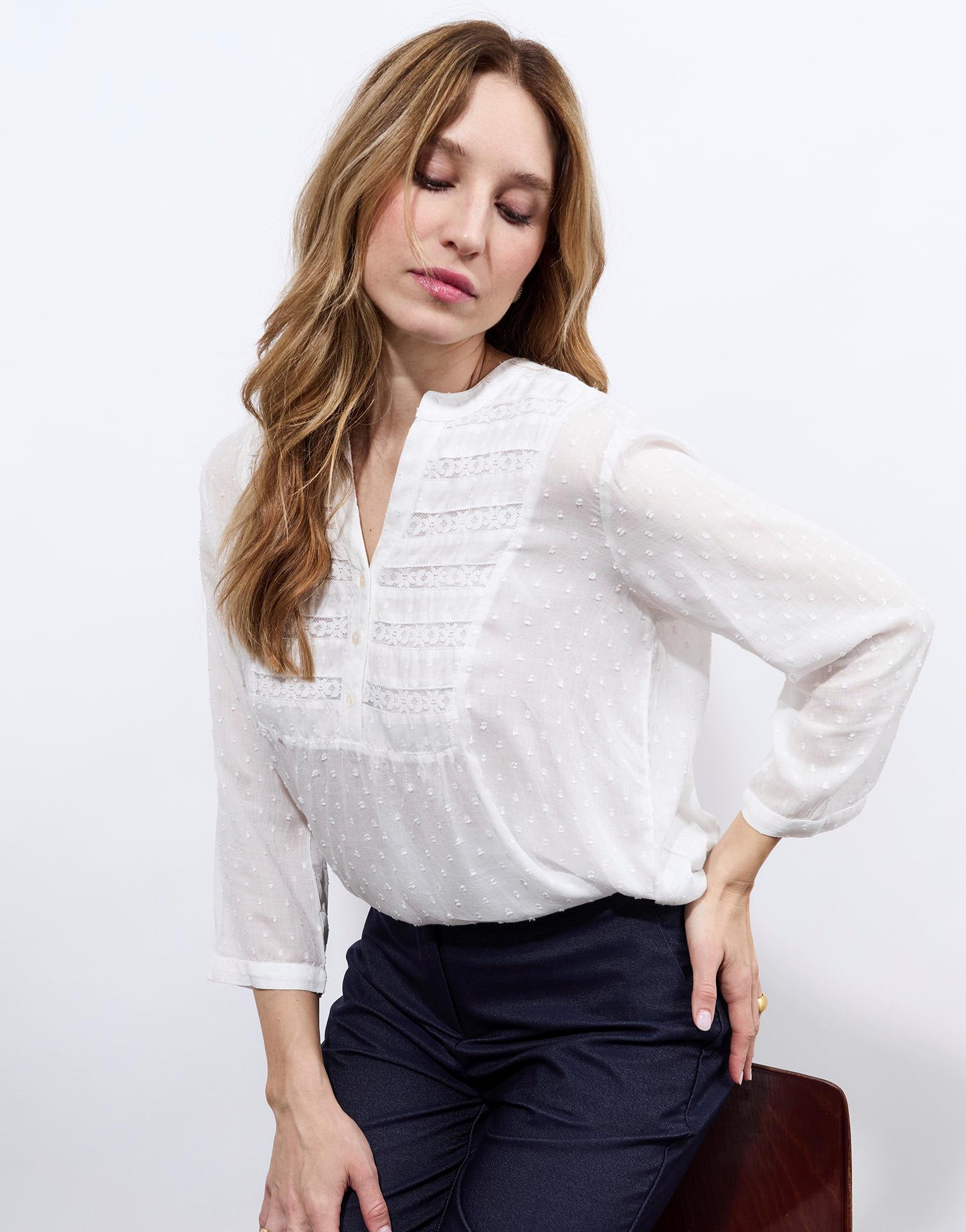 Blouse en plumetis à l’allure délicate et féminine. Elle se distingue par son plastron orné de bandes de dentelle qui apportent du relief et de l’élégance. Son encolure légèrement ouverte et ses manches 3/4 complètent sa silhouette légère et raffinée. La mannequin fait 1m75 et porte une taille 38.