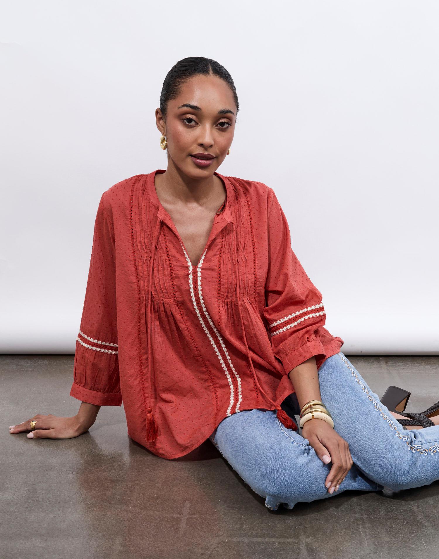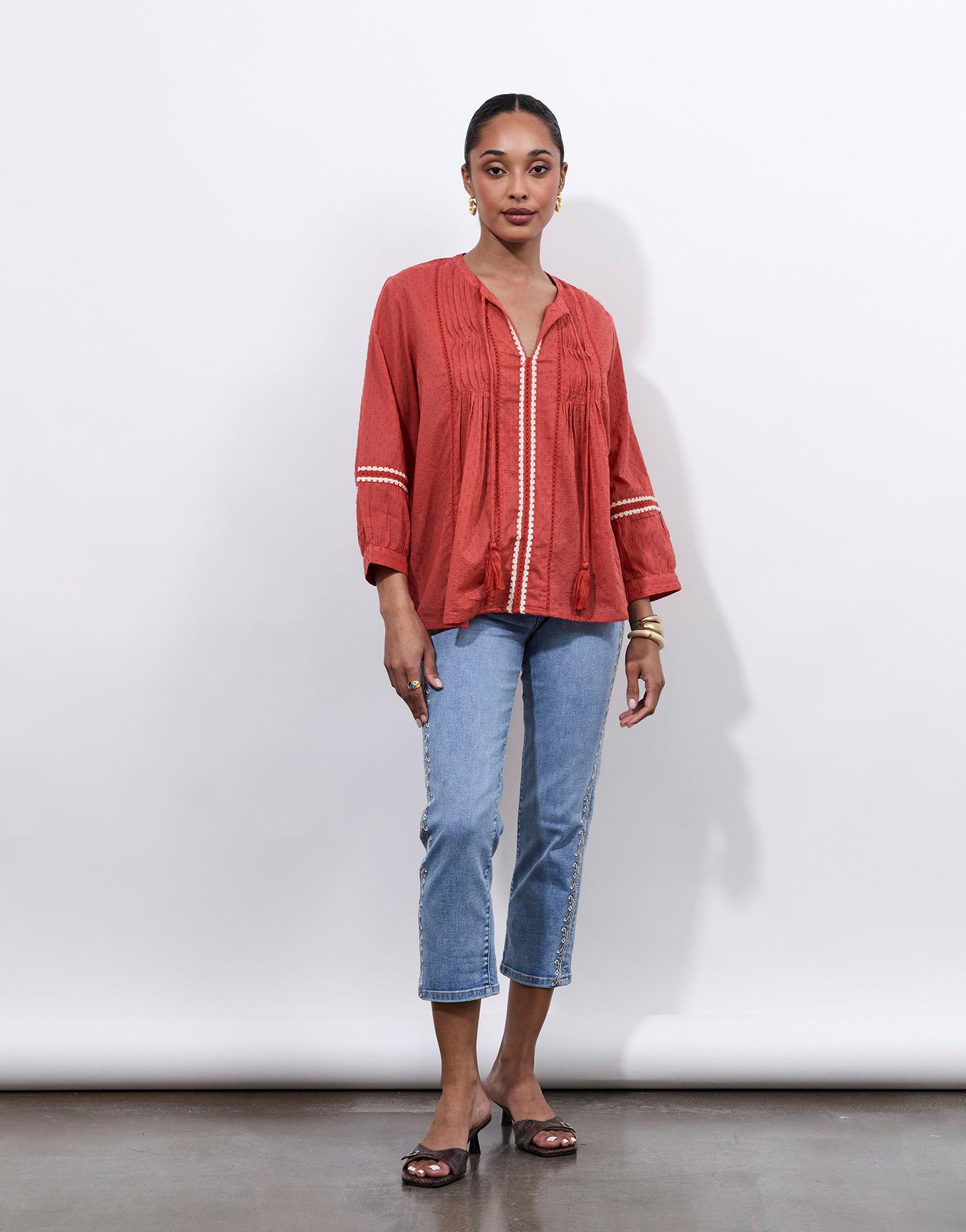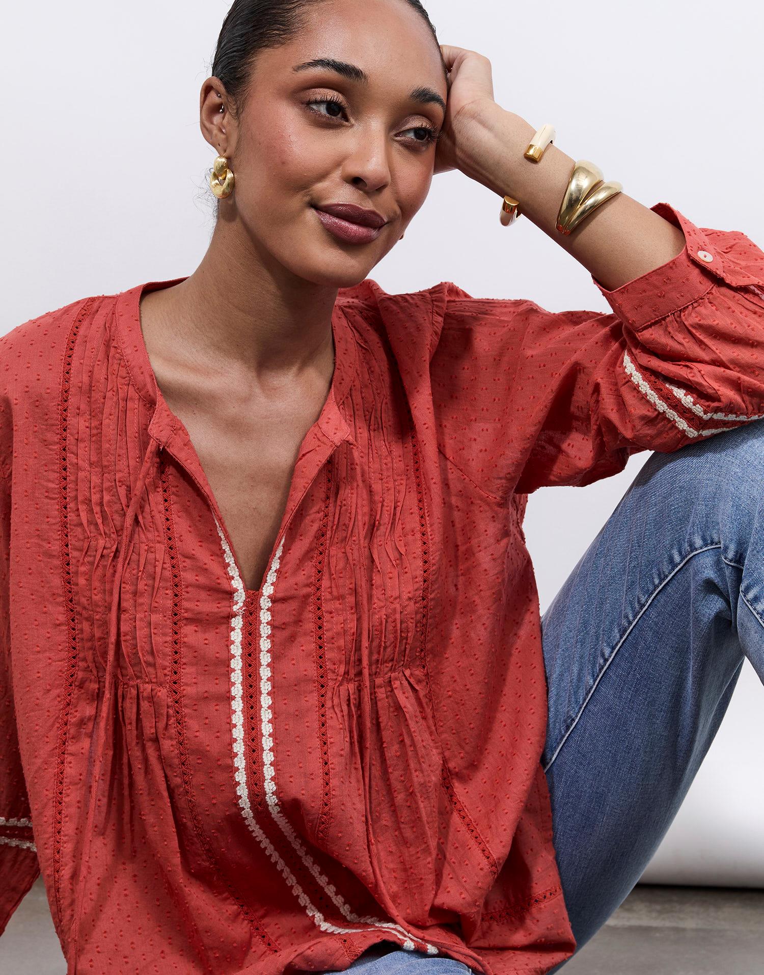 Détails produit : Blouse manches 3/4 unie, decolleté en V, gansé de dentelles et manches 3/4. Couleur : TOMETTE