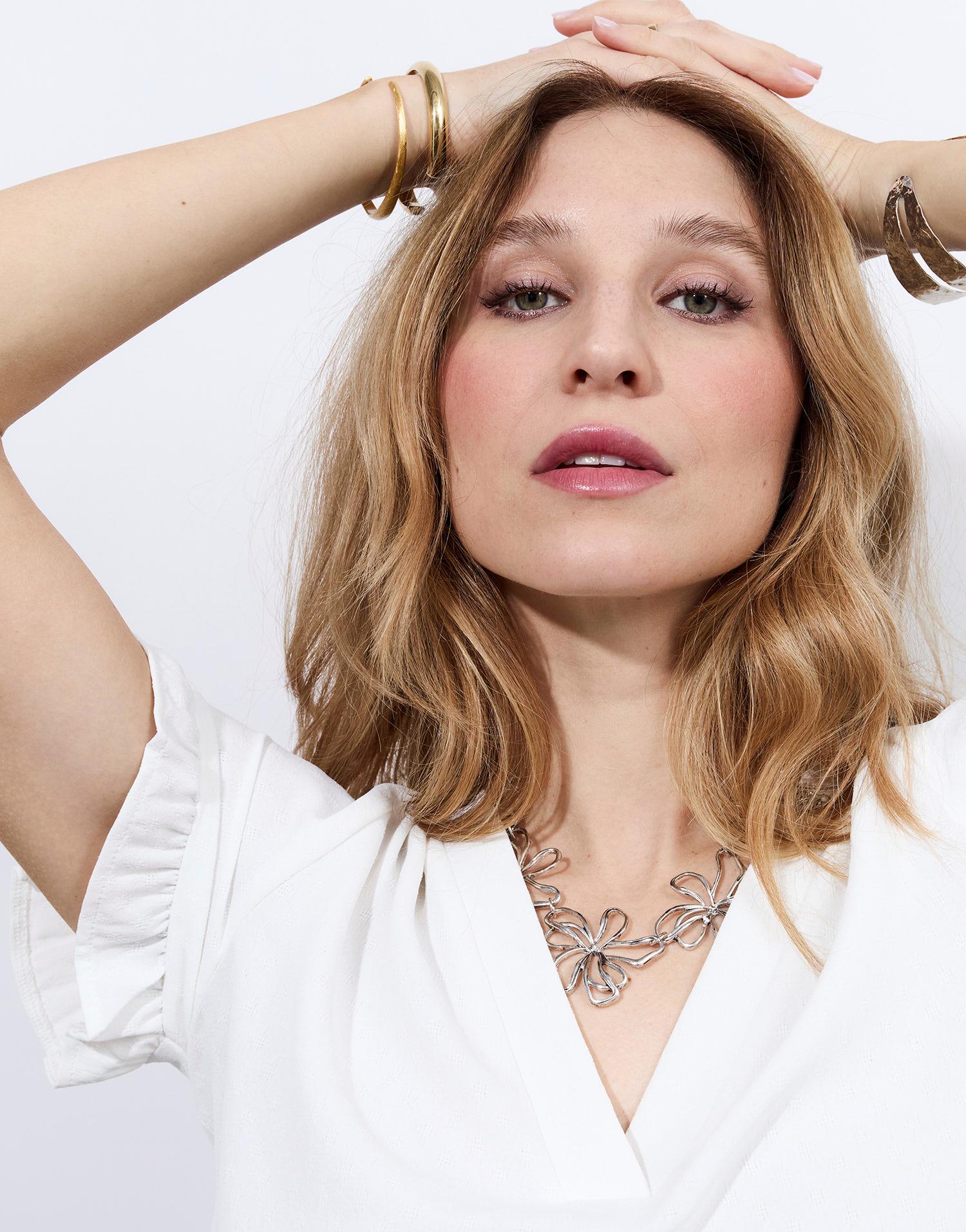 Blouse unie à la coupe fluide, idéale pour une silhouette élégante et facile à porter. Son encolure en V met délicatement en valeur le décolleté tandis que ses manches courtes à volants apportent une touche féminine et légère. Une pièce polyvalente qui s’associe facilement à tous les styles. La mannequin fait 1m75 et porte une taille 38.