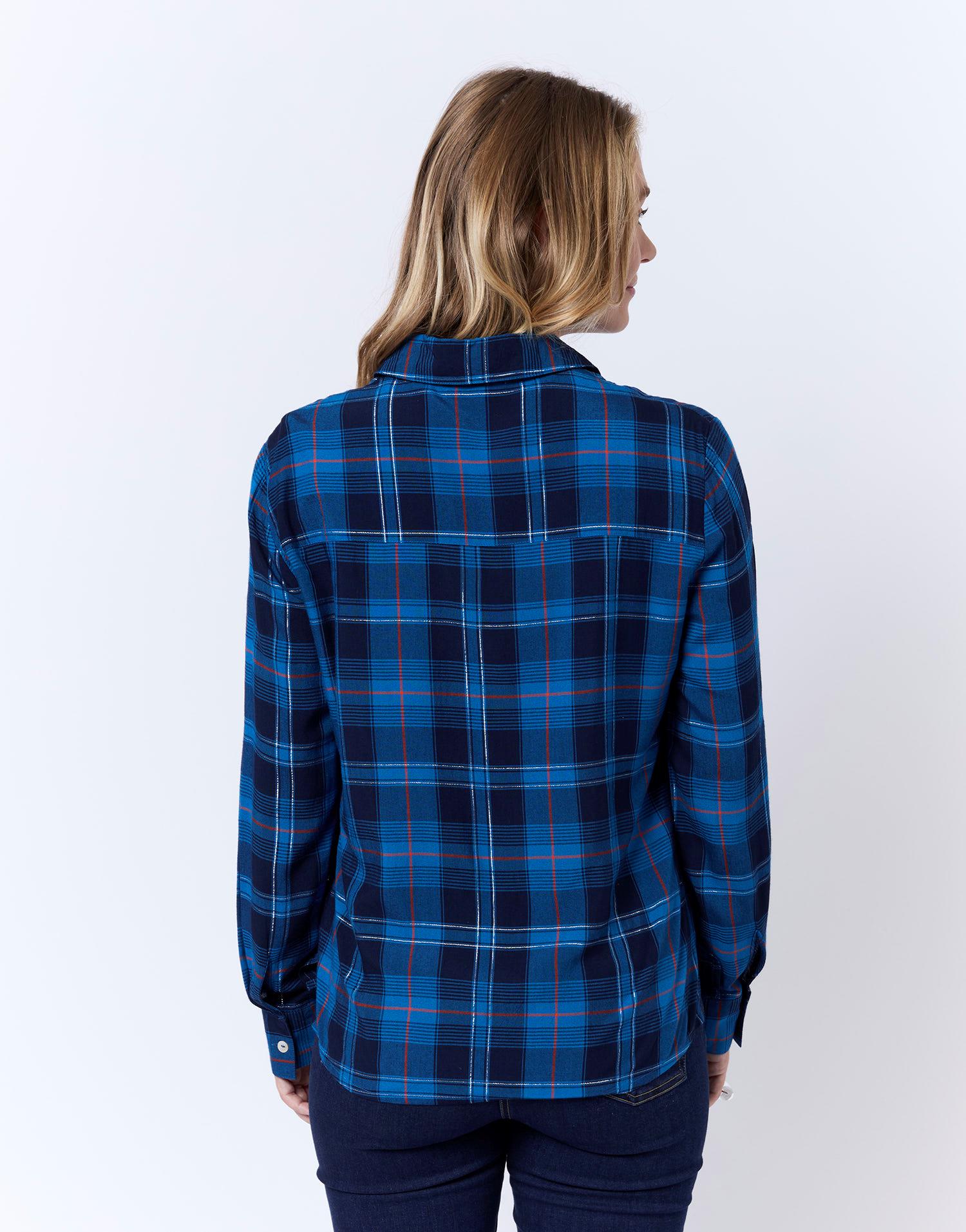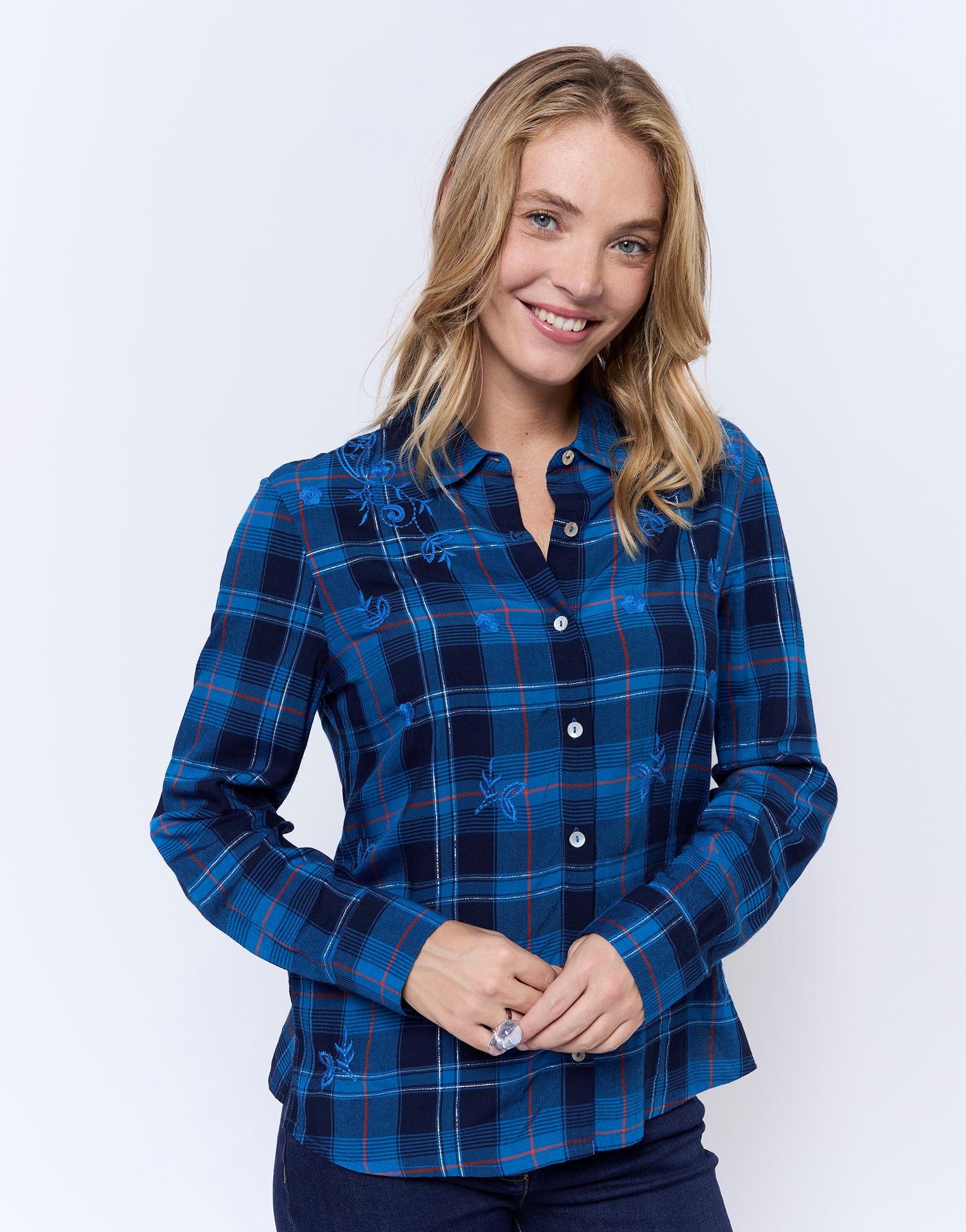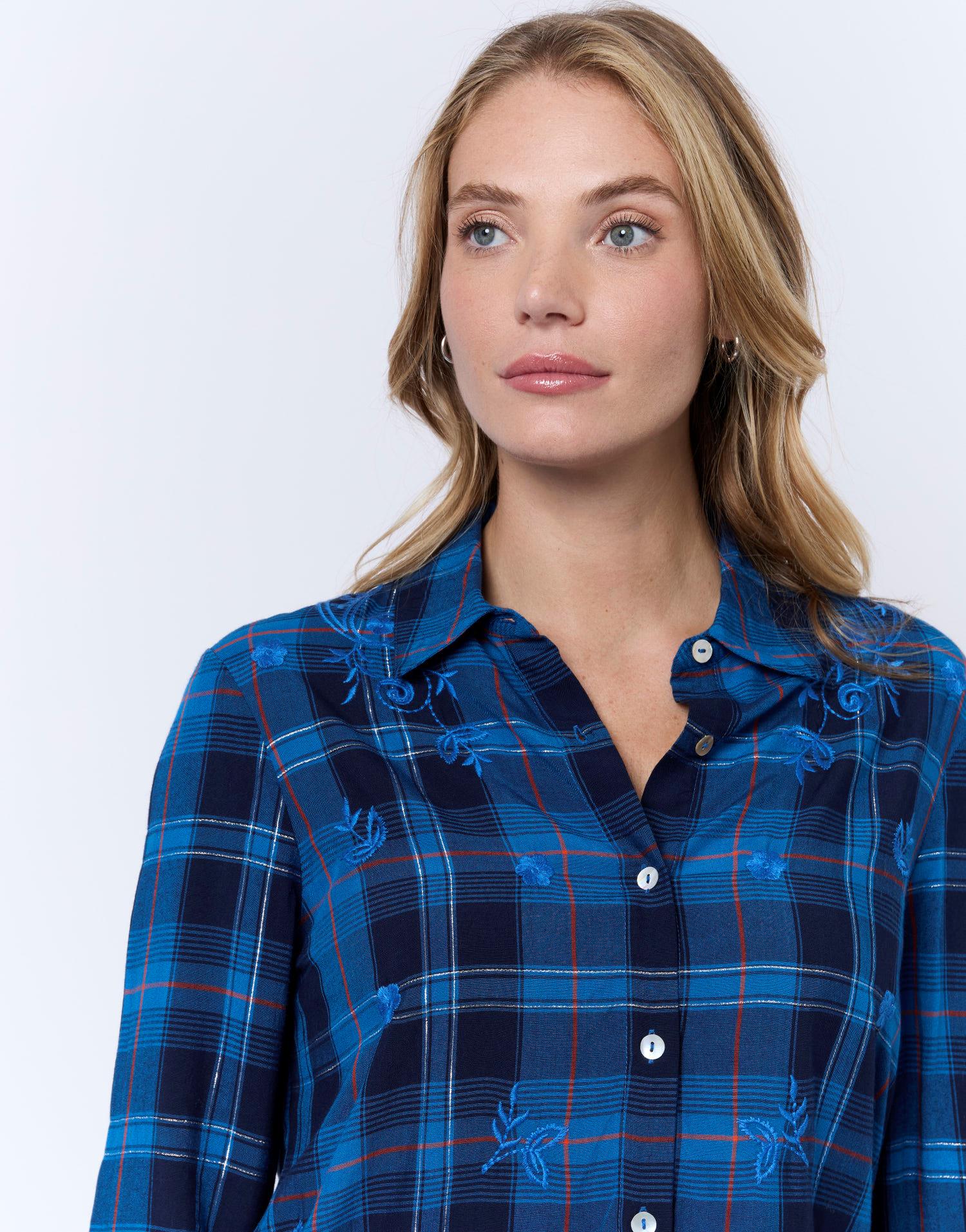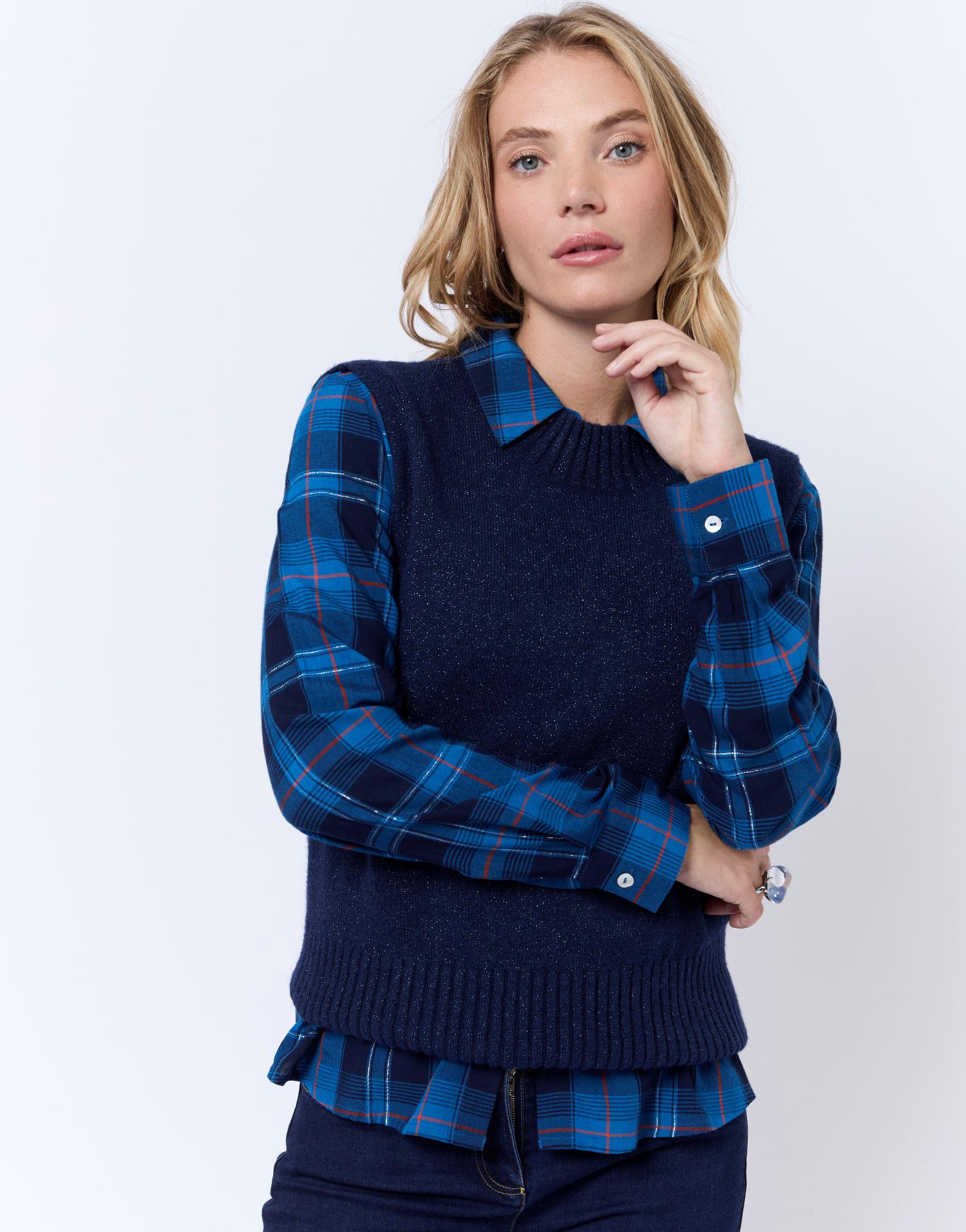 Détails produit : Chemisier manches longues à carreaux, col chemisier, avec lurex et manches longues. Couleur : MARINE