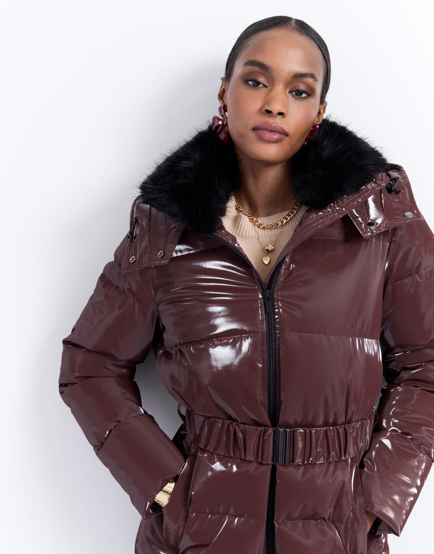 Détails produit : Doudoune longue unie, col fausse fourrure. Couleur : BORDEAUX