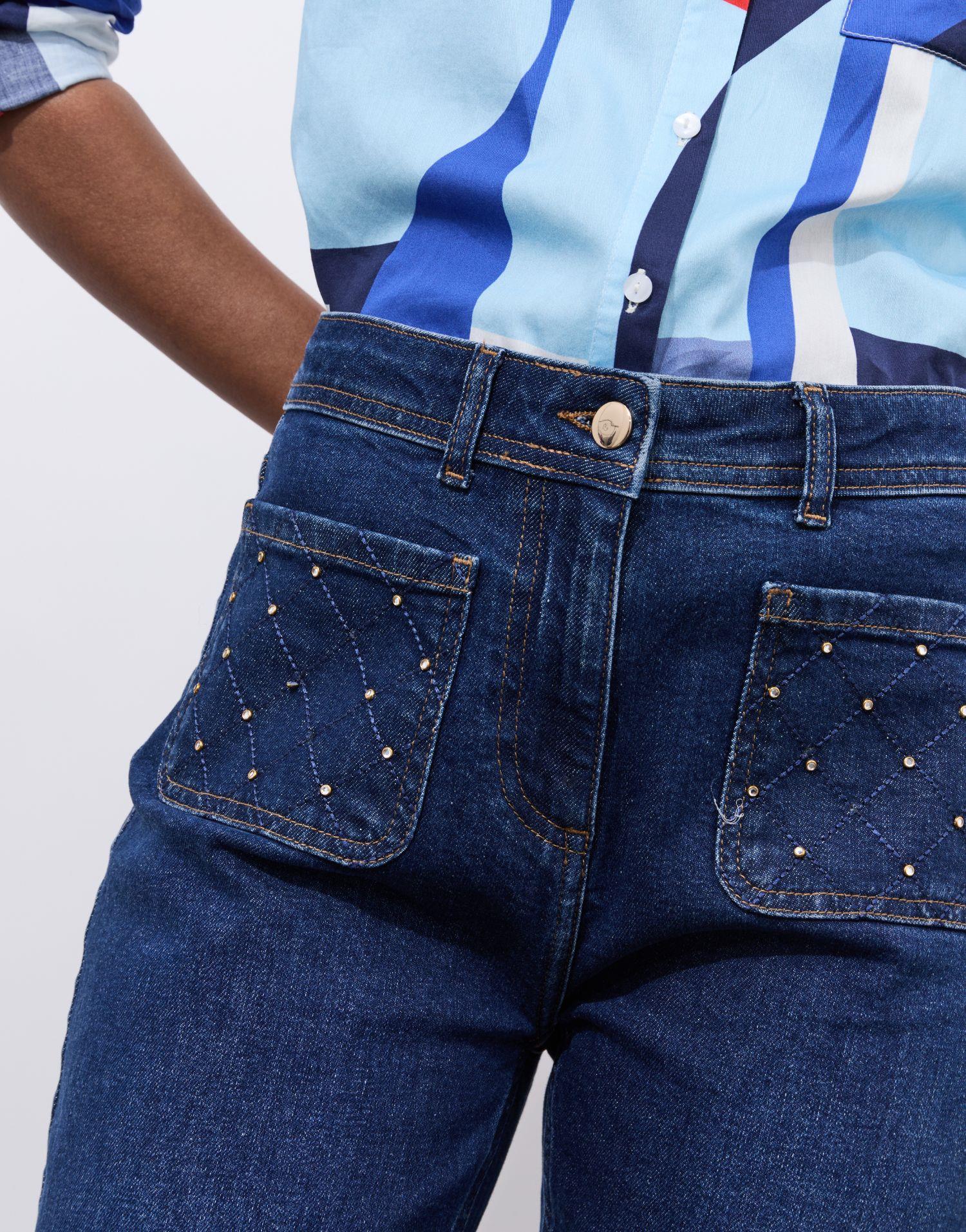 Détails produit : Jean long bootcut, bootcut, poches plaquées sur le devant et avec strass. Couleur : MARINE