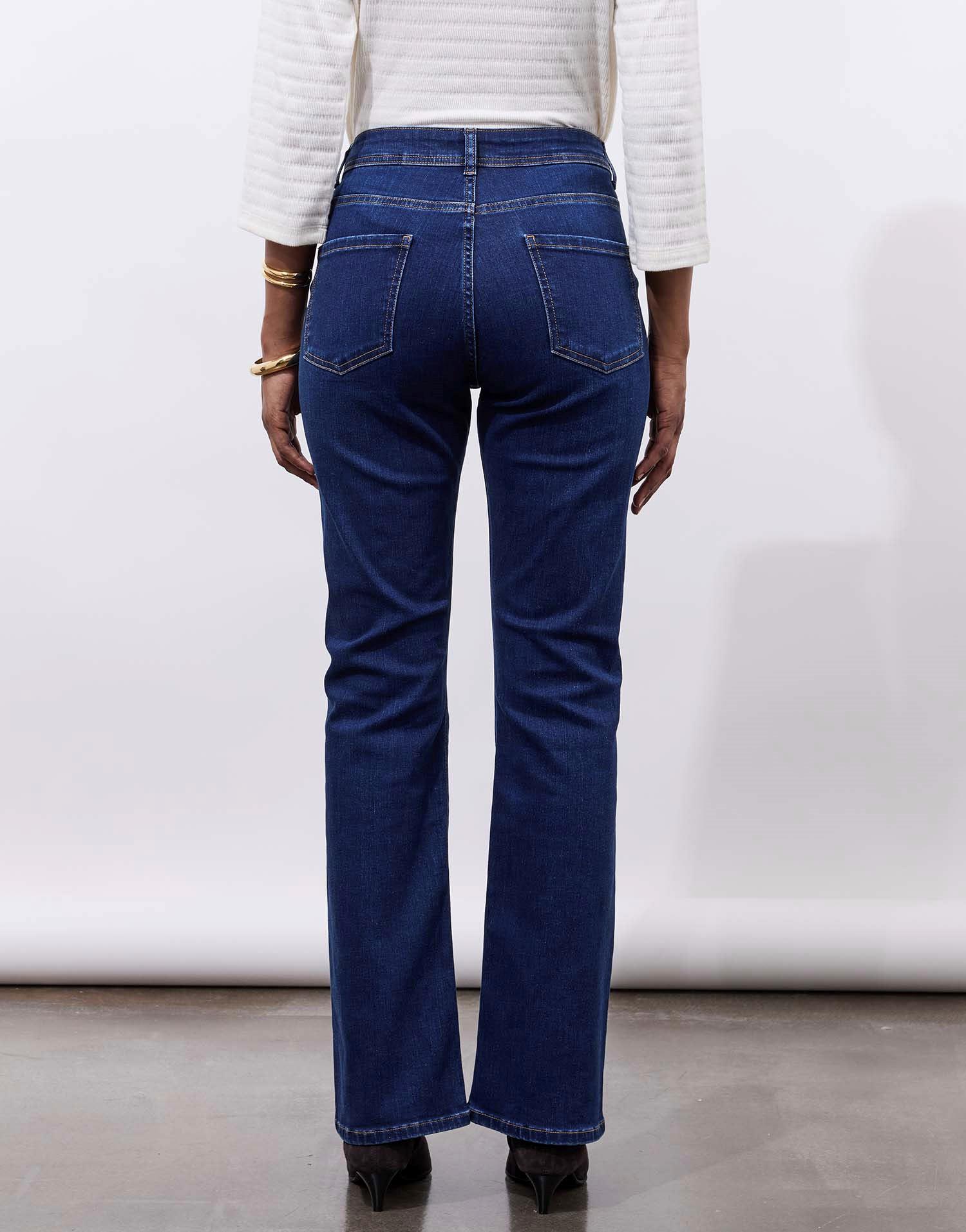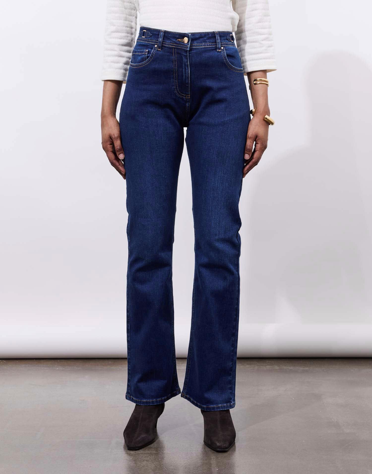Jean à la coupe bootcut, conçu pour allonger la silhouette. Sa taille haute structure la ligne, tandis que les cinq poches apportent une touche classique et fonctionnelle. Un essentiel facile à associer, aussi bien au quotidien qu’en tenue plus habillée.La mannequin mesure 1m75 et porte une taille 38.