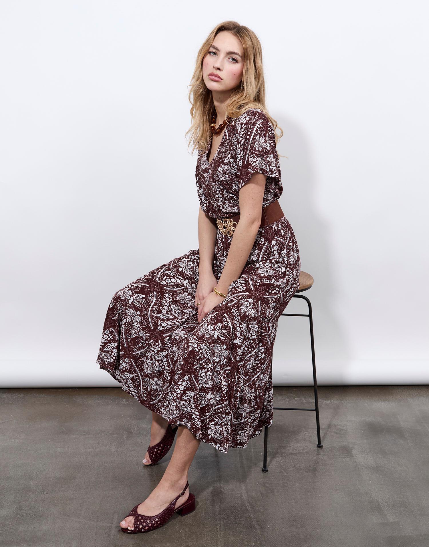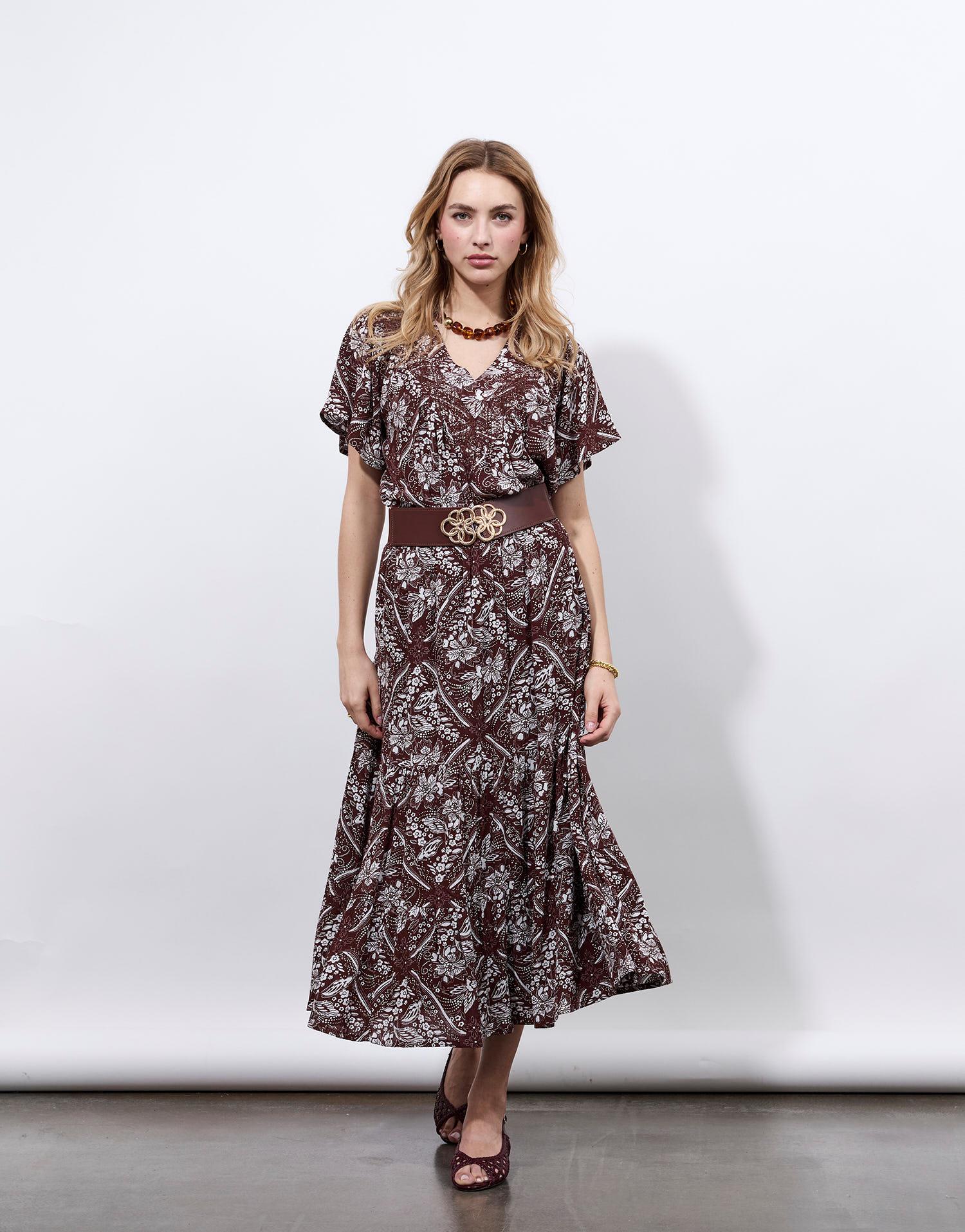 Détails produit : Jupe midi imprimé à fleurs. Couleur : MARRON