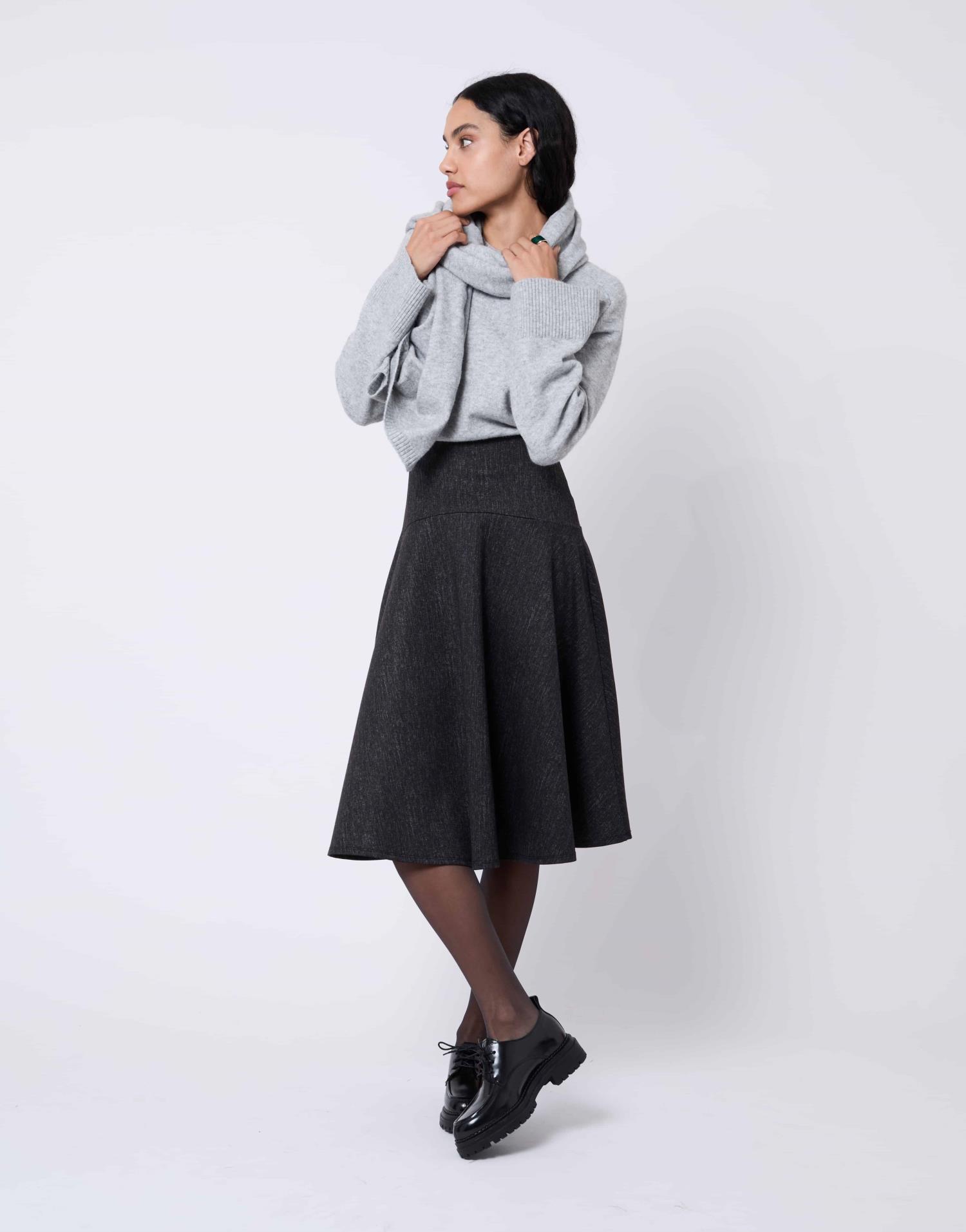 Détails produit : Jupe midi unie, fermeture zip sur le côté, taille standard, empiècements fantaisie et non doublée. Couleur : NOIR