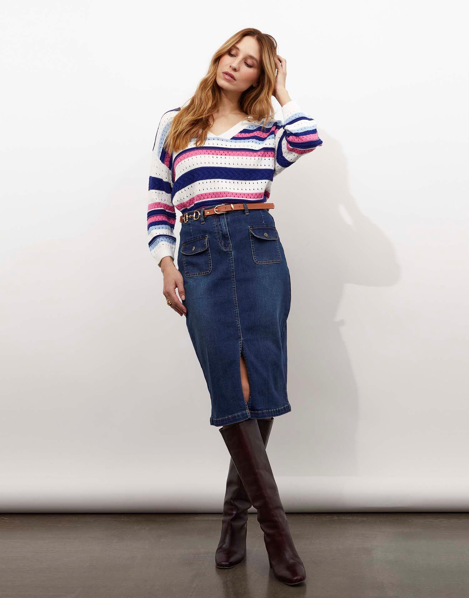 Jupe midi en denim à la coupe droite, idéale pour une silhouette moderne et structurée. Dotée de poches plaquées à rabat sur le devant et d’une fermeture boutonnée, elle est complétée par une fente frontale qui apporte aisance et féminité au mouvement. Une pièce casual et intemporelle, facile à associer avec un pull ou une chemise pour un look du quotid