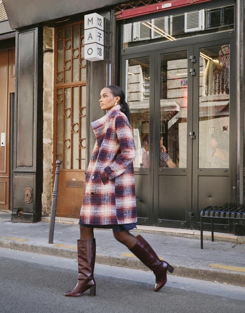 On adore le manteau à carreaux à la coupe droite, col montant et boutonnage sur le devant pour une allure classique et élégante. Chaleureux et stylé, il complète vos tenues avec sophistication. Bineta mesure 1m75 et porte une taille 38.