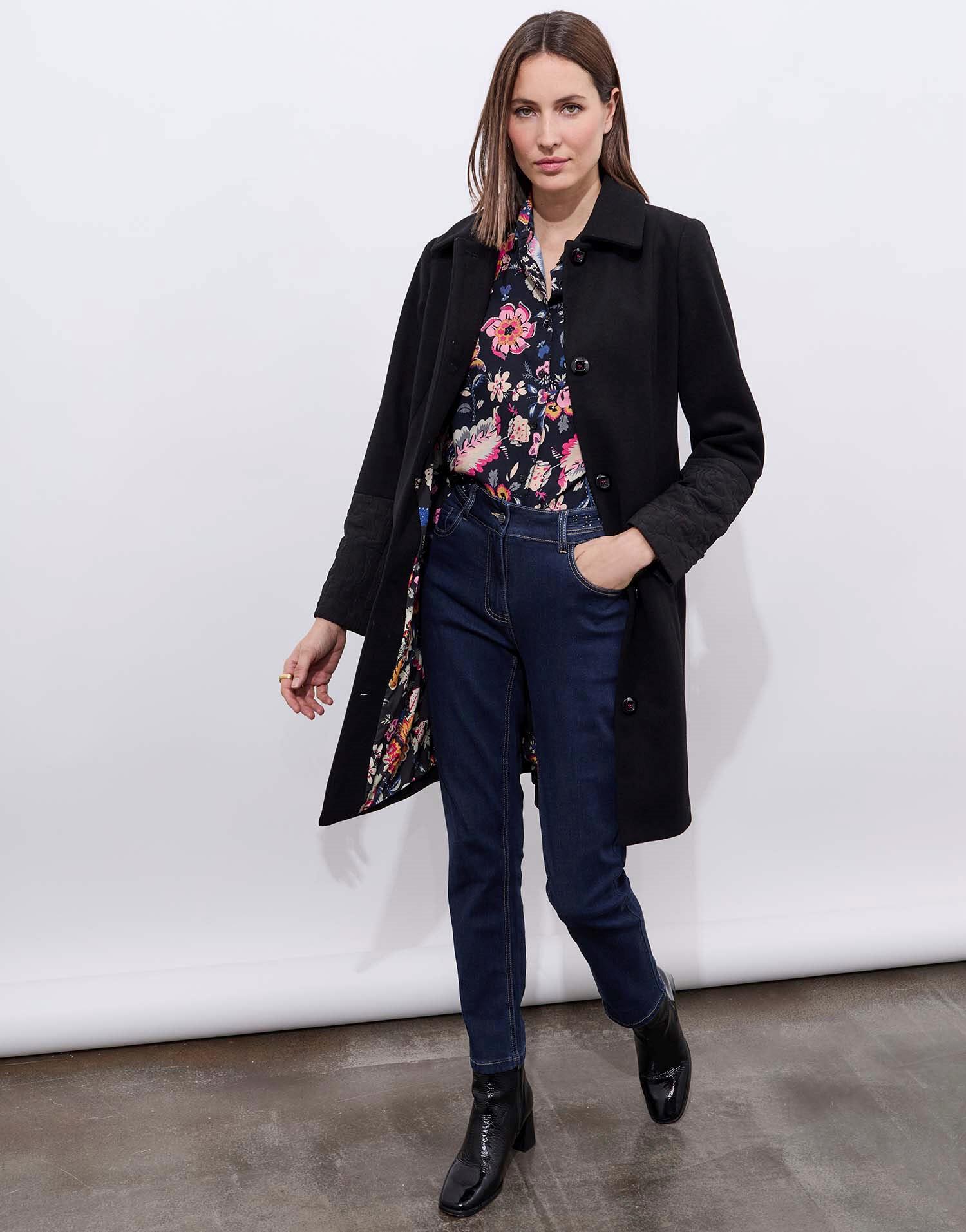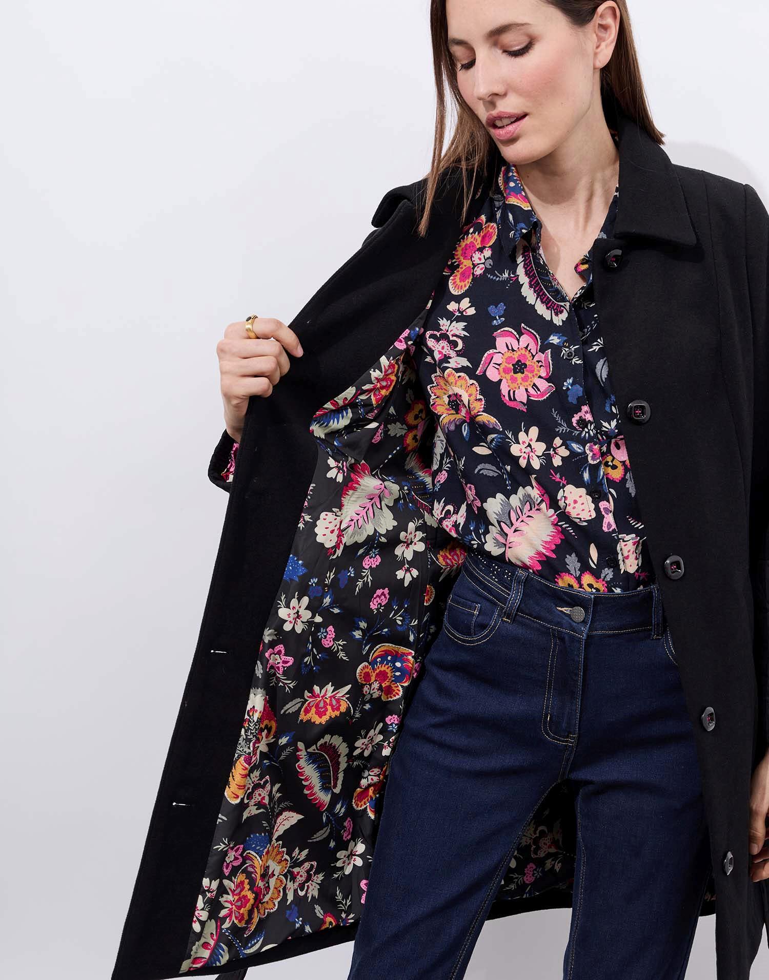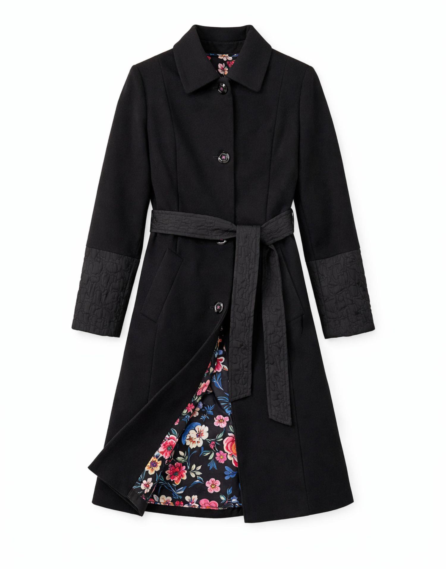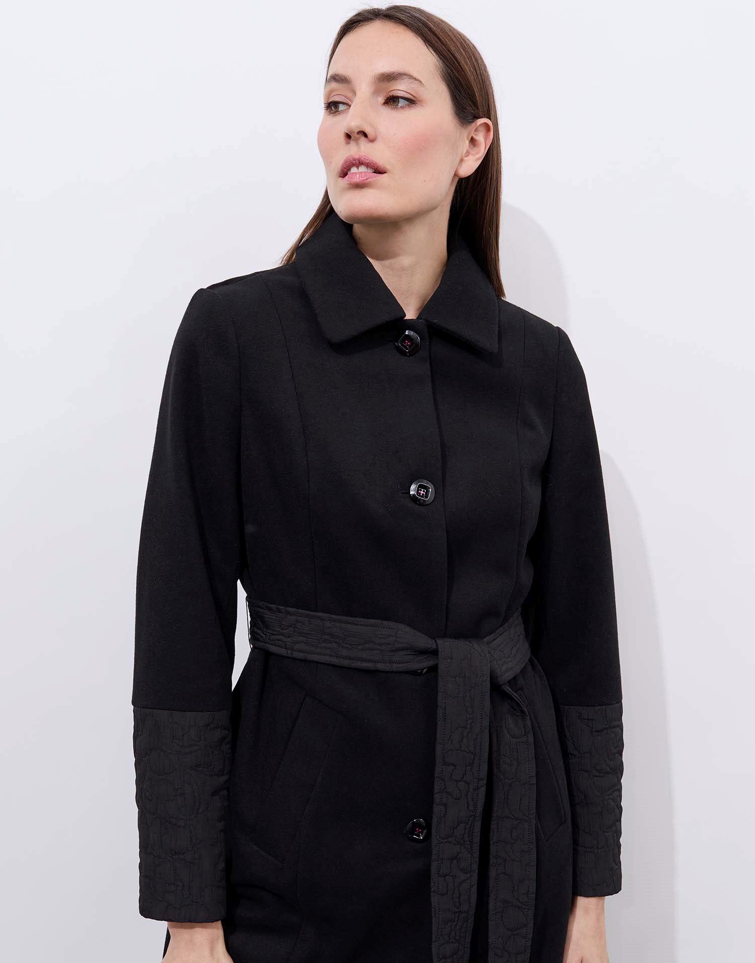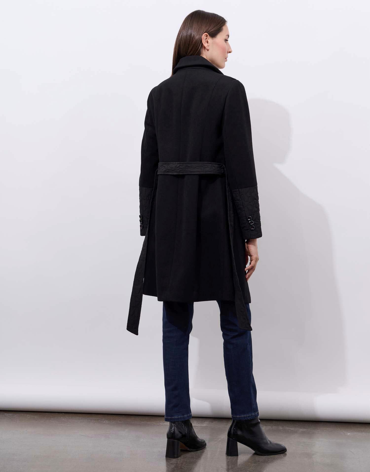 Détails produit : Manteau bi-matière uni, forme droite, Col simple, manches longues, détail bi matière et doublure fantaisie. Couleur : NOIR