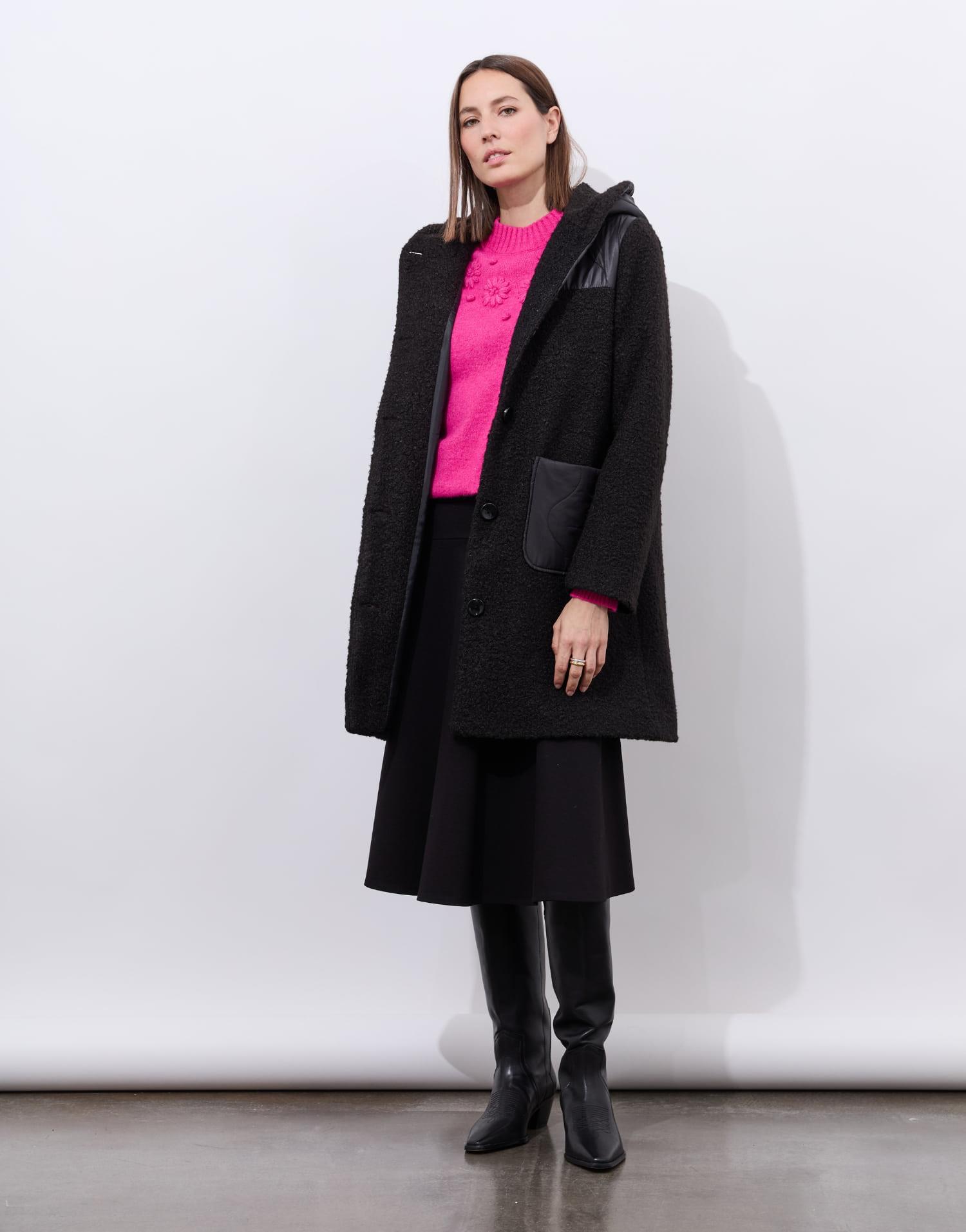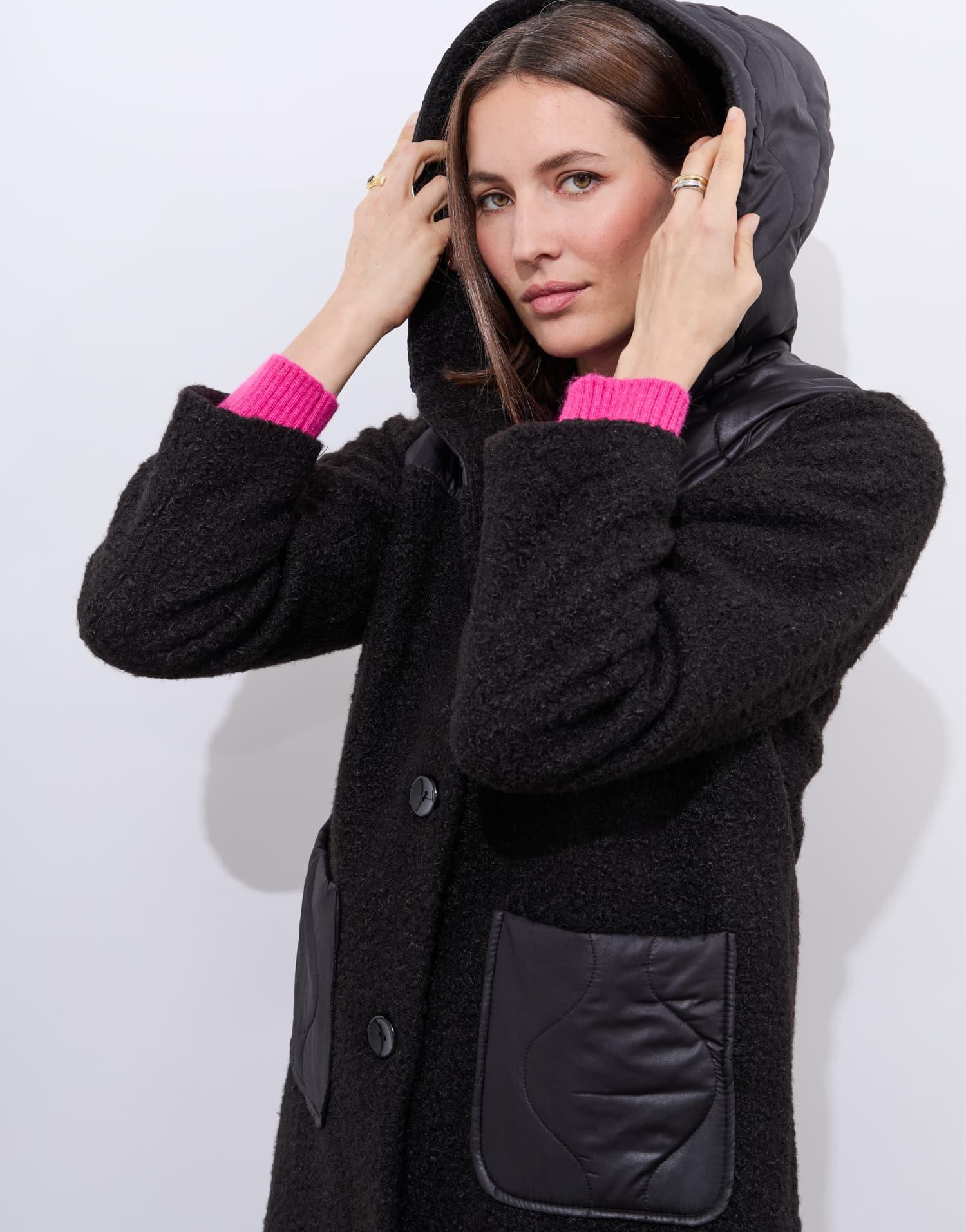 Détails produit : Manteau bi-matière uni, col capuche. Couleur : NOIR