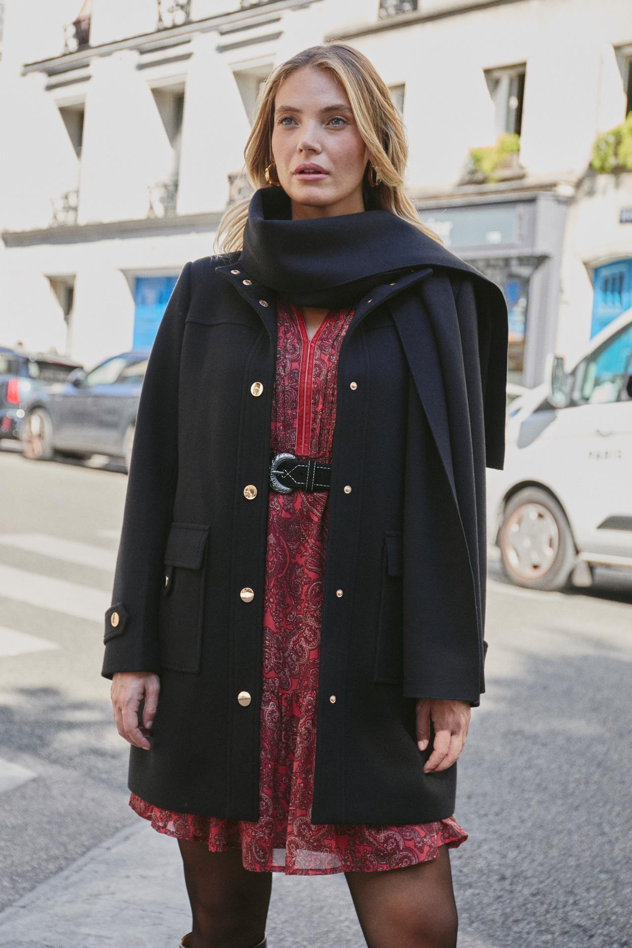 Ce manteau droit séduit par son élégance sobre et raffinée. Son col officier s’accompagne d’une écharpe amovible pour varier les styles. Ses boutons dorés et ses poches plaquées structurent la silhouette. Une pièce chic et pratique. Manon mesure 1m75 et porte une taille 38.
