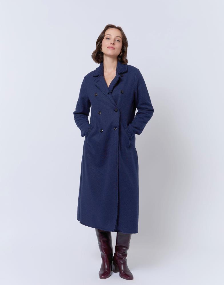 Détails produit : Redingote longue unie, Col simple. Couleur : MARINE