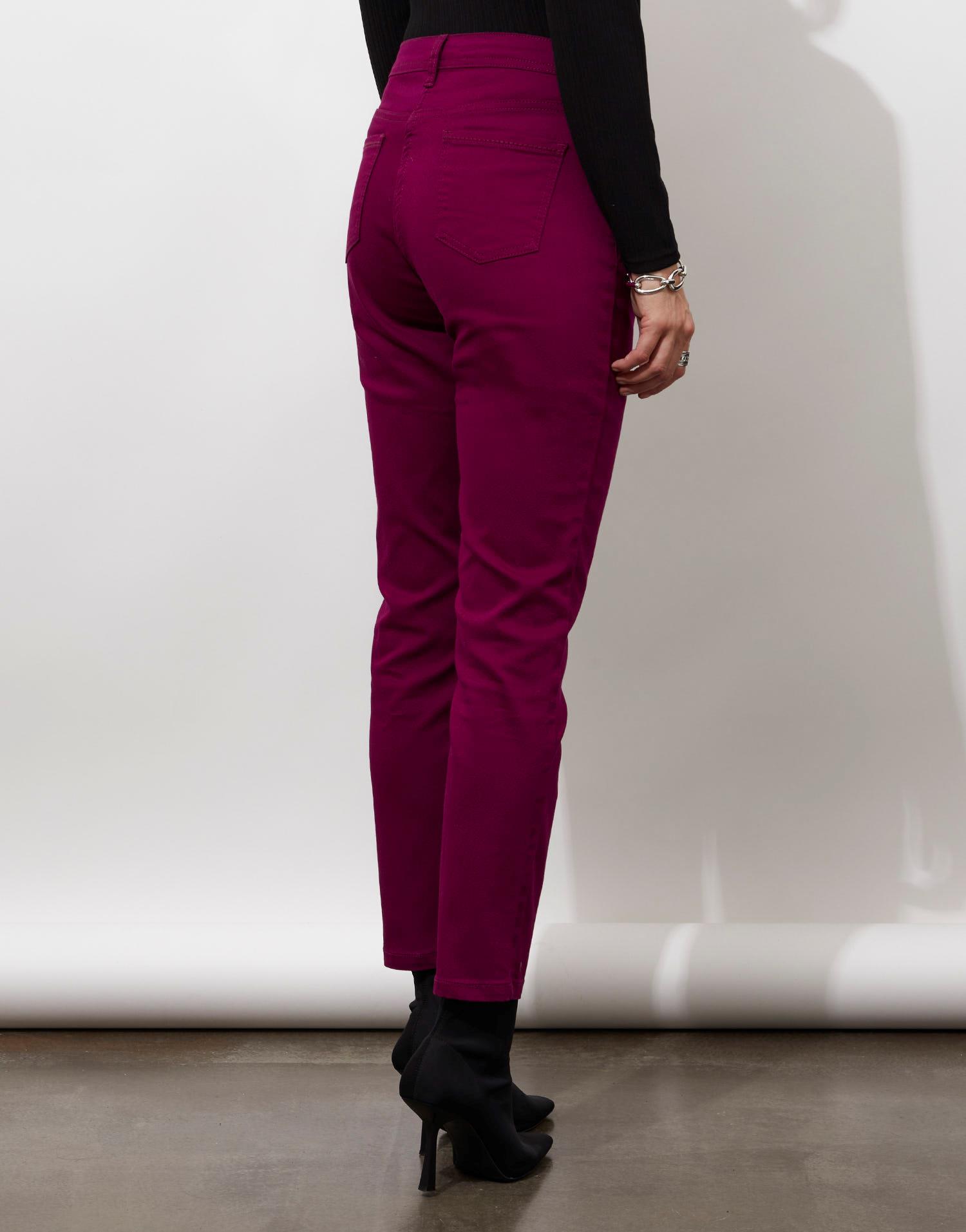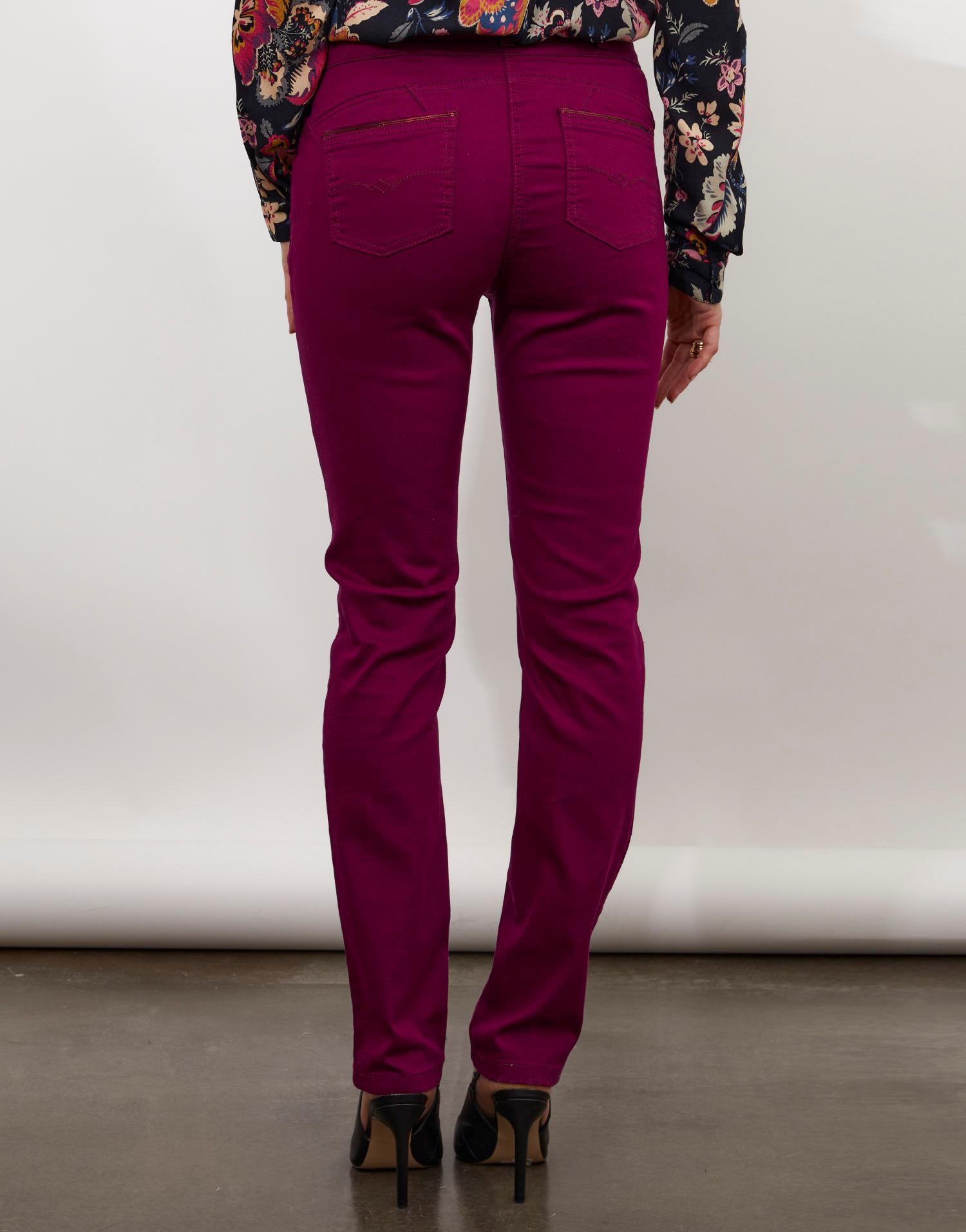 Détails produit : Pantalon 7/8 slim uni, slim, 5 poches et broderies. Couleur : AUBERGINE