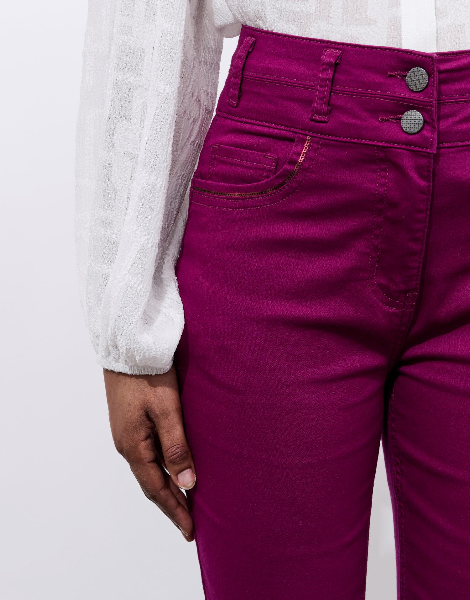 Détails produit : Pantalon 7/8 slim uni, slim et sequins. Couleur : AUBERGINE