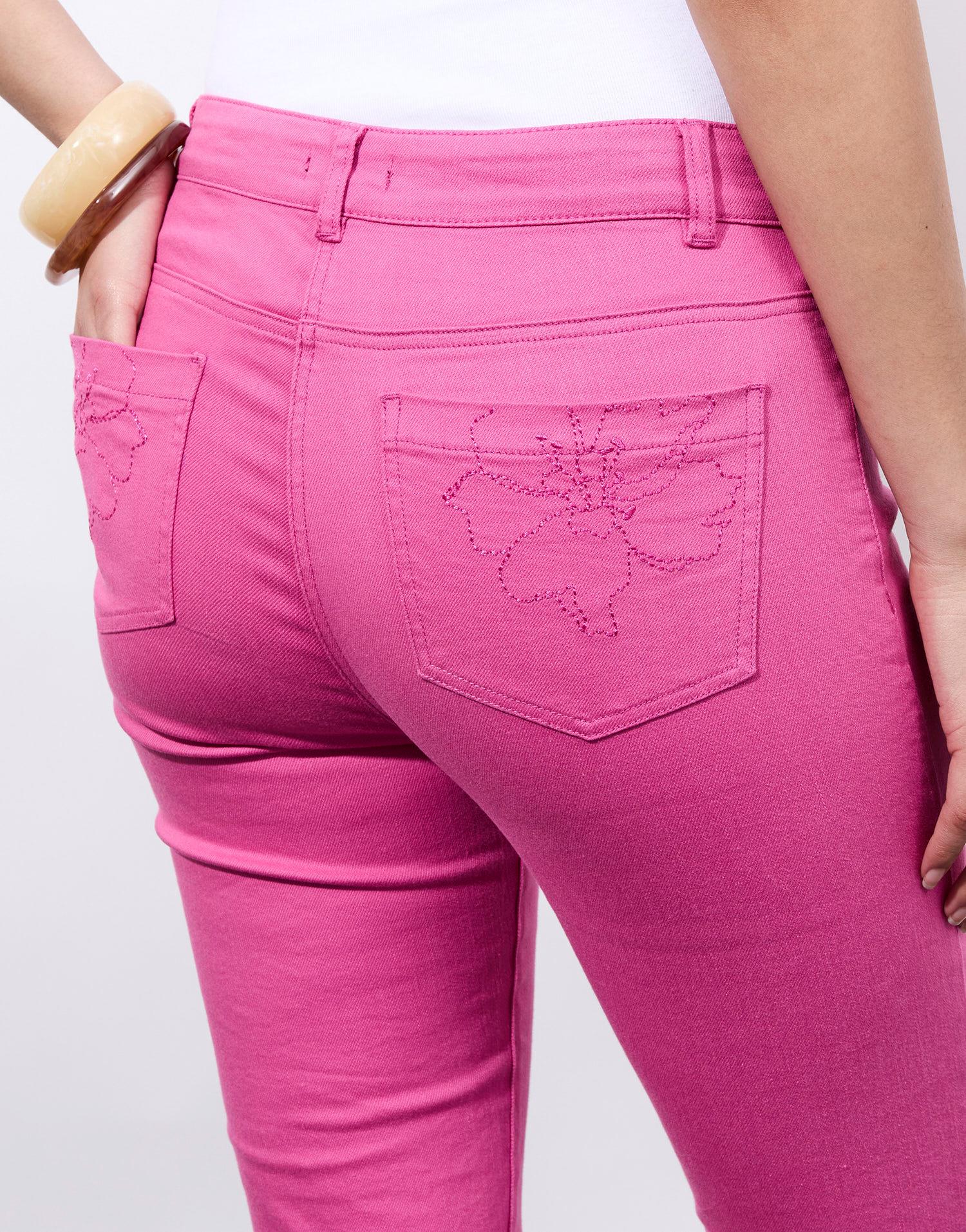 Détails produit : Pantalon 7/8 slim uni, slim, 5 poches et broderies. Couleur : FUCHSIA