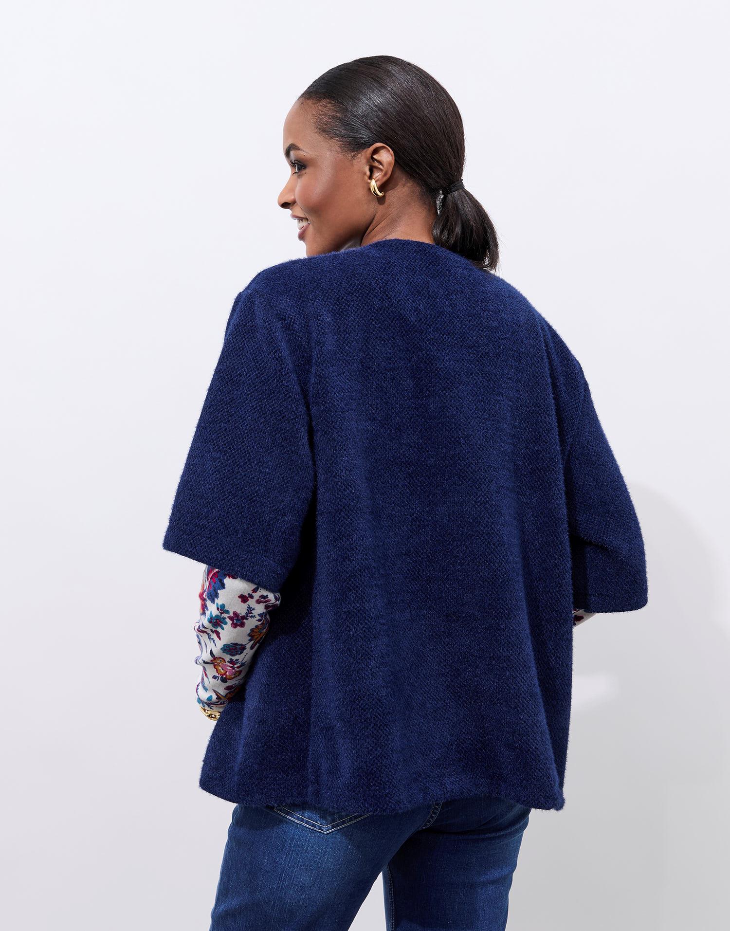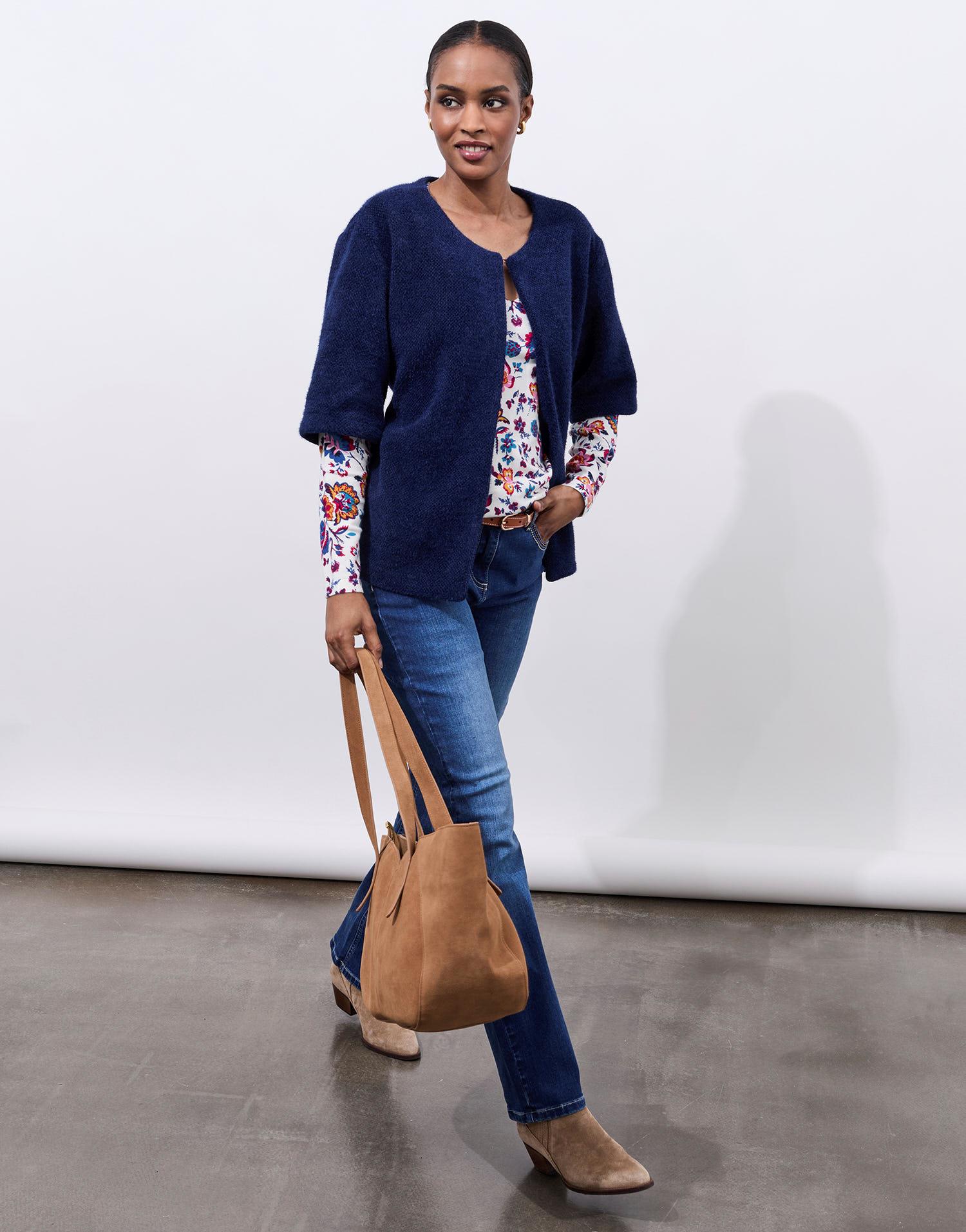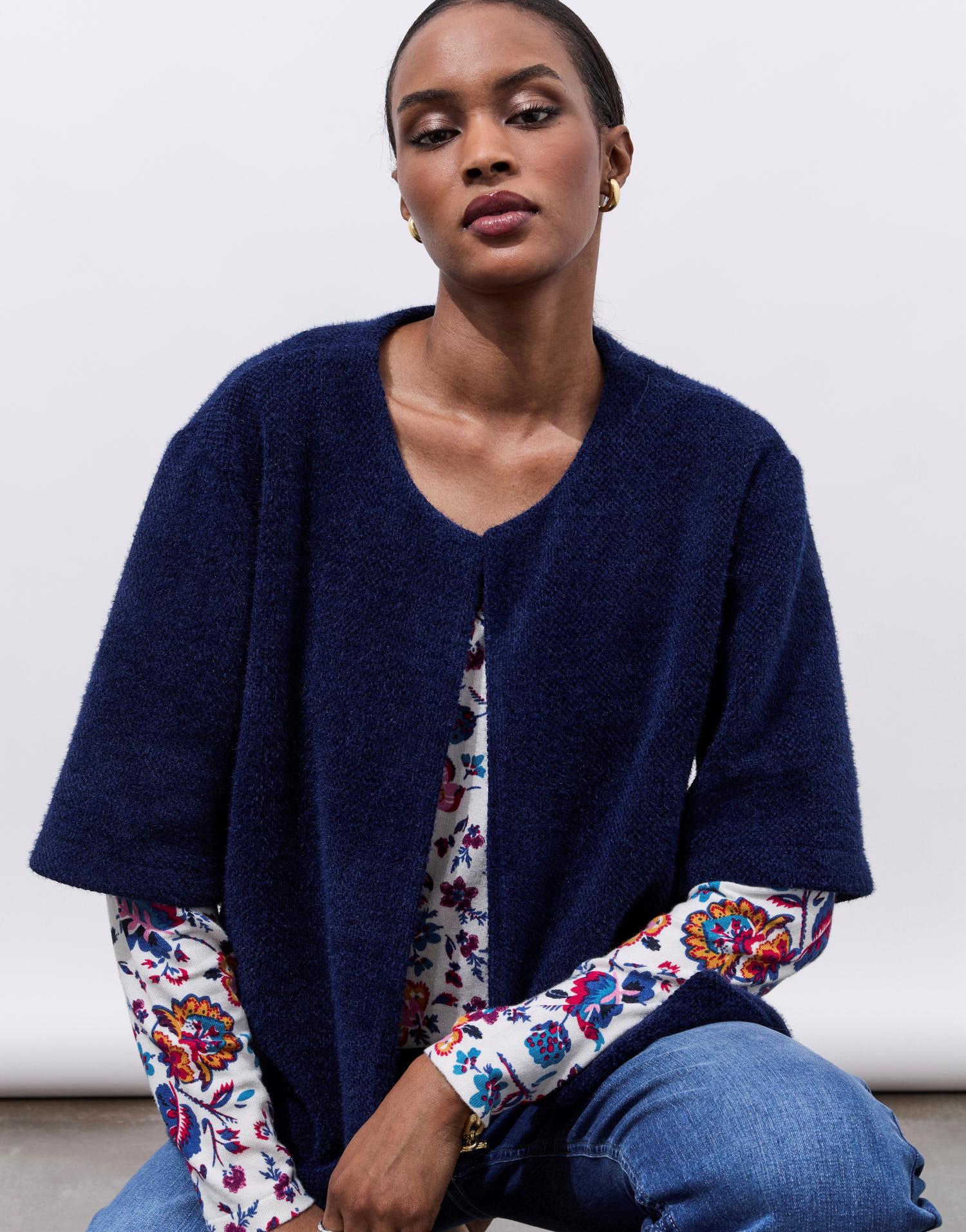 Détails produit : Gilet uni, fermeture par crochets, encolure arrondie et manches 3/4. Couleur : MARINE