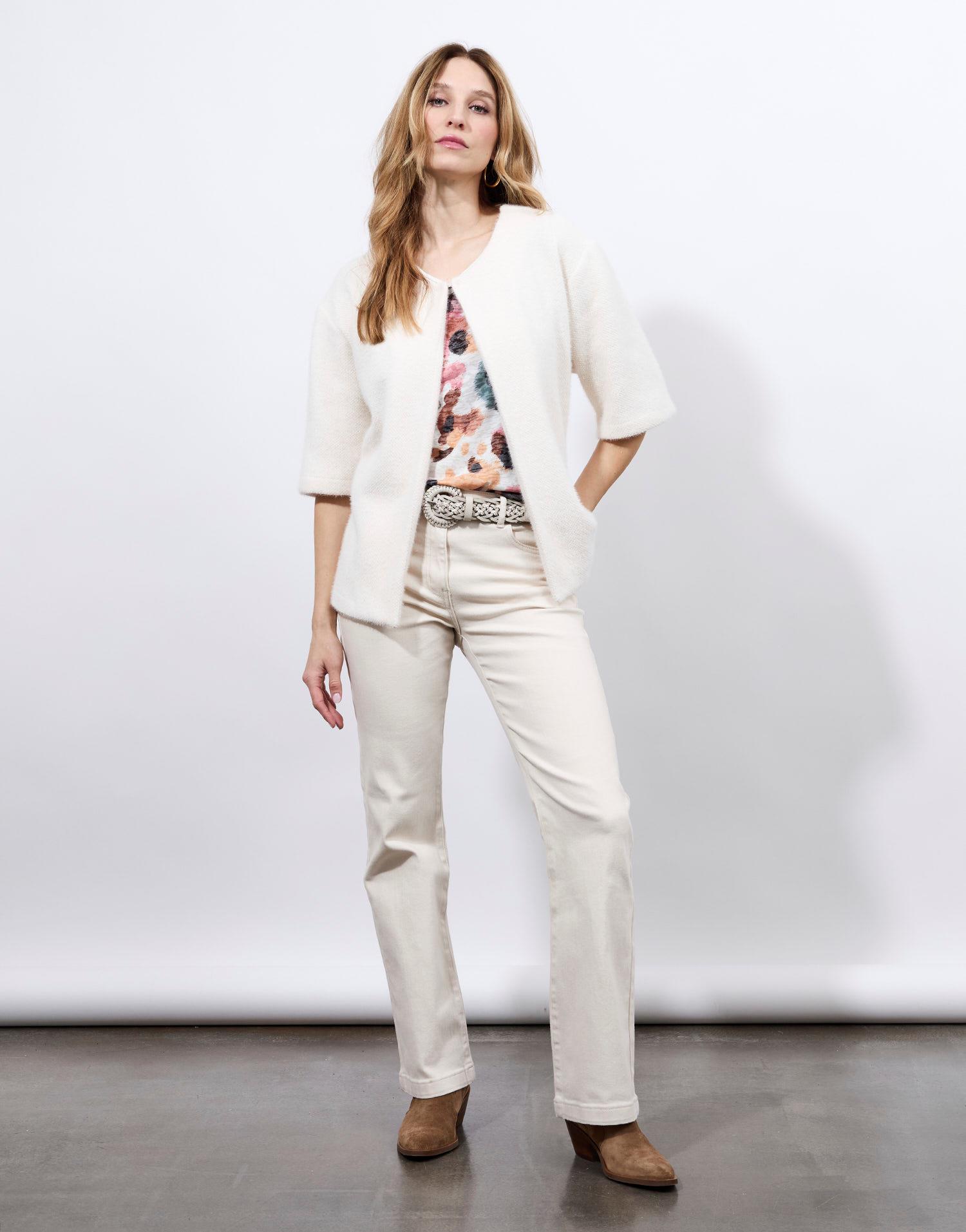 Détails produit : Gilet uni, fermeture par crochets, encolure arrondie et manches 3/4. Couleur : BEIGE