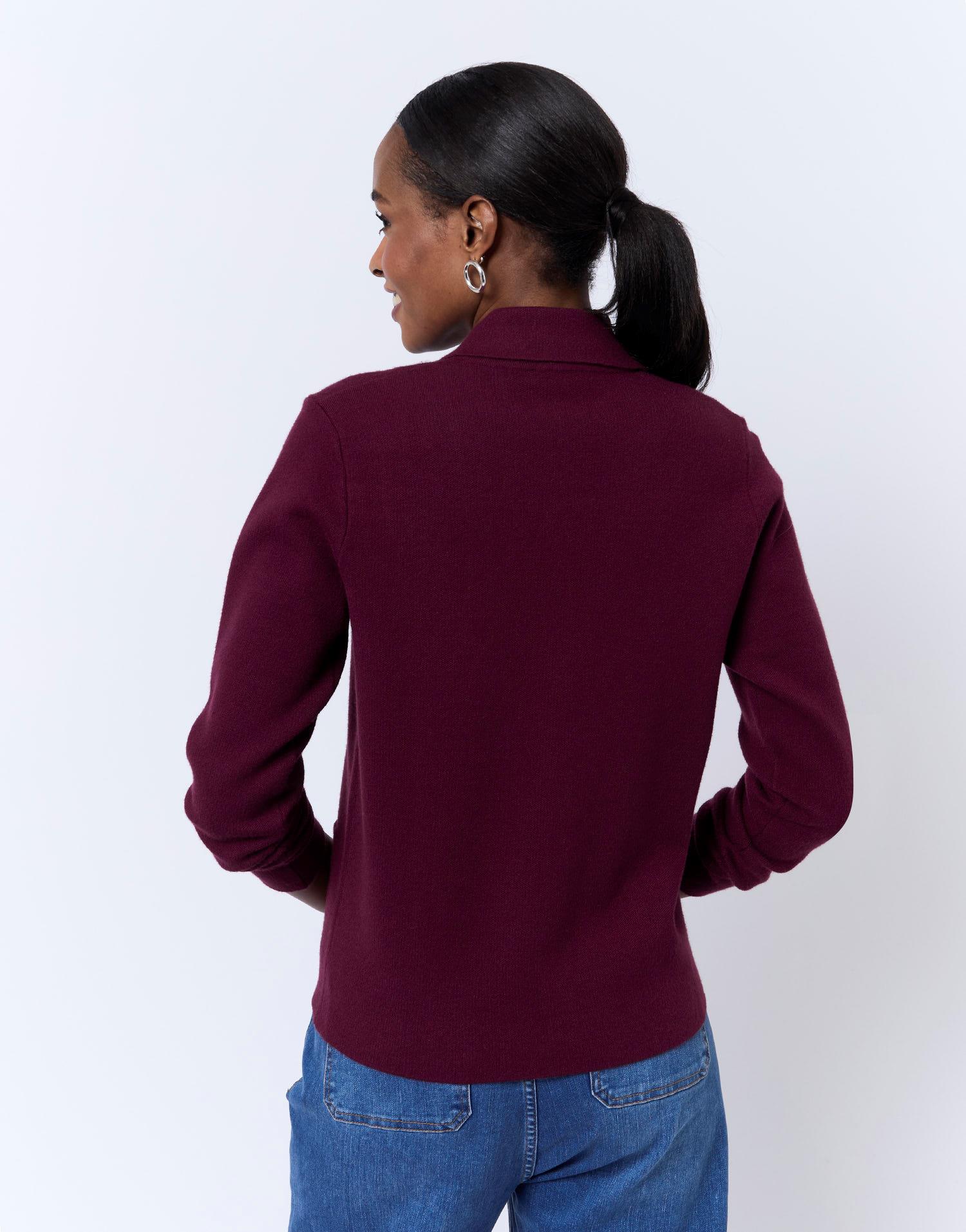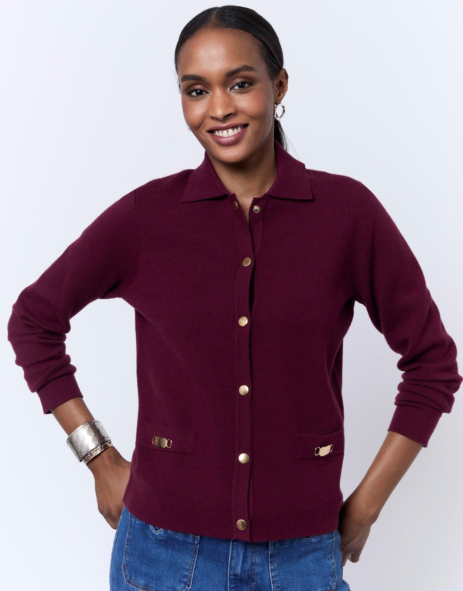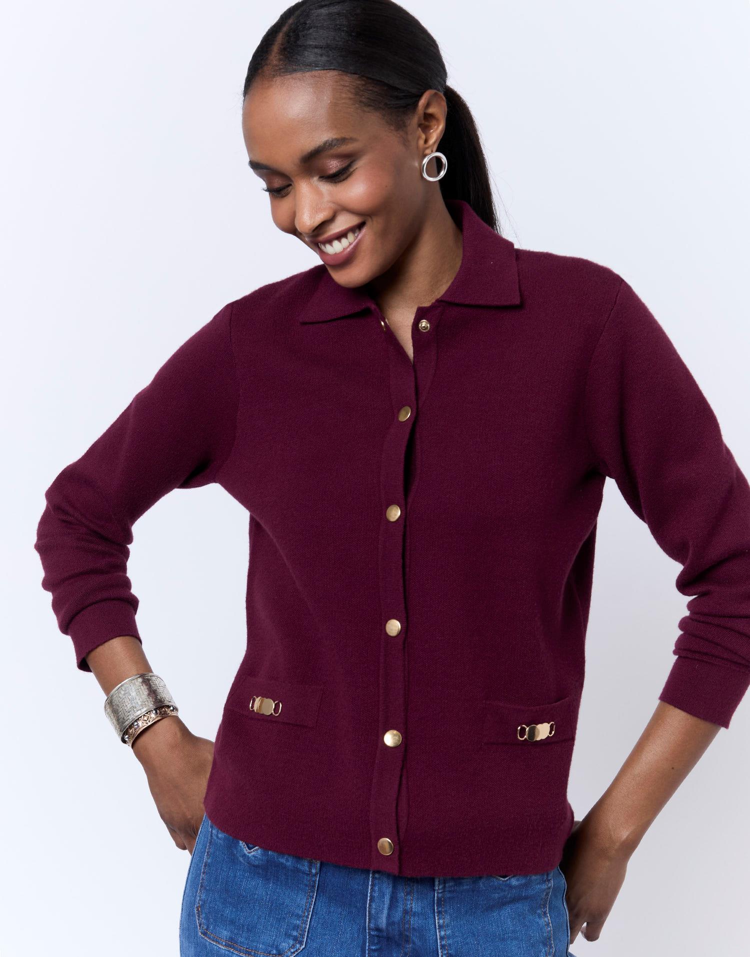 Détails produit : Gilet uni, fermeture boutons pression, Col Polo et manches longues. Couleur : BORDEAUX