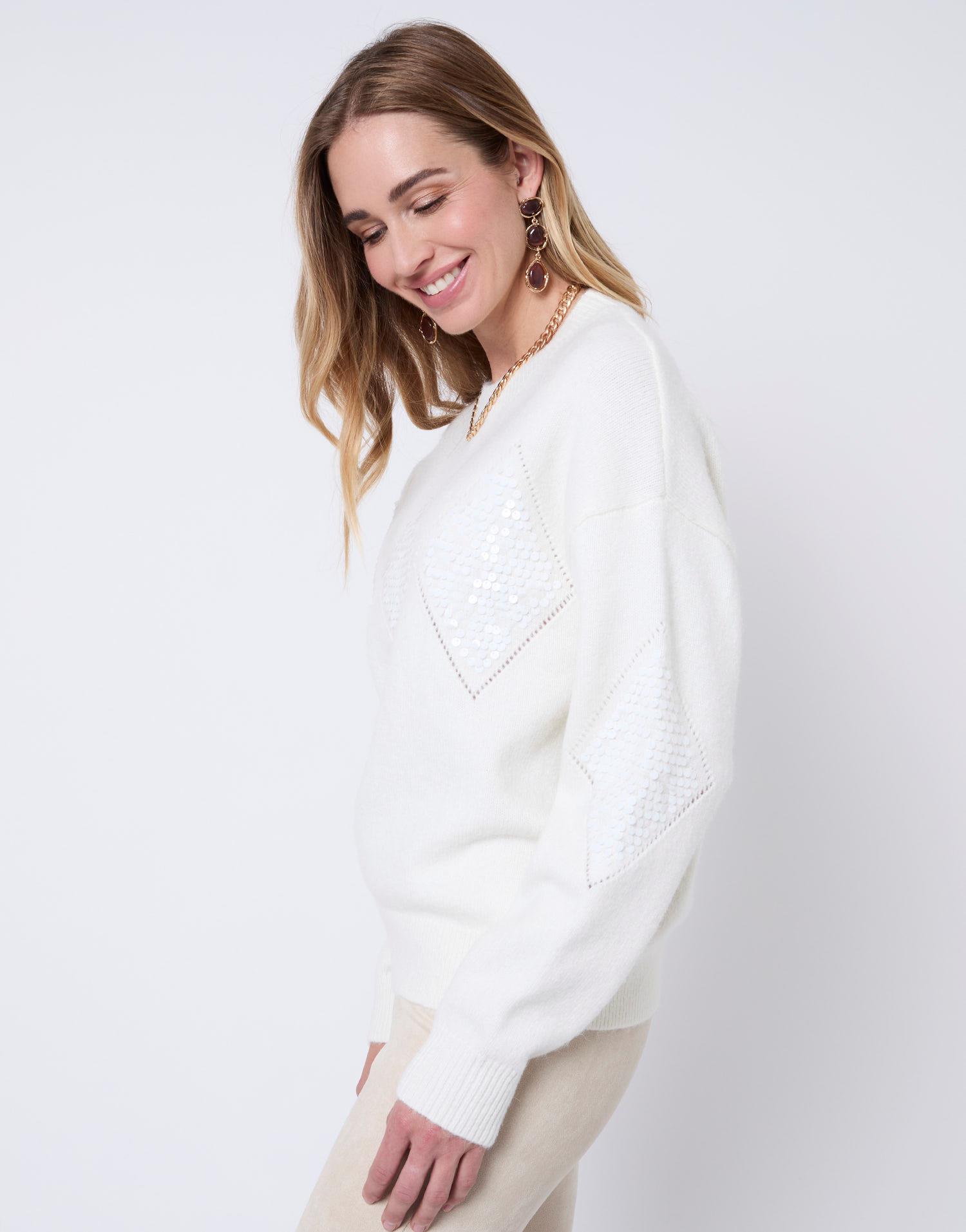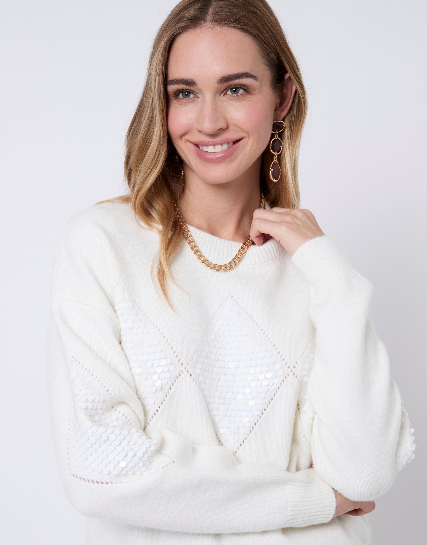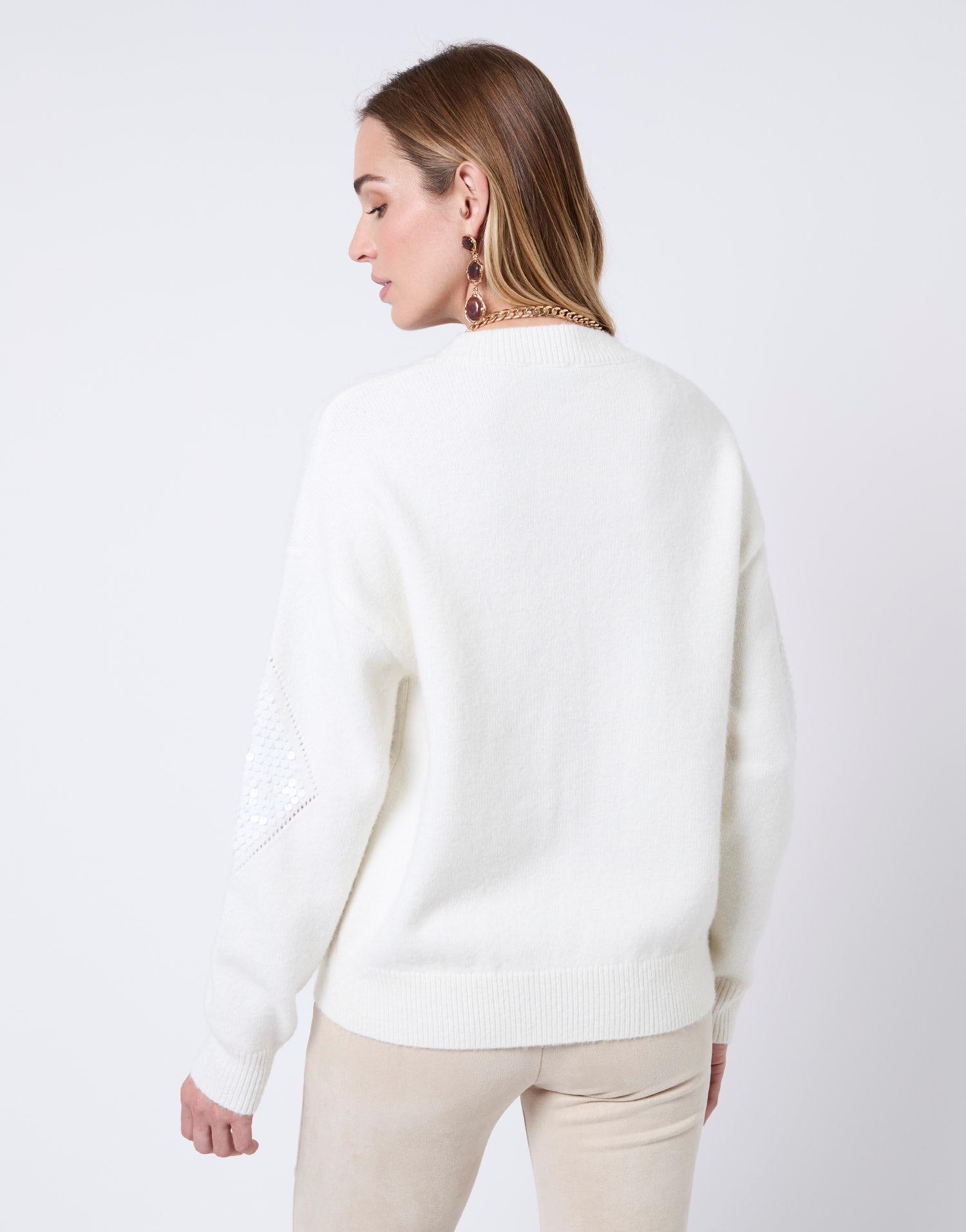 Détails produit : Pull épais en mélange laine uni décoré, encolure arrondie, sequins et manches longues. Couleur : ECRU