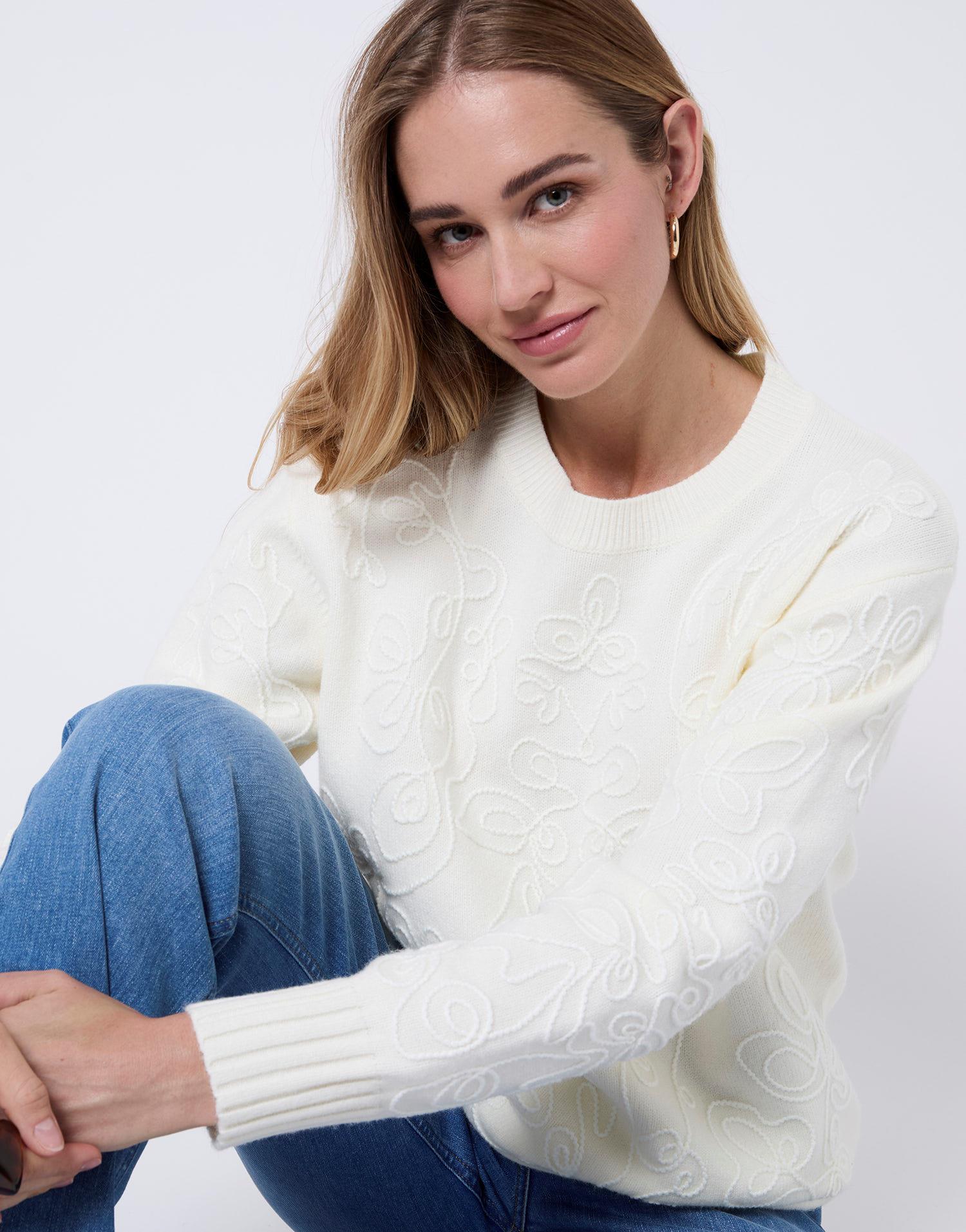 Détails produit : Pull épais uni, encolure arrondie, avec broderies et manches longues. Couleur : ECRU