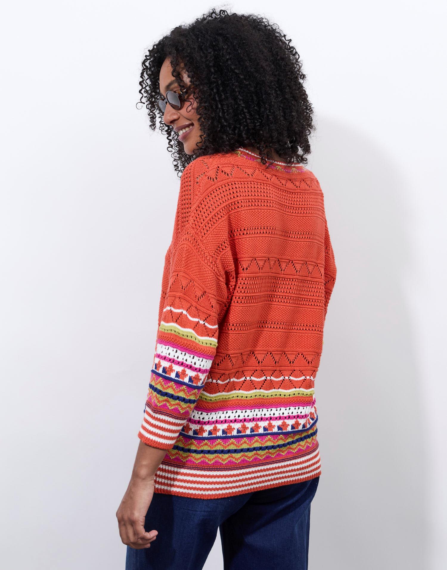 Détails produit : Pull fin en mélange coton rayé, encolure arrondie, tricotage fantaisie et manches 3/4. Couleur : ORANGE