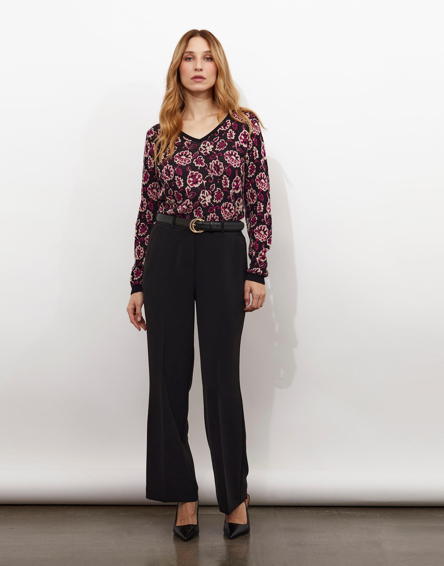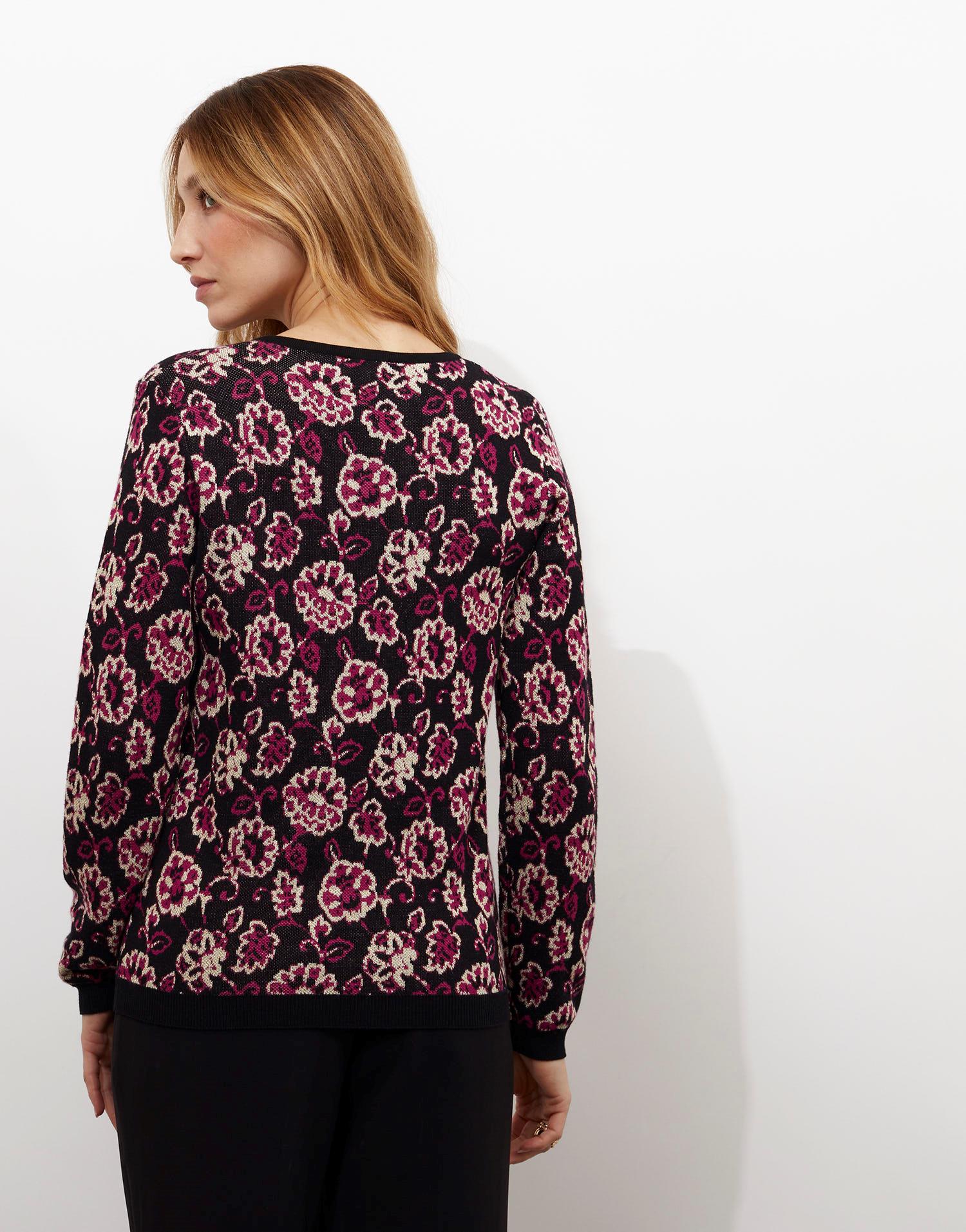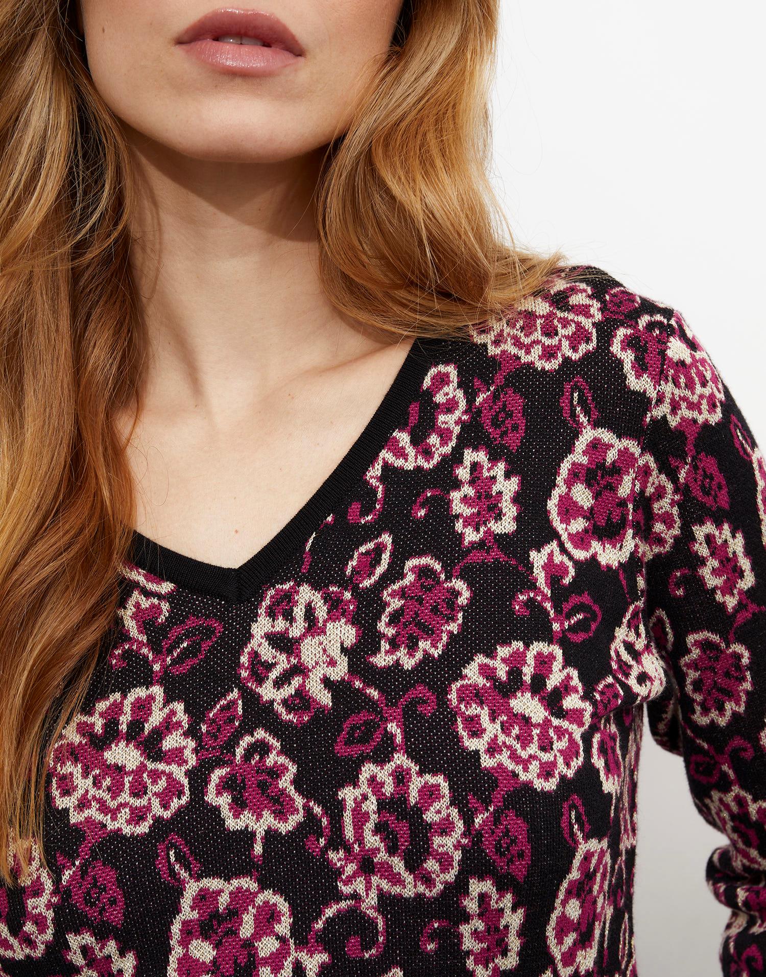 Détails produit : Pull fin Jacquard motif fleurs, decolleté en V et manches longues. Couleur : NOIR