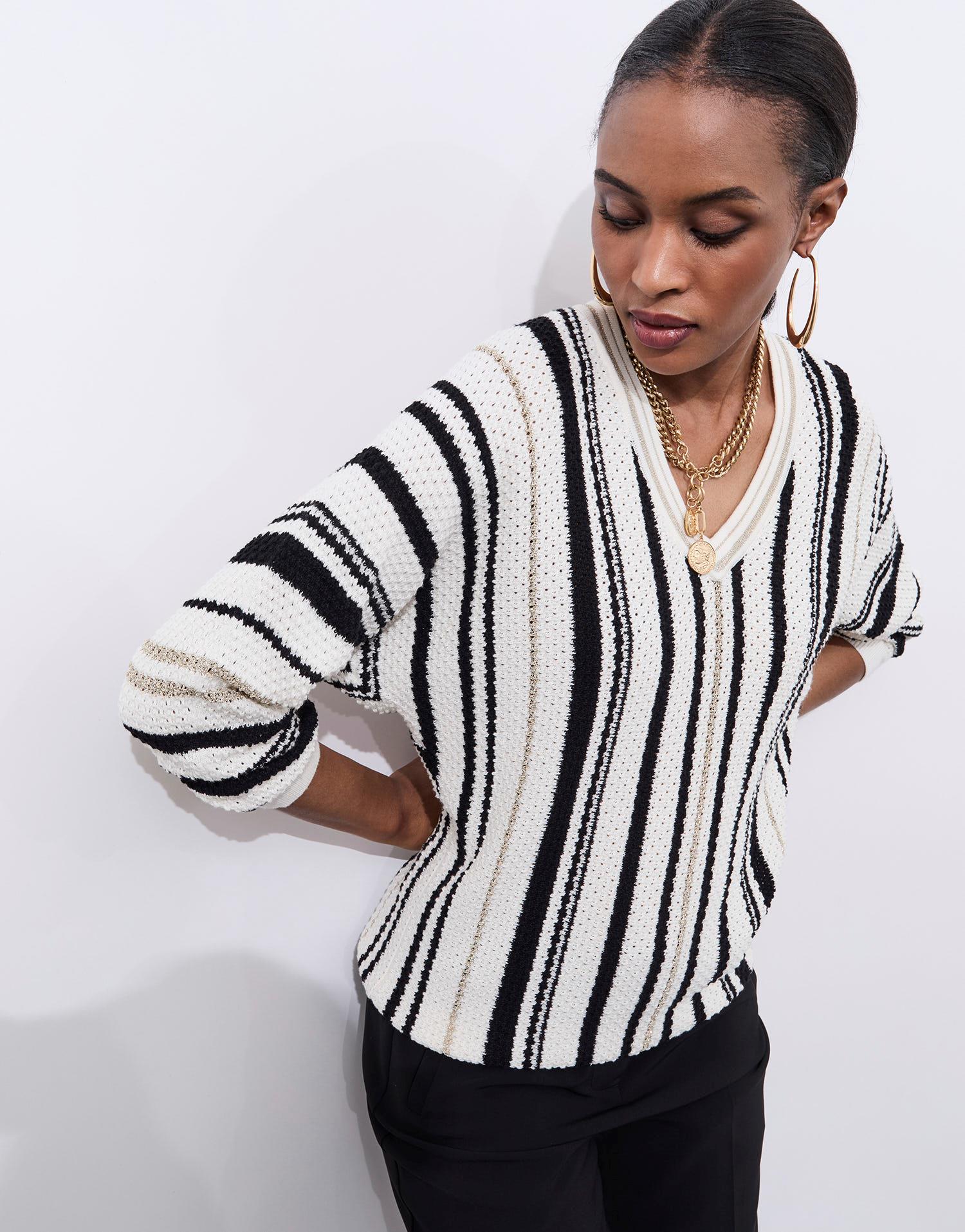 Détails produit : Pull fin rayé, decolleté en V et manches longues. Couleur : ECRU