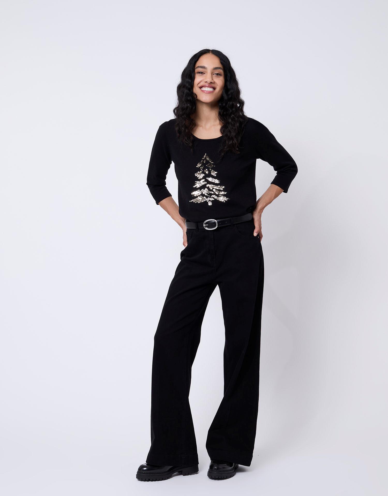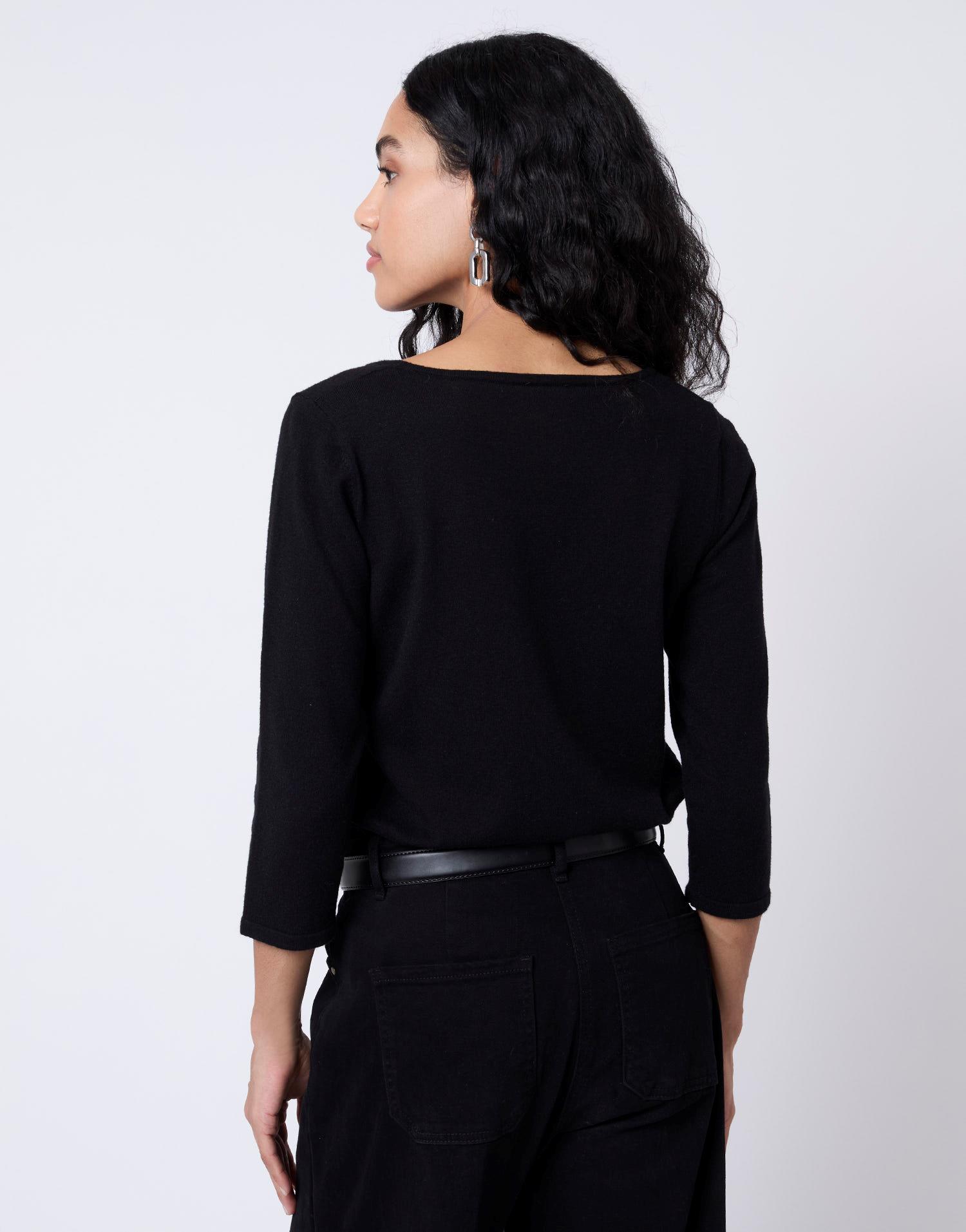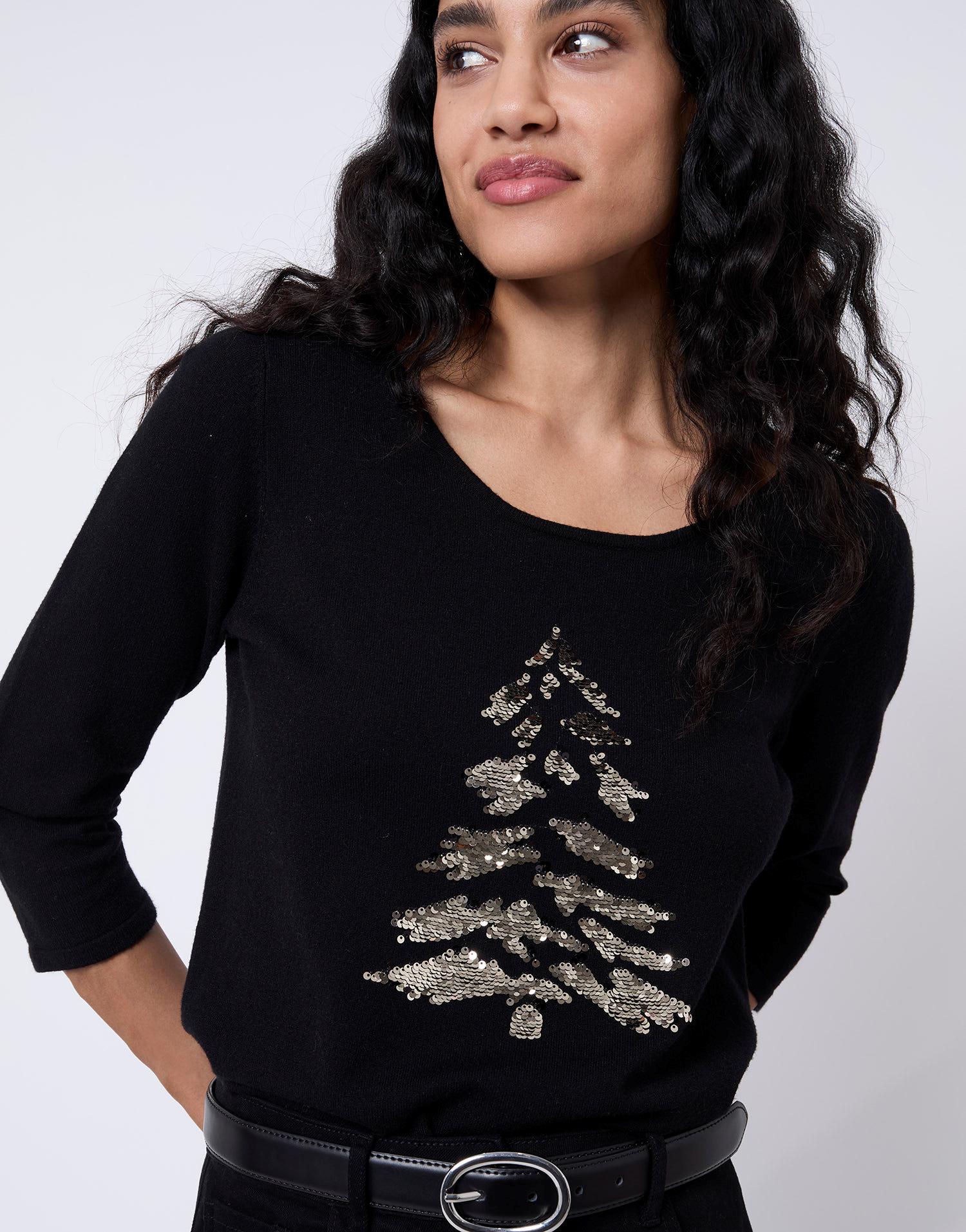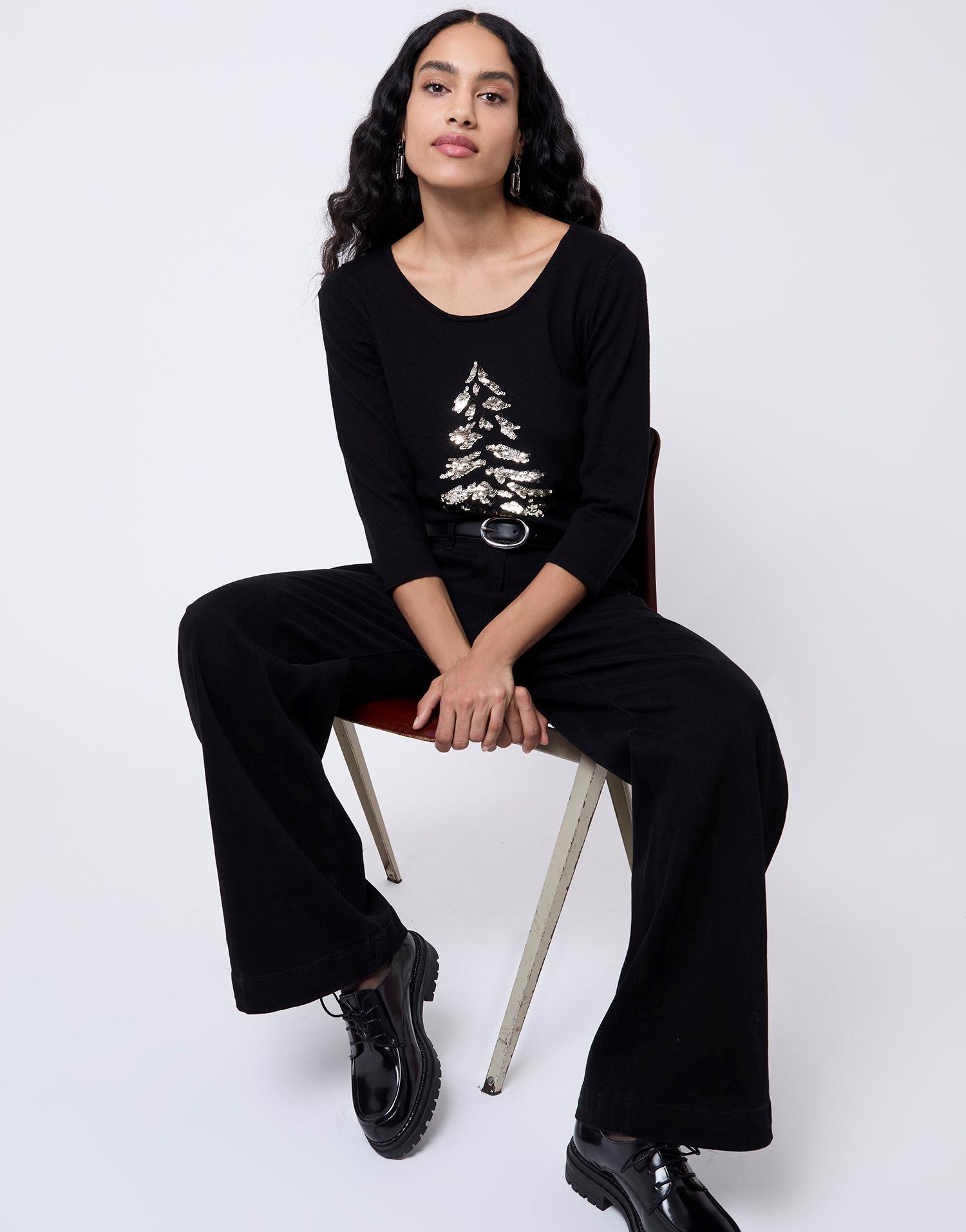 Détails produit : Pull fin uni décoré, encolure arrondie, sequins et manches 3/4. Couleur : NOIR