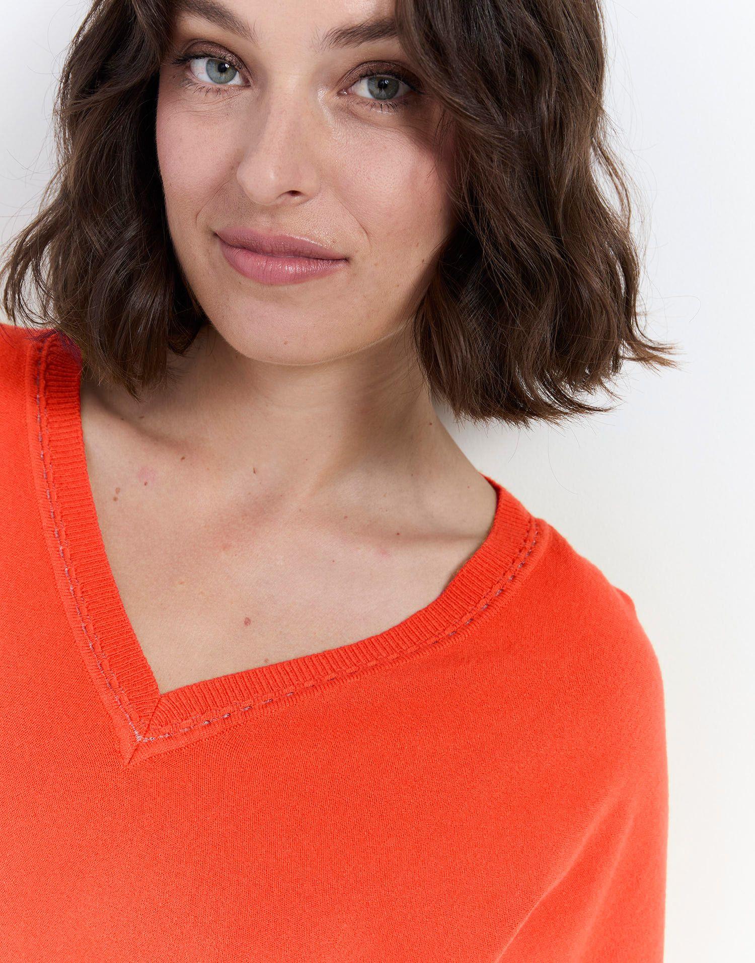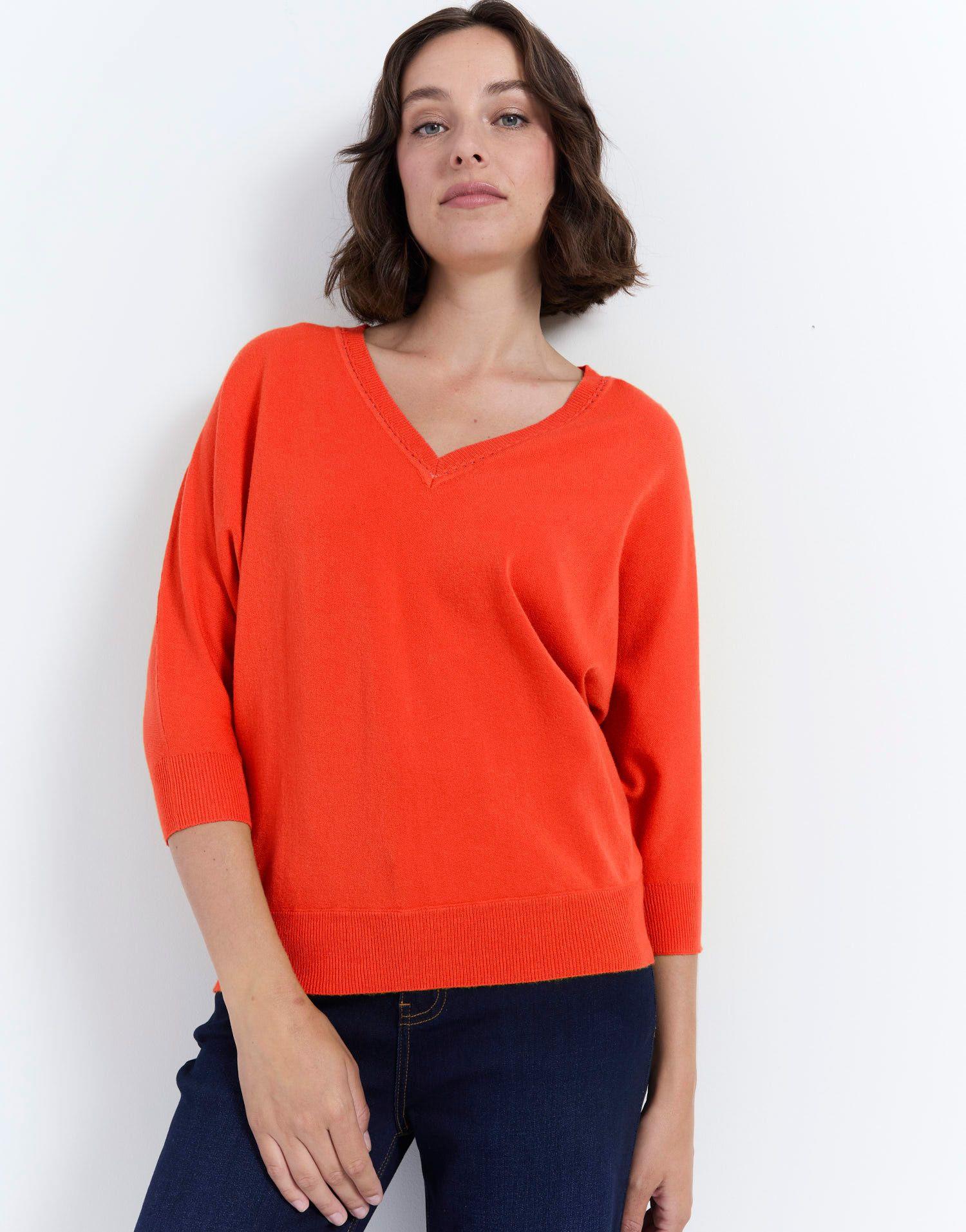 Détails produit : Pull fin uni, decolleté en V, Encolure fantaisie et manches chauves-souris. Couleur : ORANGE