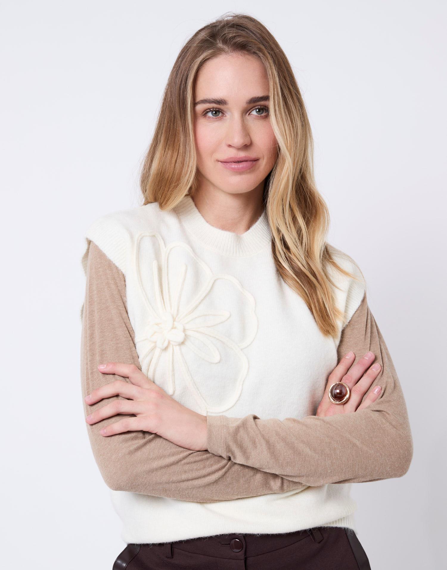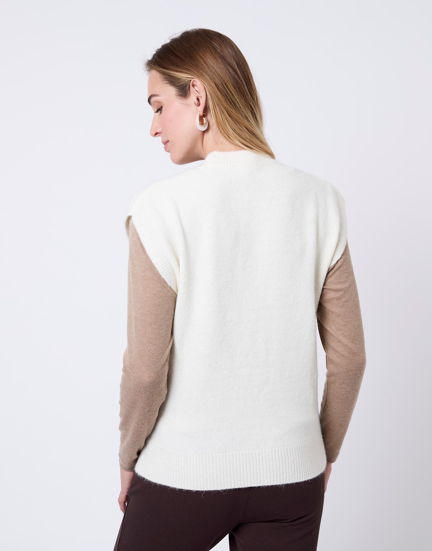 Détails produit : Pull fin uni, Col montant, Avec broderies et applications et sans manches. Couleur : ECRU