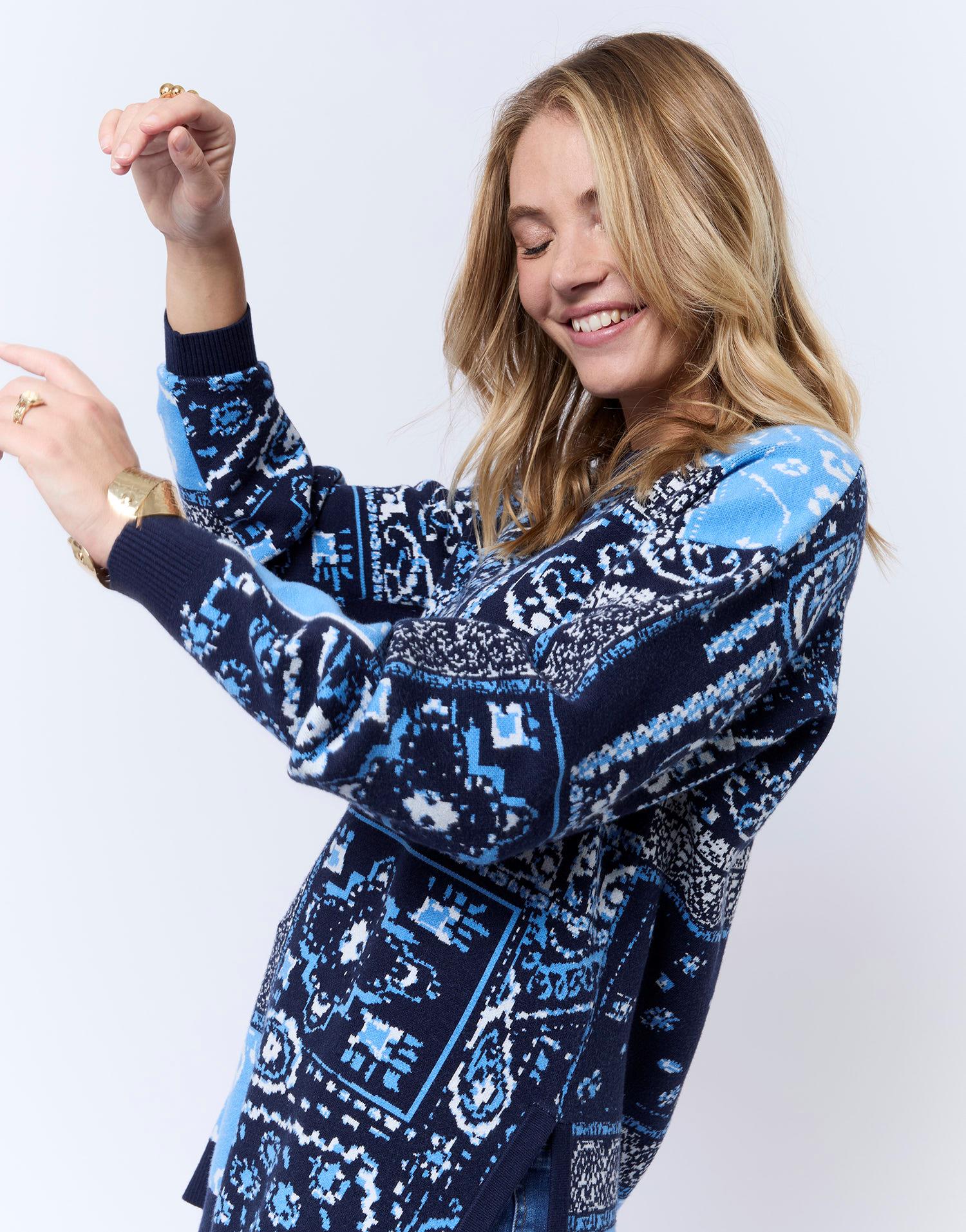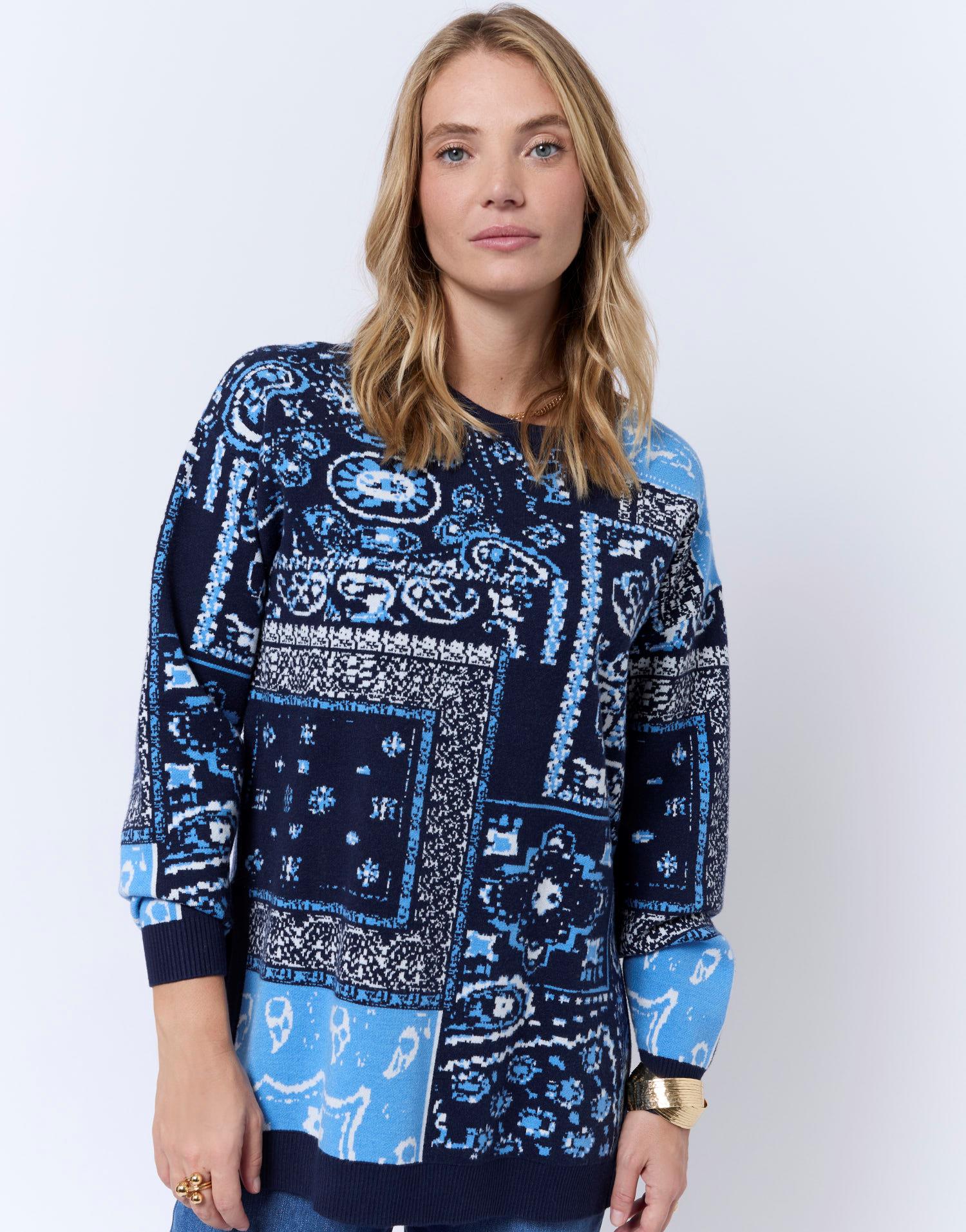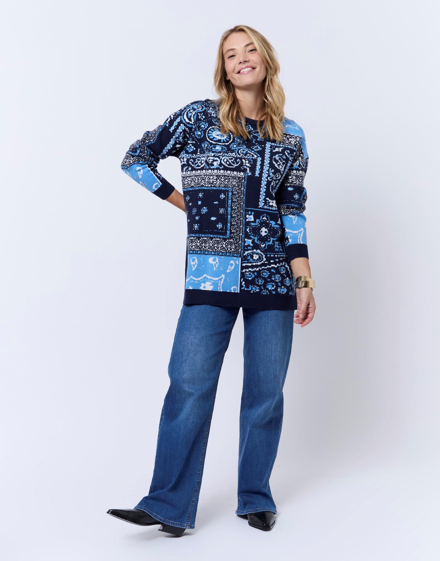 Détails produit : Tunique mi-long à motifs, encolure arrondie, Tricotage jacquard et manches longues. Couleur : BLEU