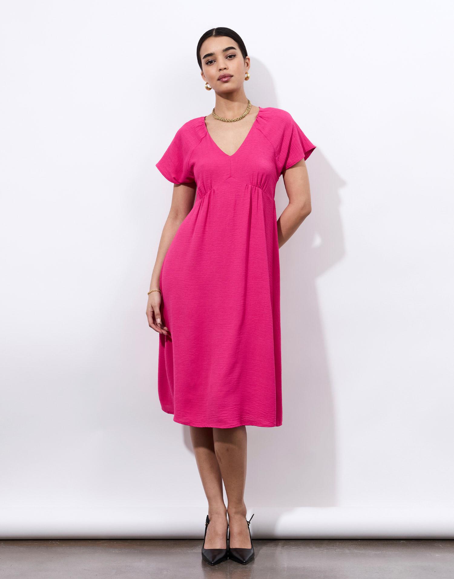 Détails produit : Robe midi unie, decolleté en V. Couleur : ROSE