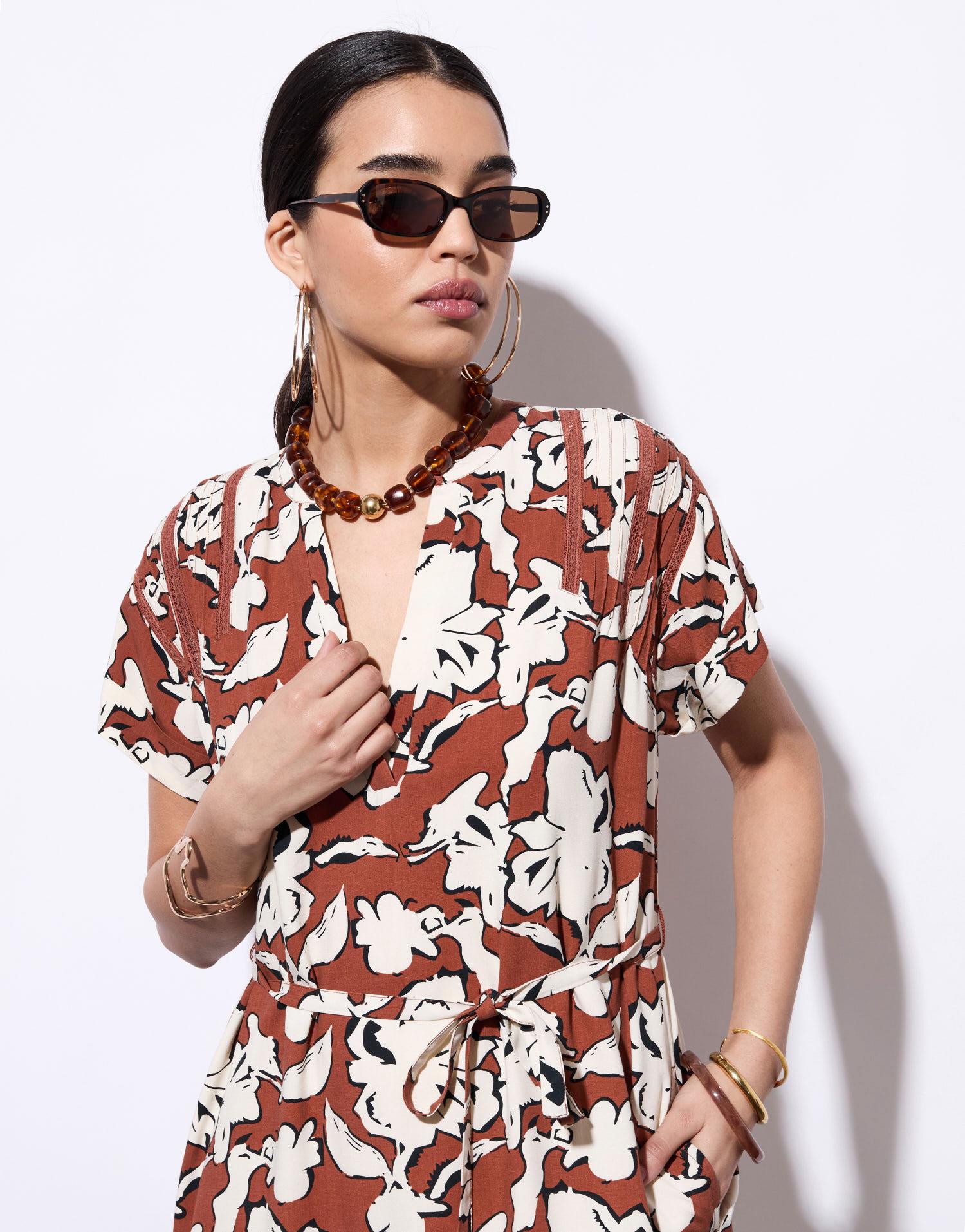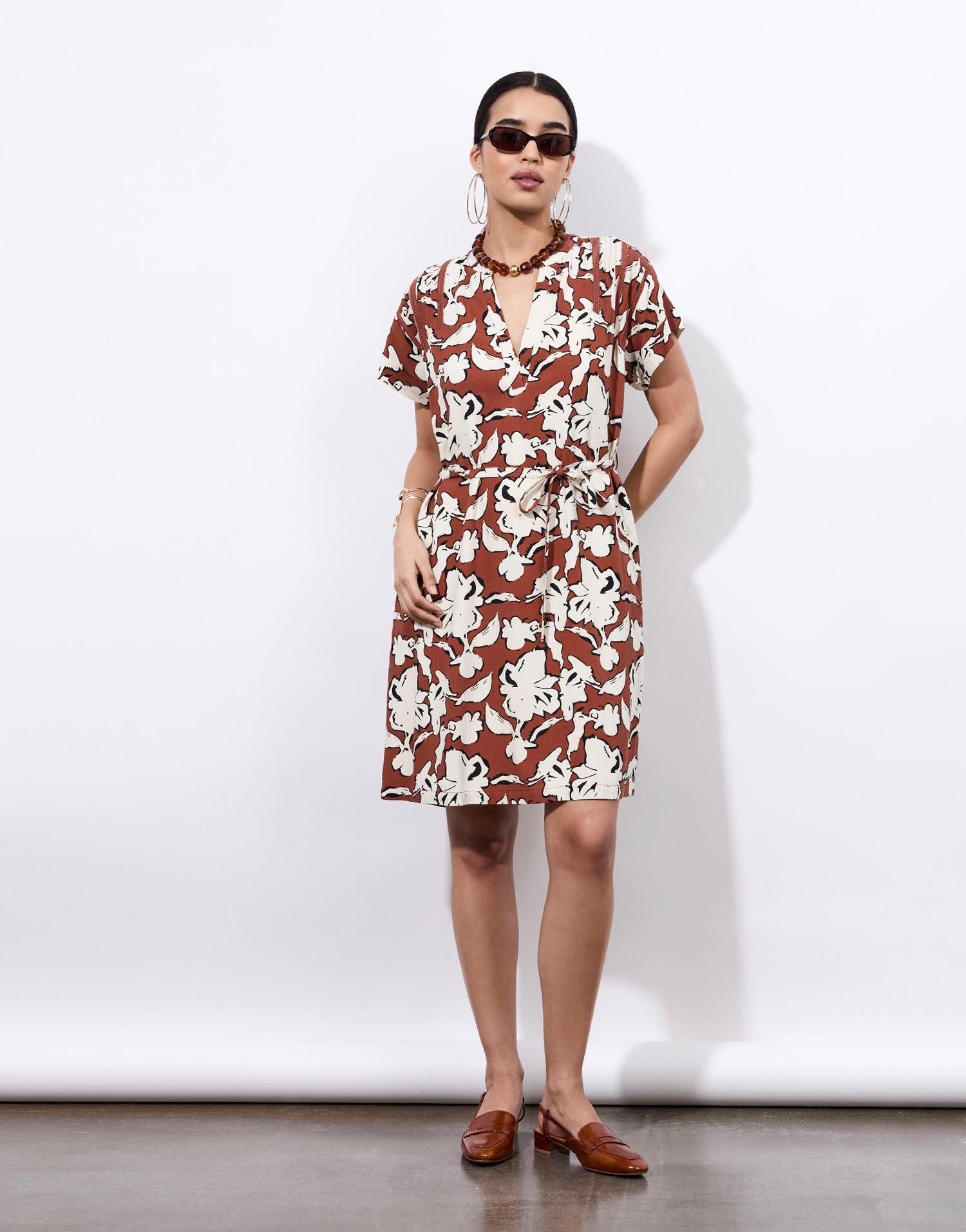 Détails produit : Robe courte imprimé à fleurs, housse, decolleté en V et resserrée taille avec un lien. Couleur : MARRON