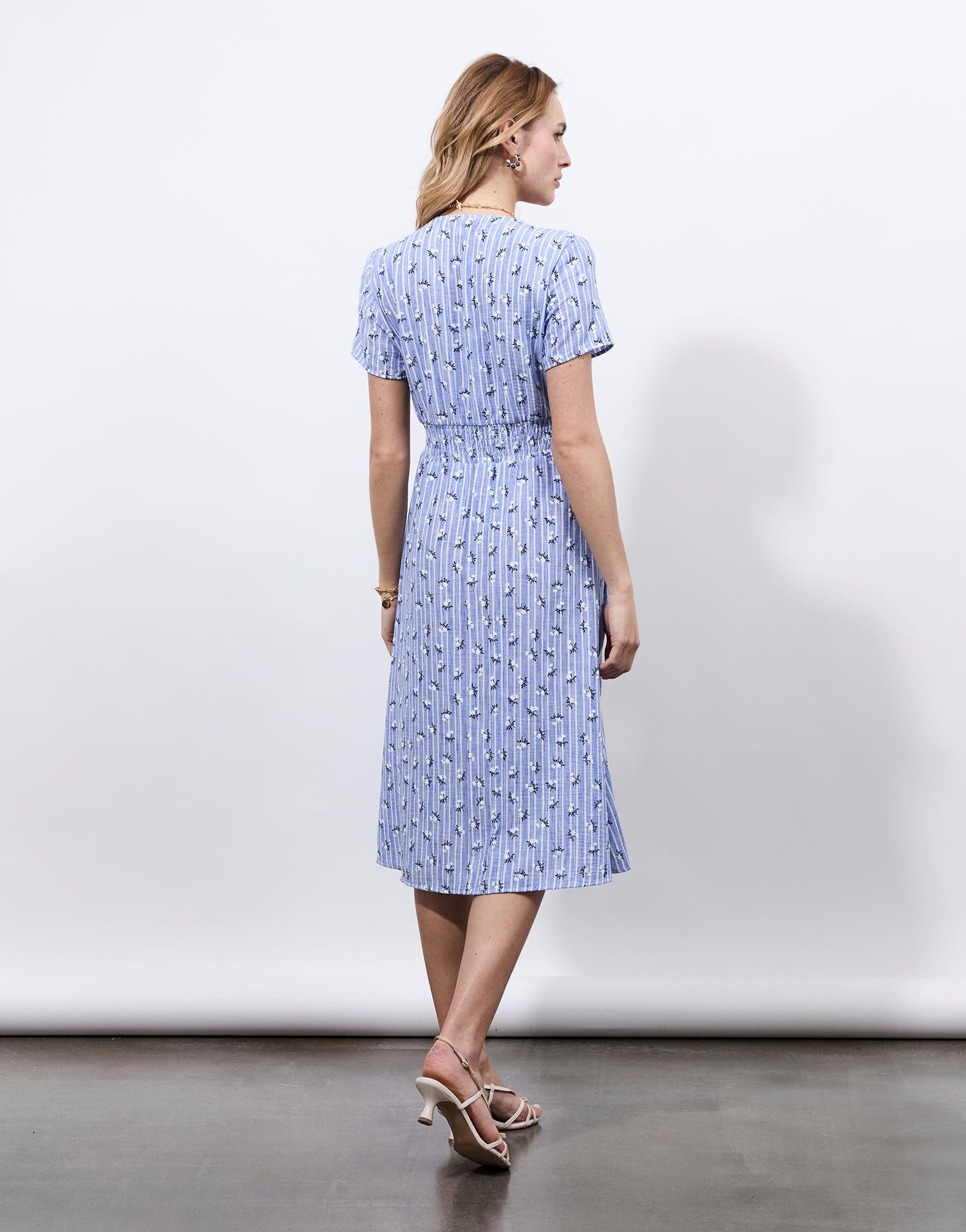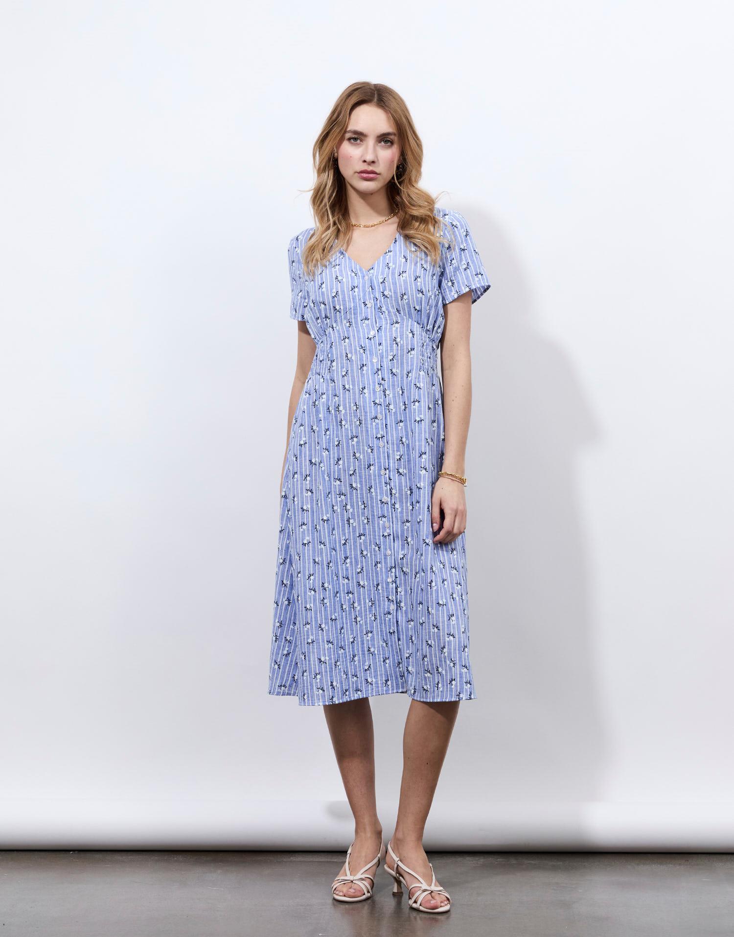 Détails produit : Robe longue imprimé à fleurs, droite et decolleté en V. Couleur : BLEU