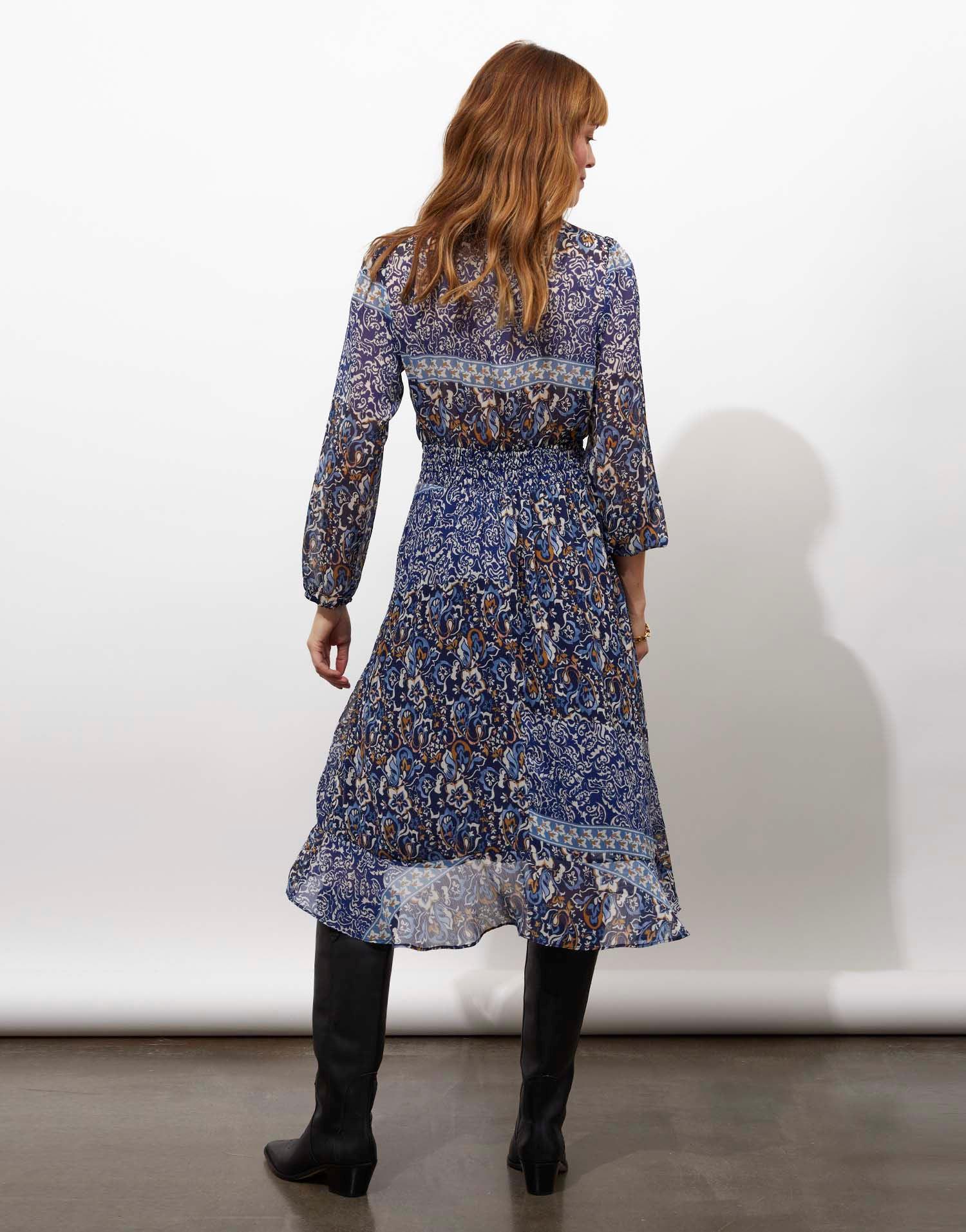 Détails produit : Robe midi imprimée, decolleté en V. Couleur : BLEU