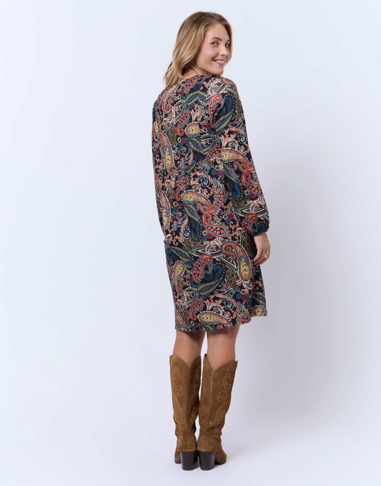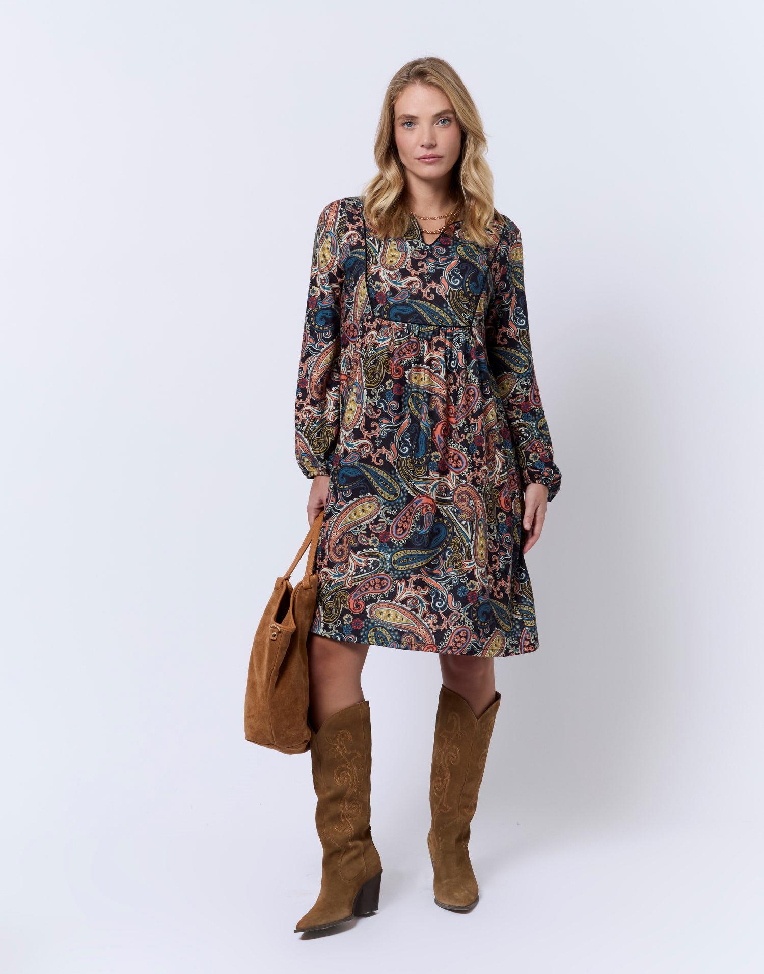 Détails produit : Robe courte imprimée, decolleté en V, taille non marquée, manches longues, Passepoil contrasté et non doublée. Couleur : MARINE