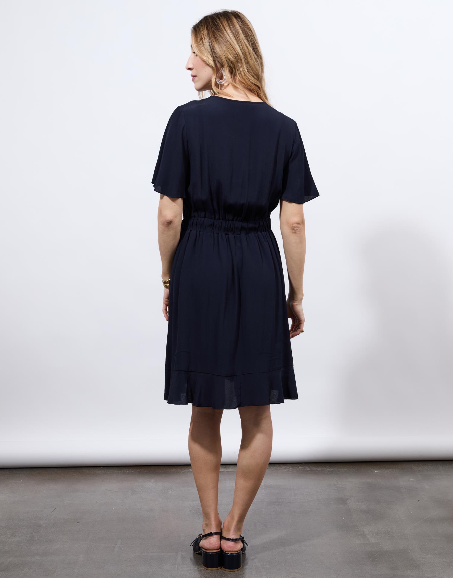 Détails produit : Robe courte unie, decolleté en V, taille ajustée, manches courtes, Faux portefeuille à nouer et non doublée. Couleur : MARINE