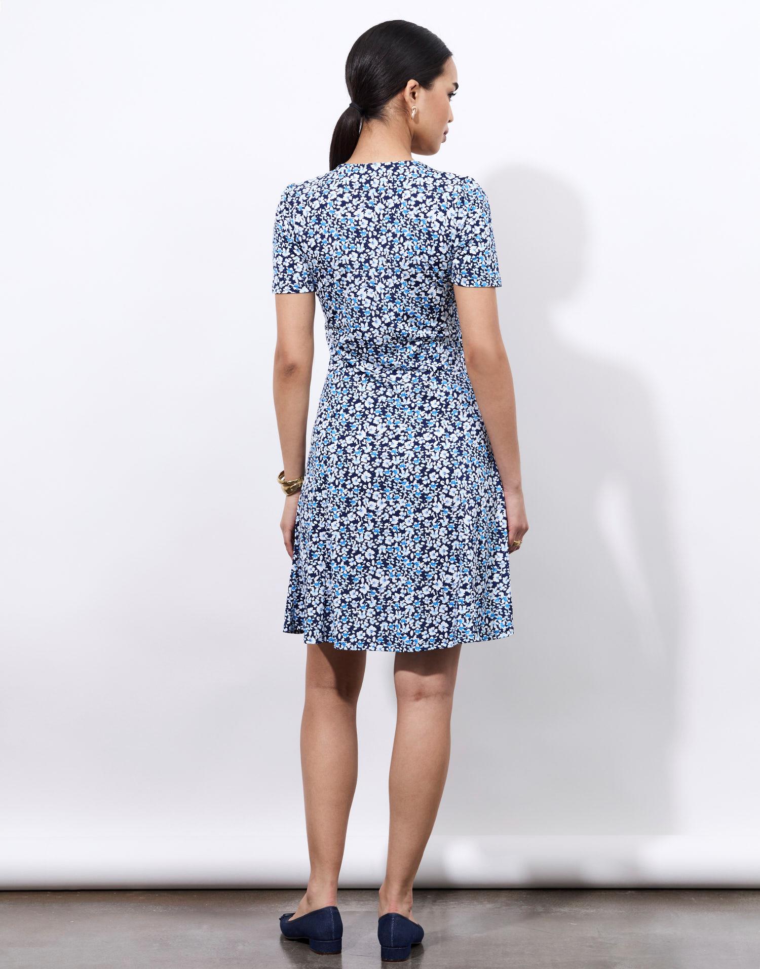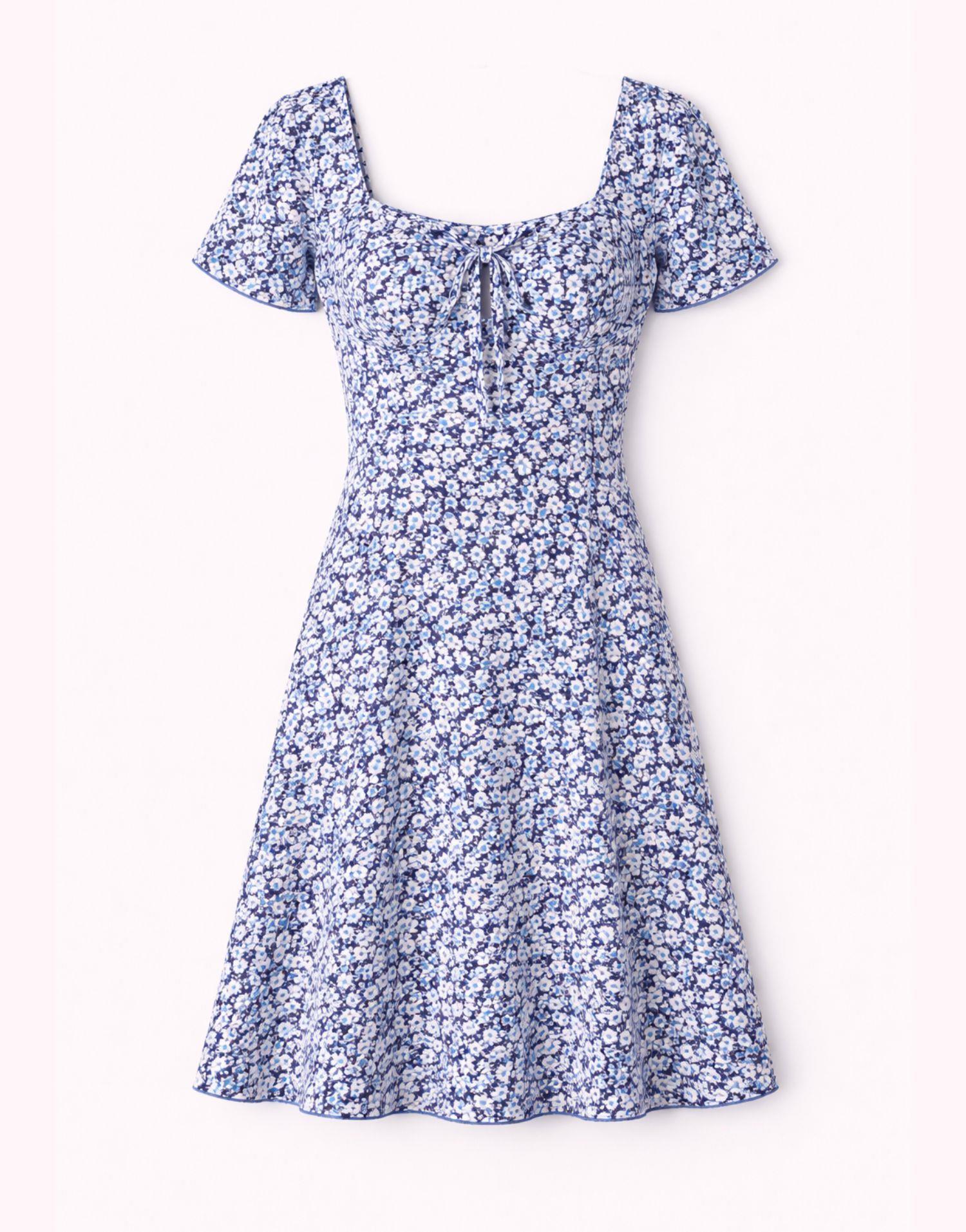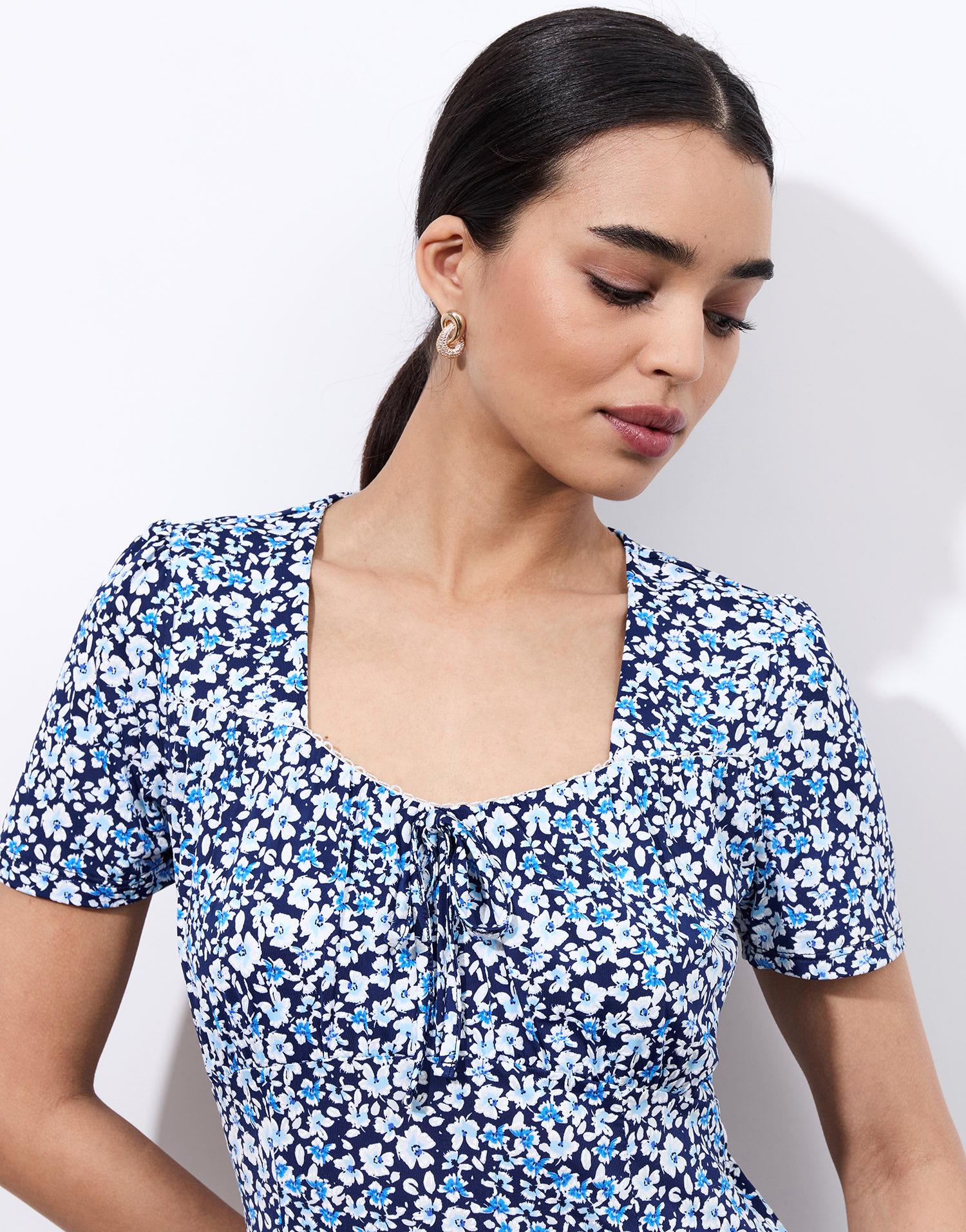 Détails produit : Robe courte imprimé à fleurs, encolure danseuse, taille non marquée, manches courtes et non doublée. Couleur : BLEU