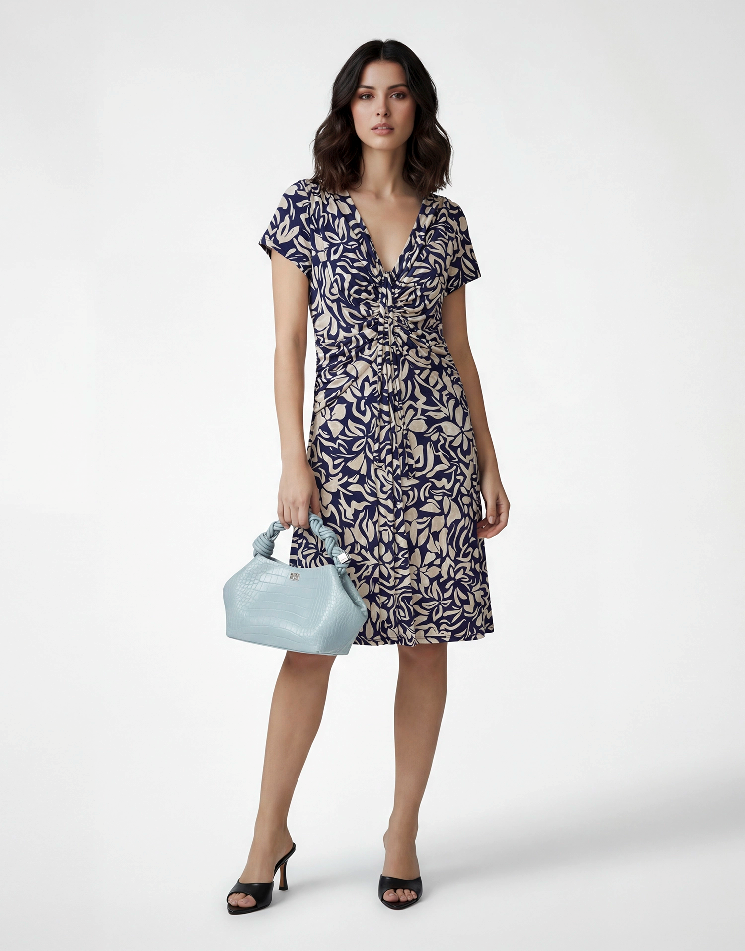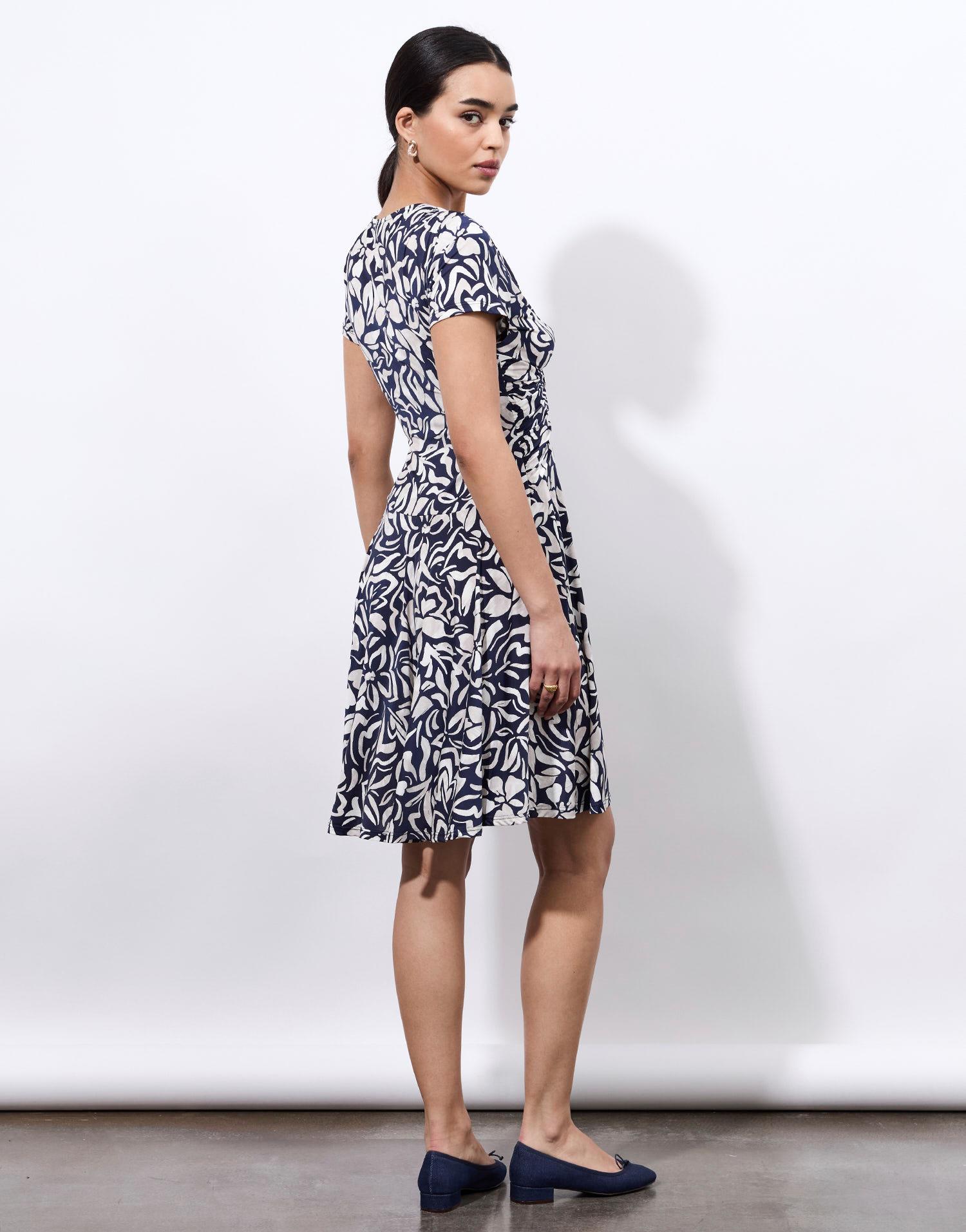 Détails produit : Robe courte imprimée, évasée, decolleté en V, manches courtes, avec liens coulissants et non doublée. Couleur : MARINE