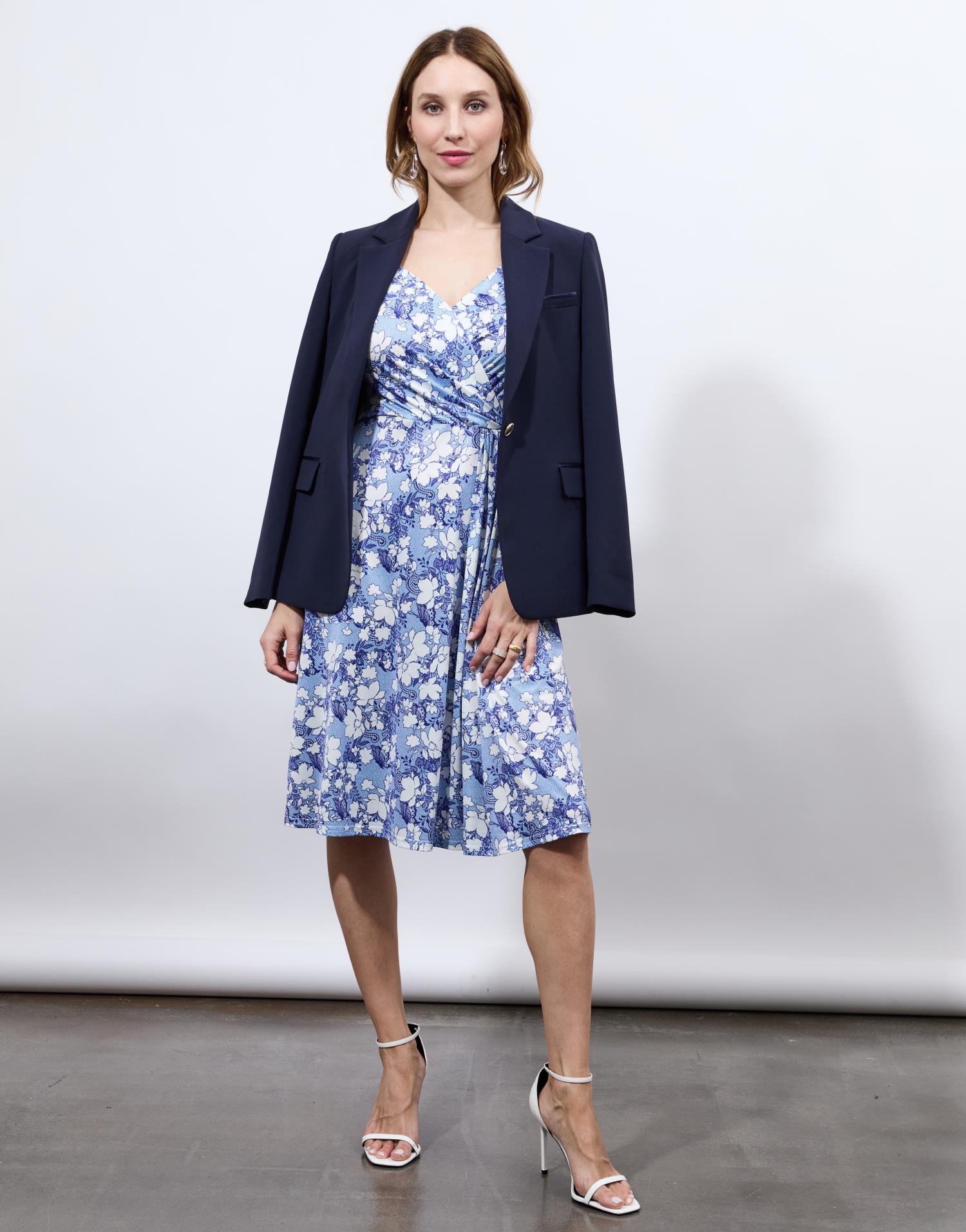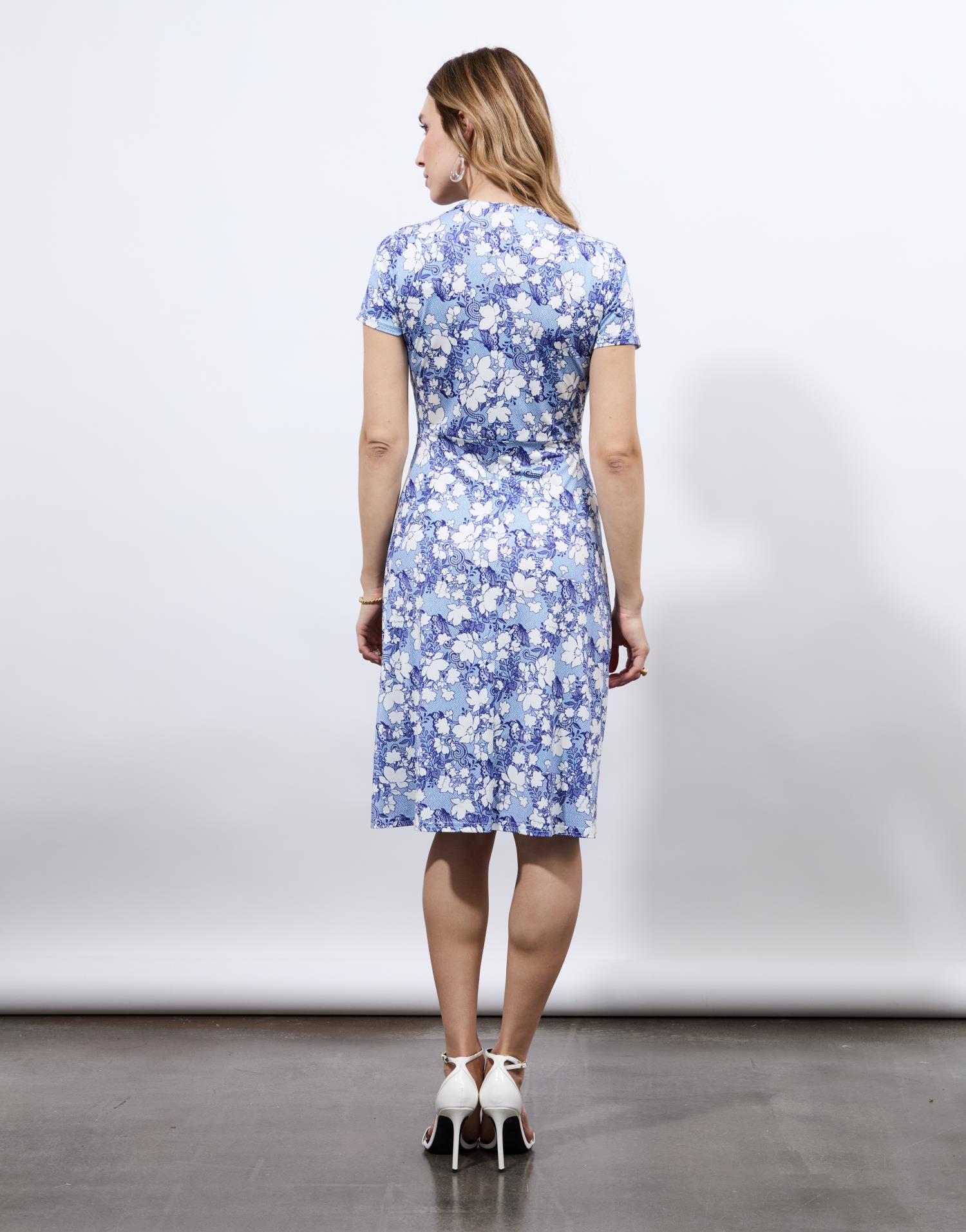 Détails produit : Robe courte imprimée, Encolure coeur, taille ajustée, manches courtes, effet drapé et non doublée. Couleur : BLEU