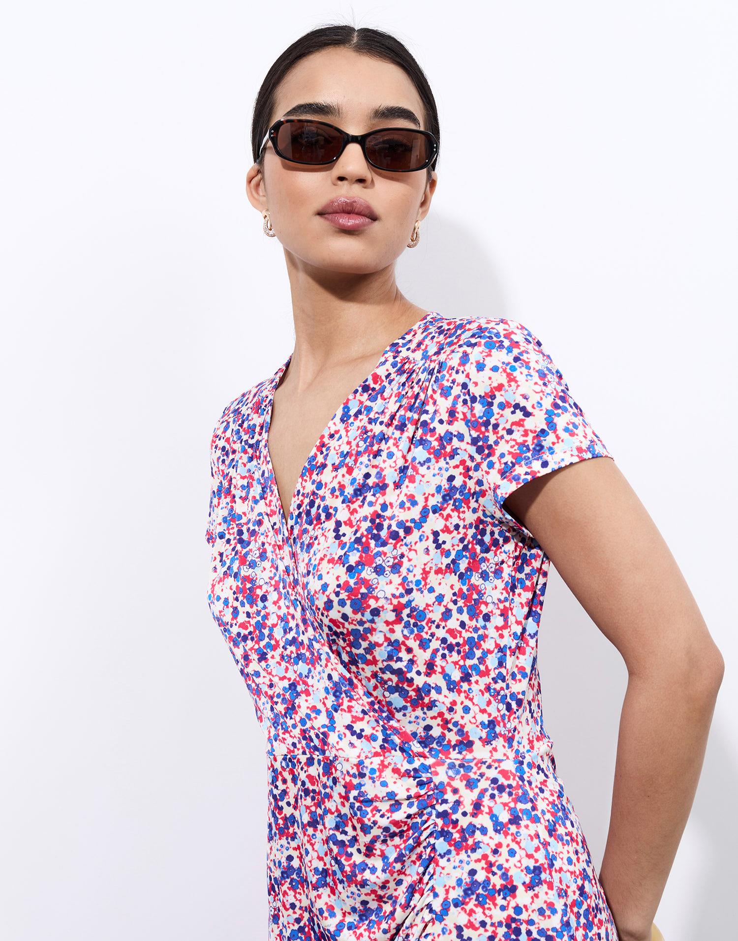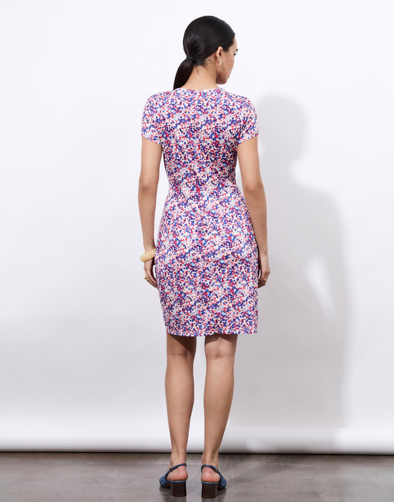Détails produit : Robe courte imprimée, decolleté en V, taille ajustée, manches courtes, effet drapé et en maille. Couleur : BLEU