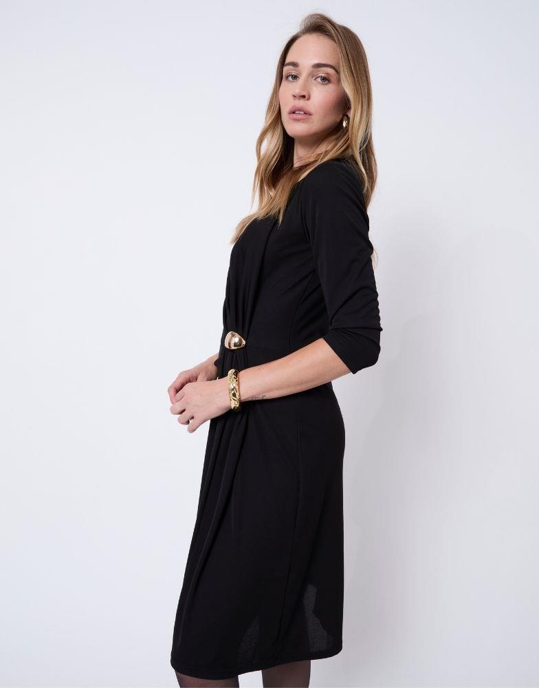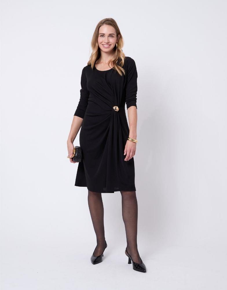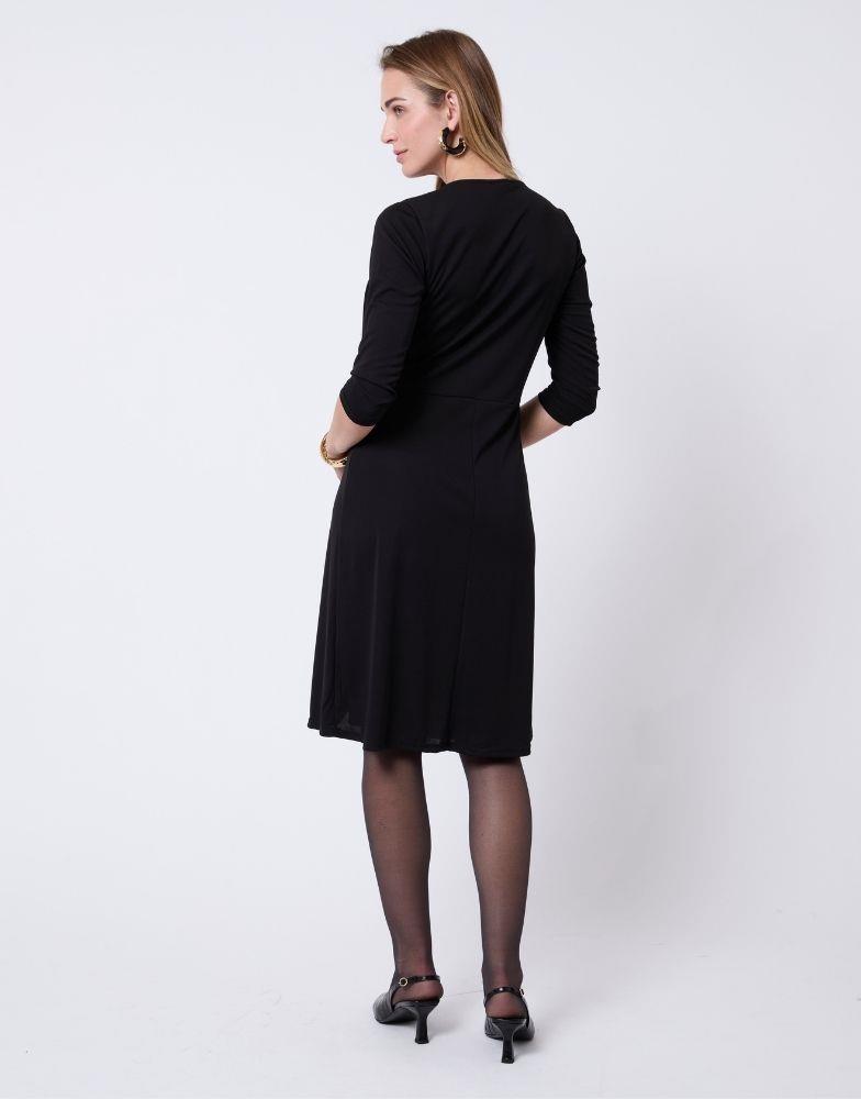 Détails produit : Robe courte unie, encolure arrondie, taille ajustée, manches 3/4, effet drapé et non doublée. Couleur : NOIR