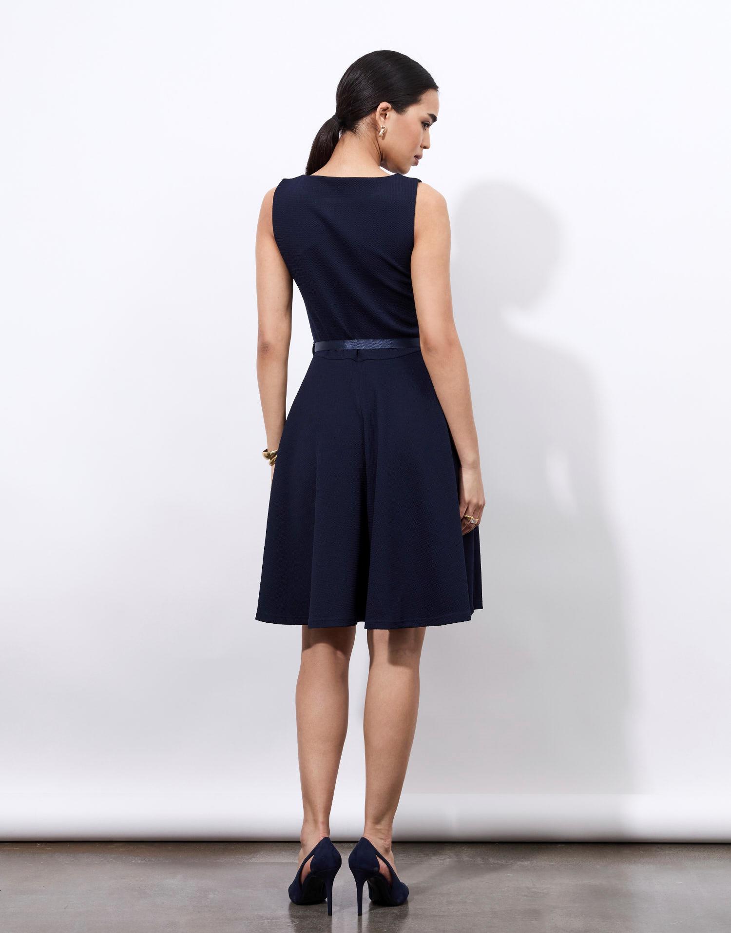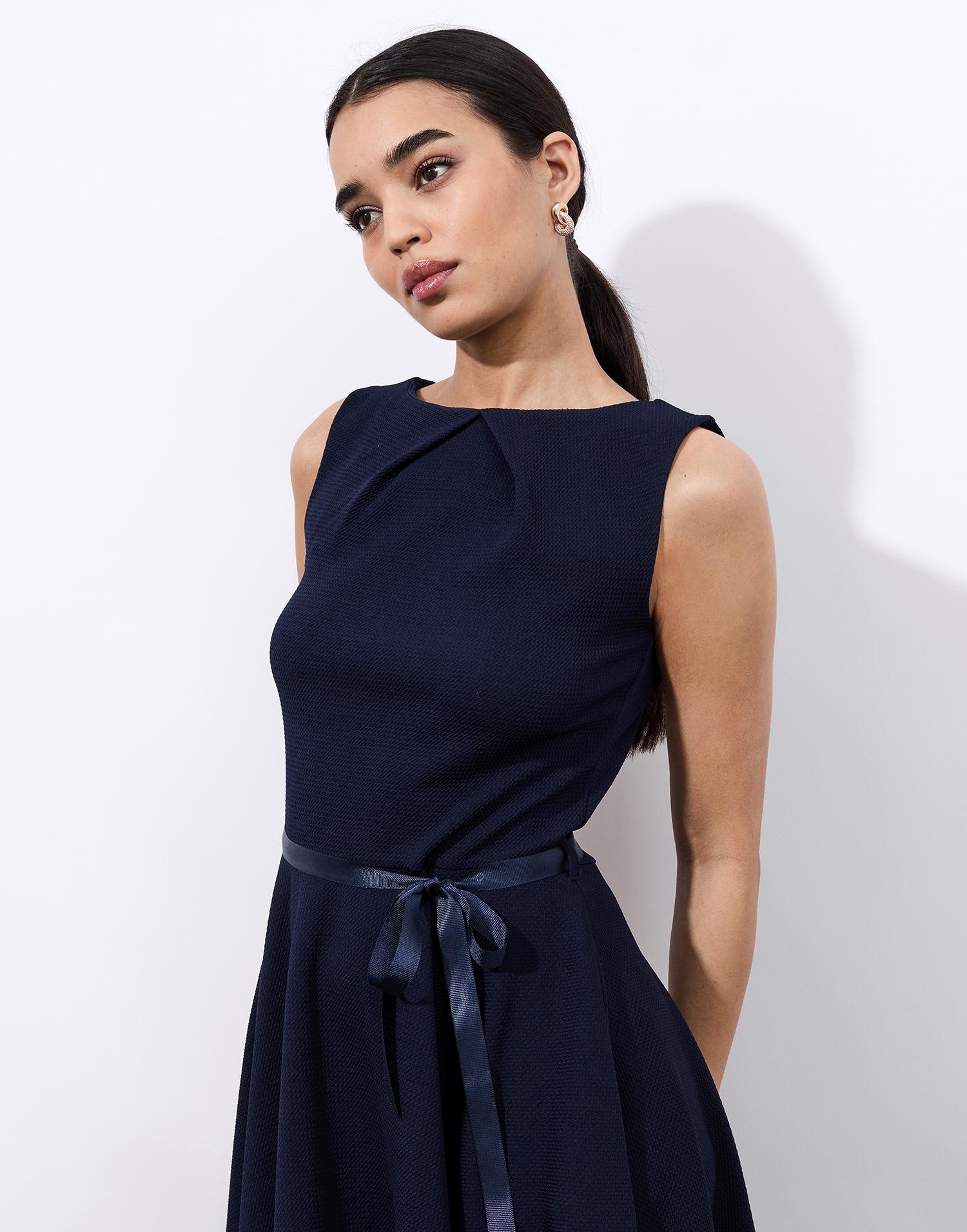 Détails produit : Robe courte unie, encolure bateau, taille ajustée, sans manches, Plis creux devant et non doublée. Couleur : MARINE