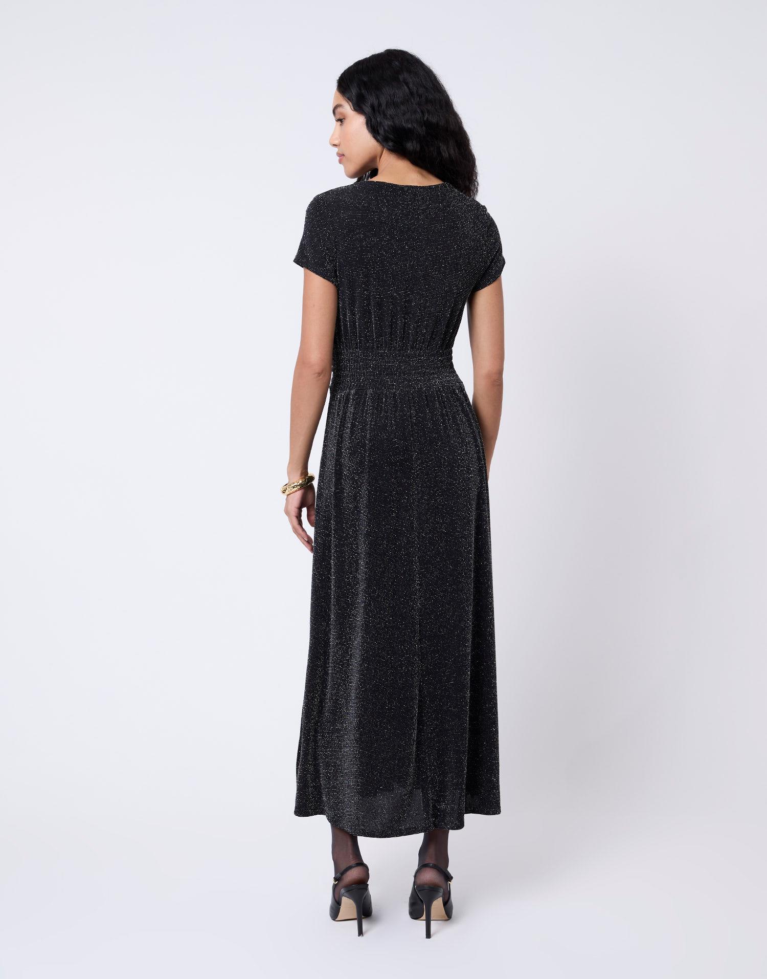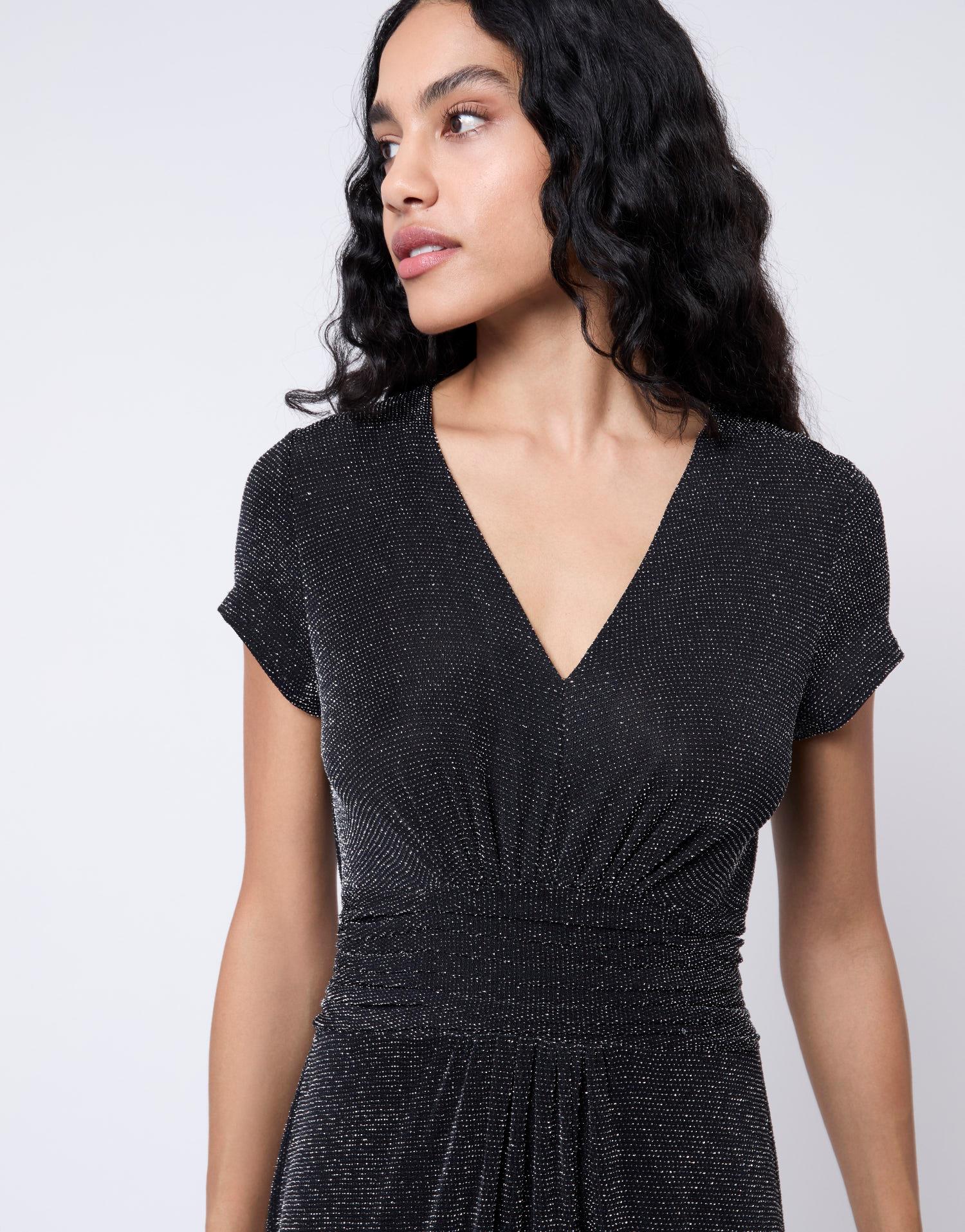 Détails produit : Robe longue à pailletttes, decolleté en V, taille élastiquée, manches courtes, effet drapé et non doublée. Couleur : NOIR