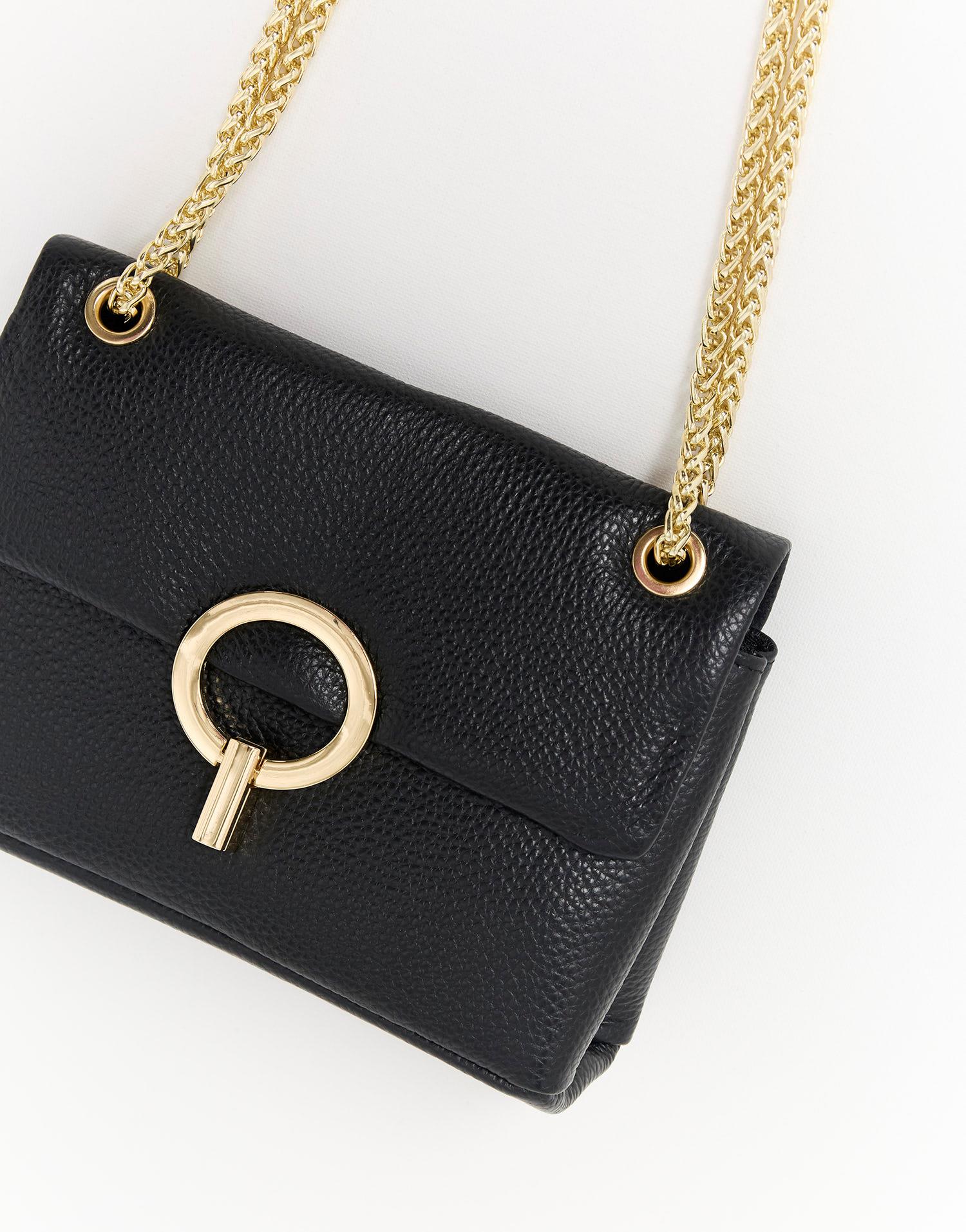 Détails produit : Sac épaule en cuir uni, fermé par boucle sur le devant et bandoulière chaîne. Couleur : NOIR