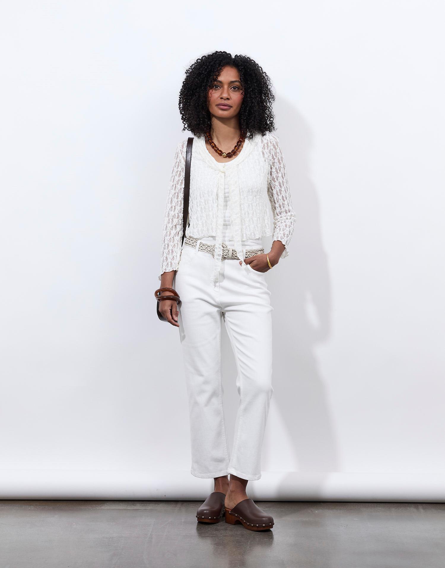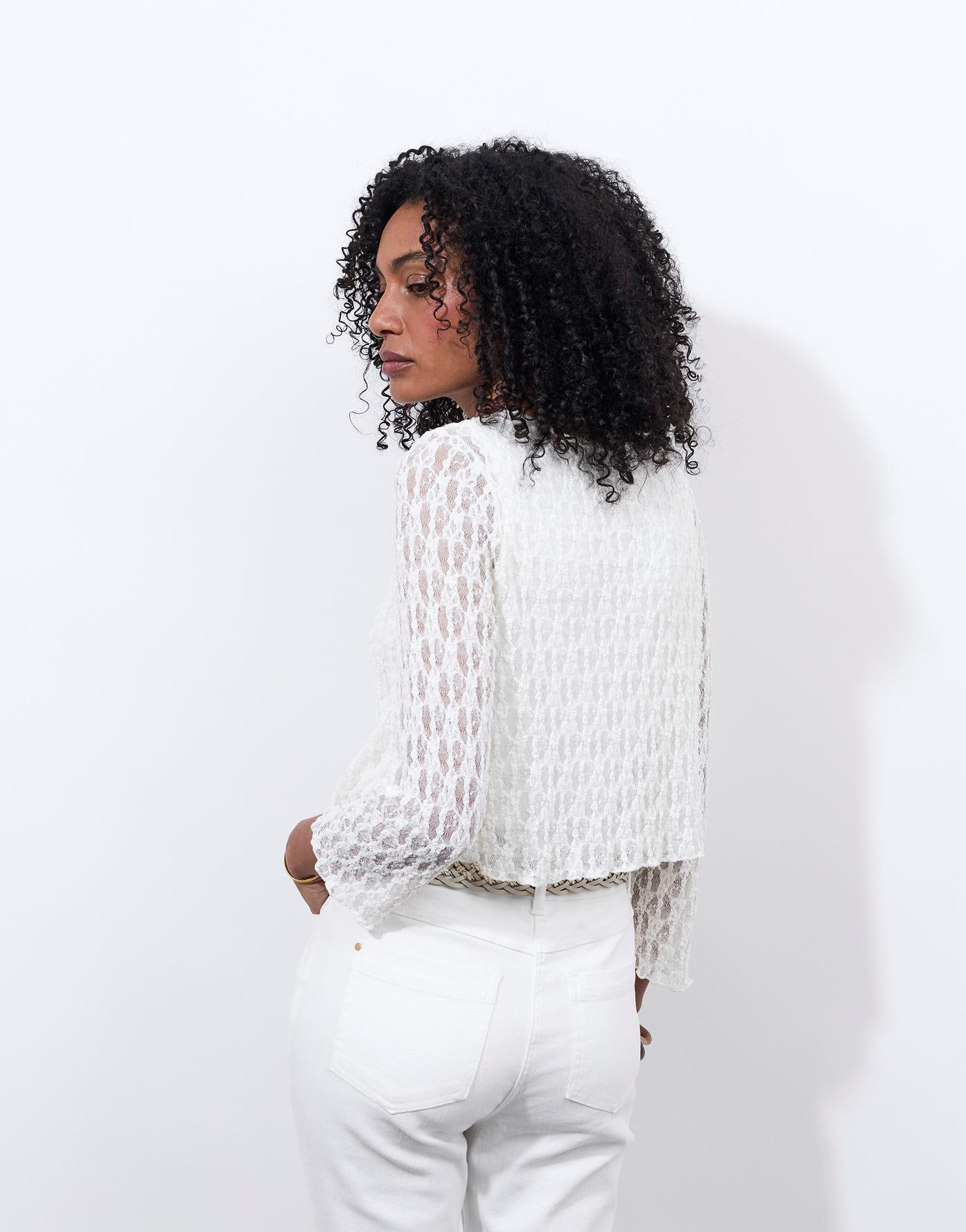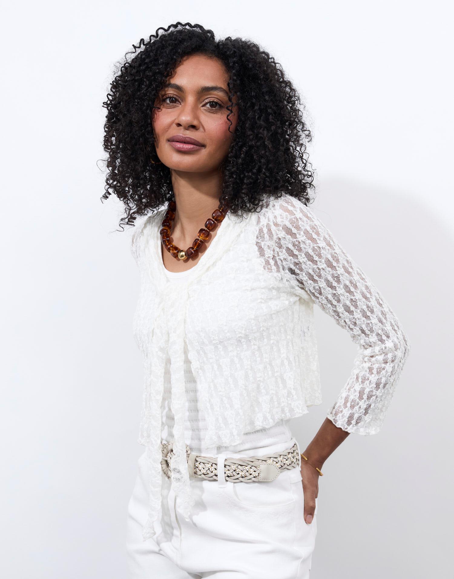 Détails produit : Boléro manches longues en dentelle uni, forme droite, decolleté en V, manches longues et avec volants. Couleur : ECRU
