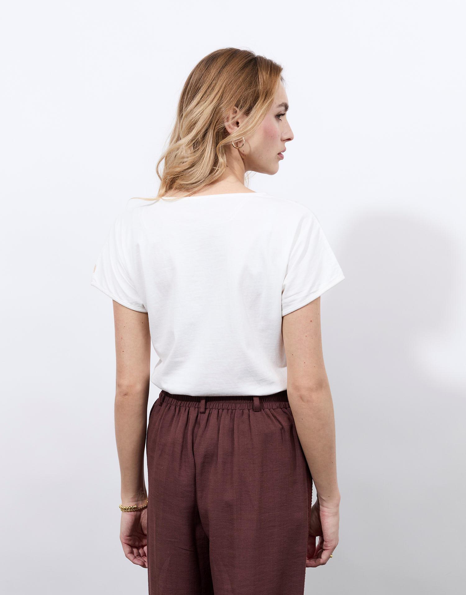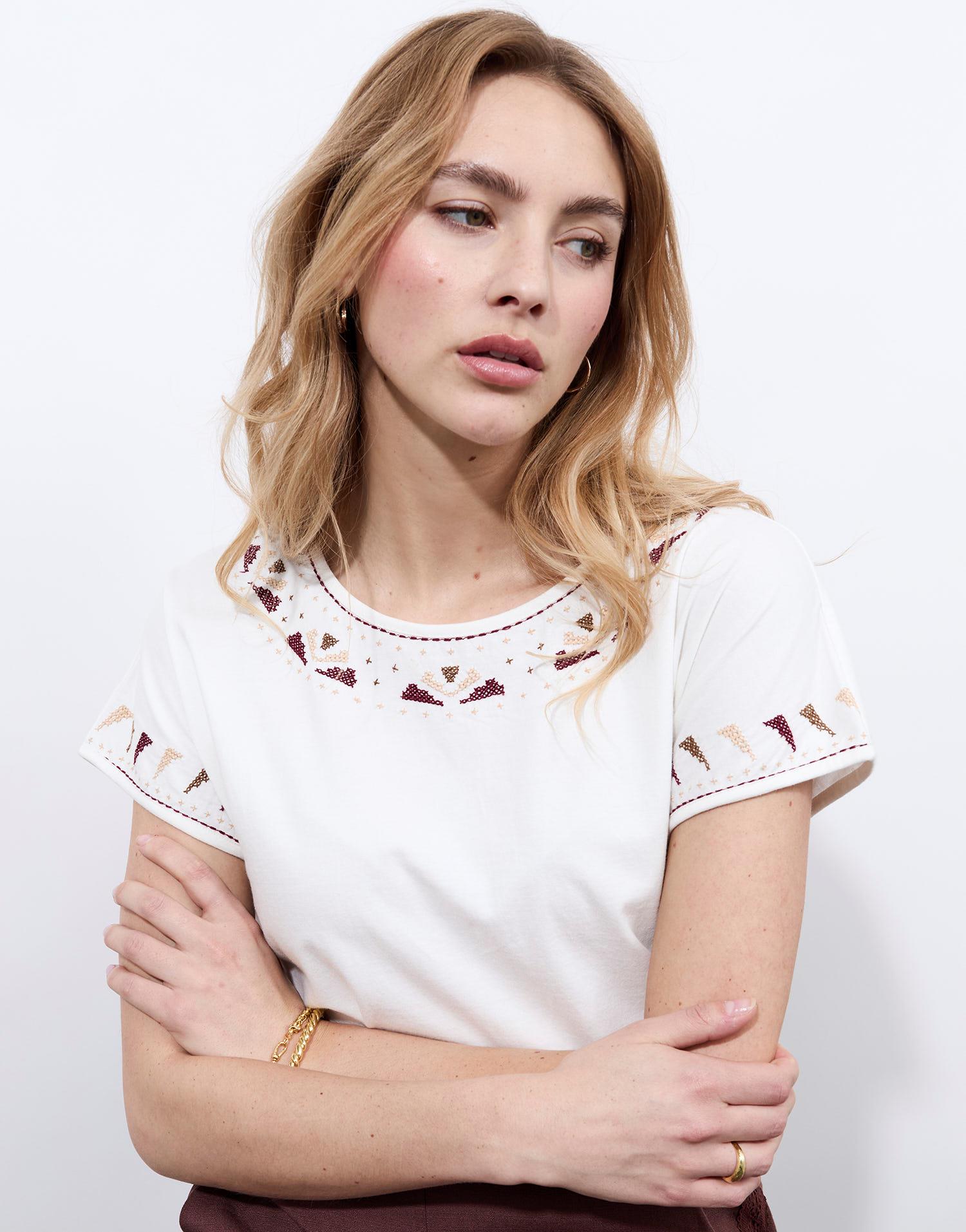 Détails produit : T-Shirt manches courtes 100% coton uni décoré, encolure arrondie, manches courtes et avec broderies. Couleur : BLANC