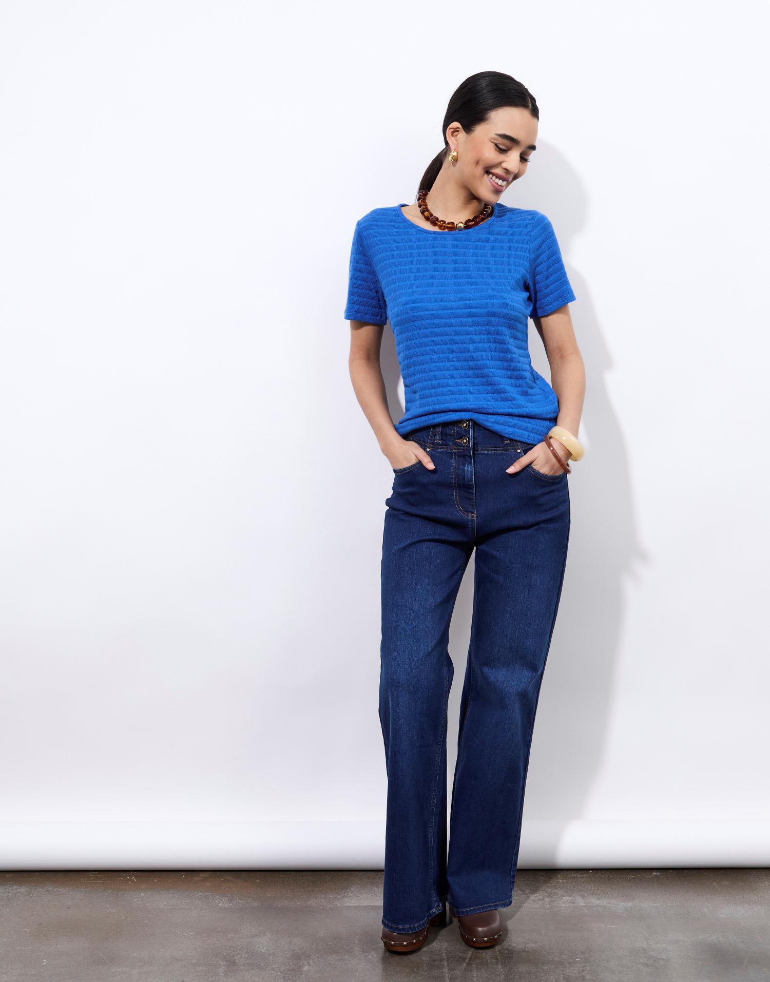 Détails produit : T-Shirt manches courtes en mélange coton uni, encolure arrondie. Couleur : BLEU