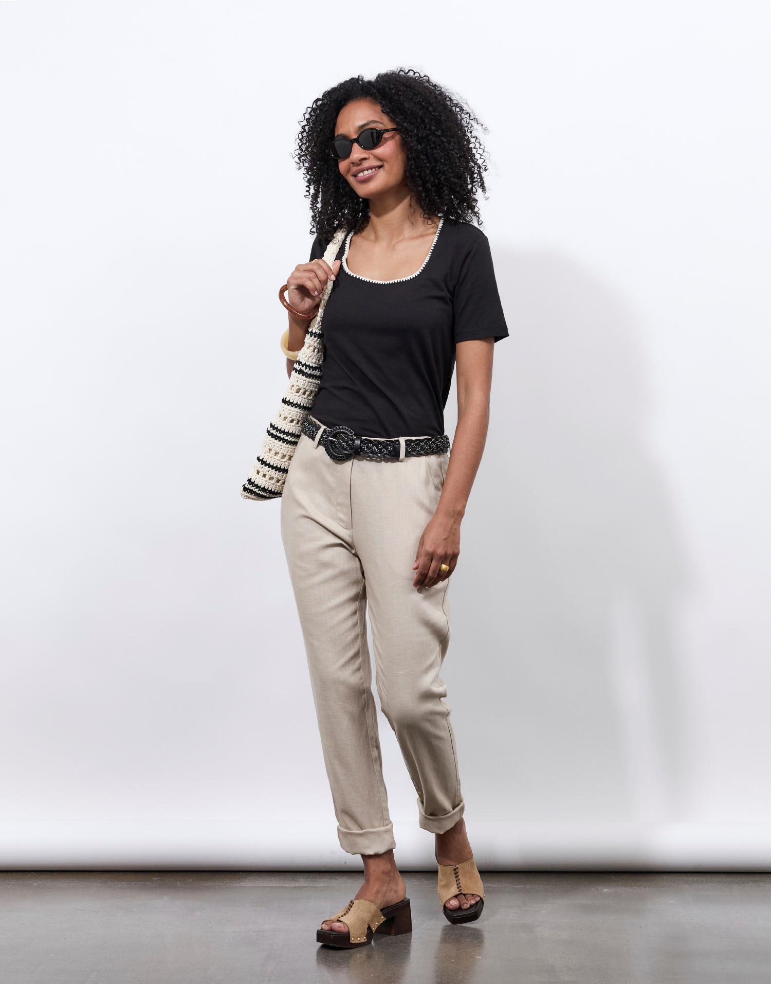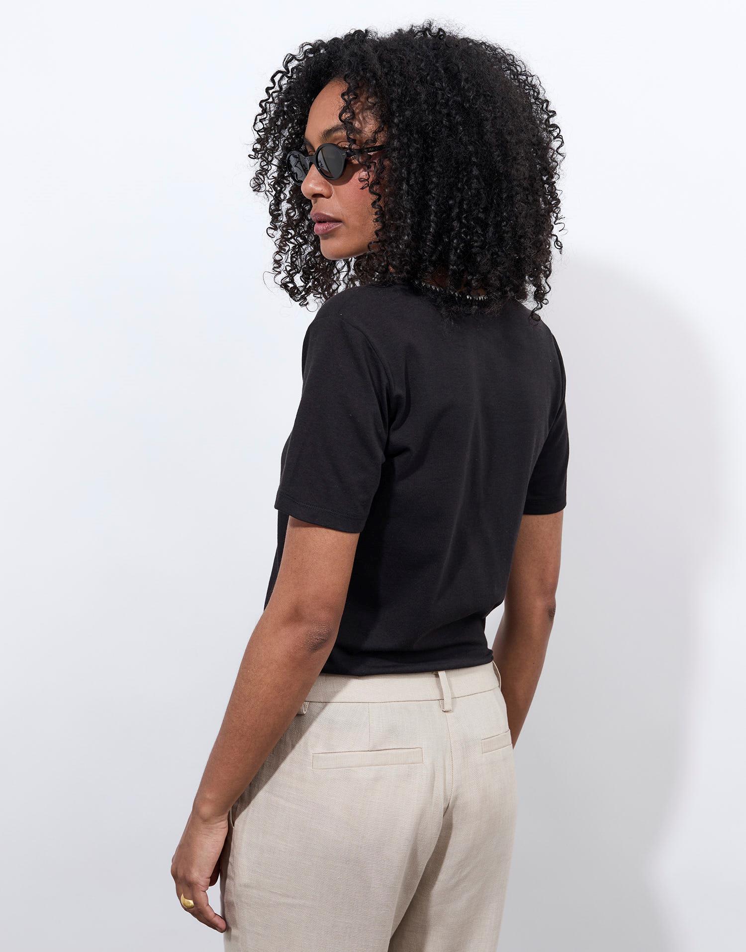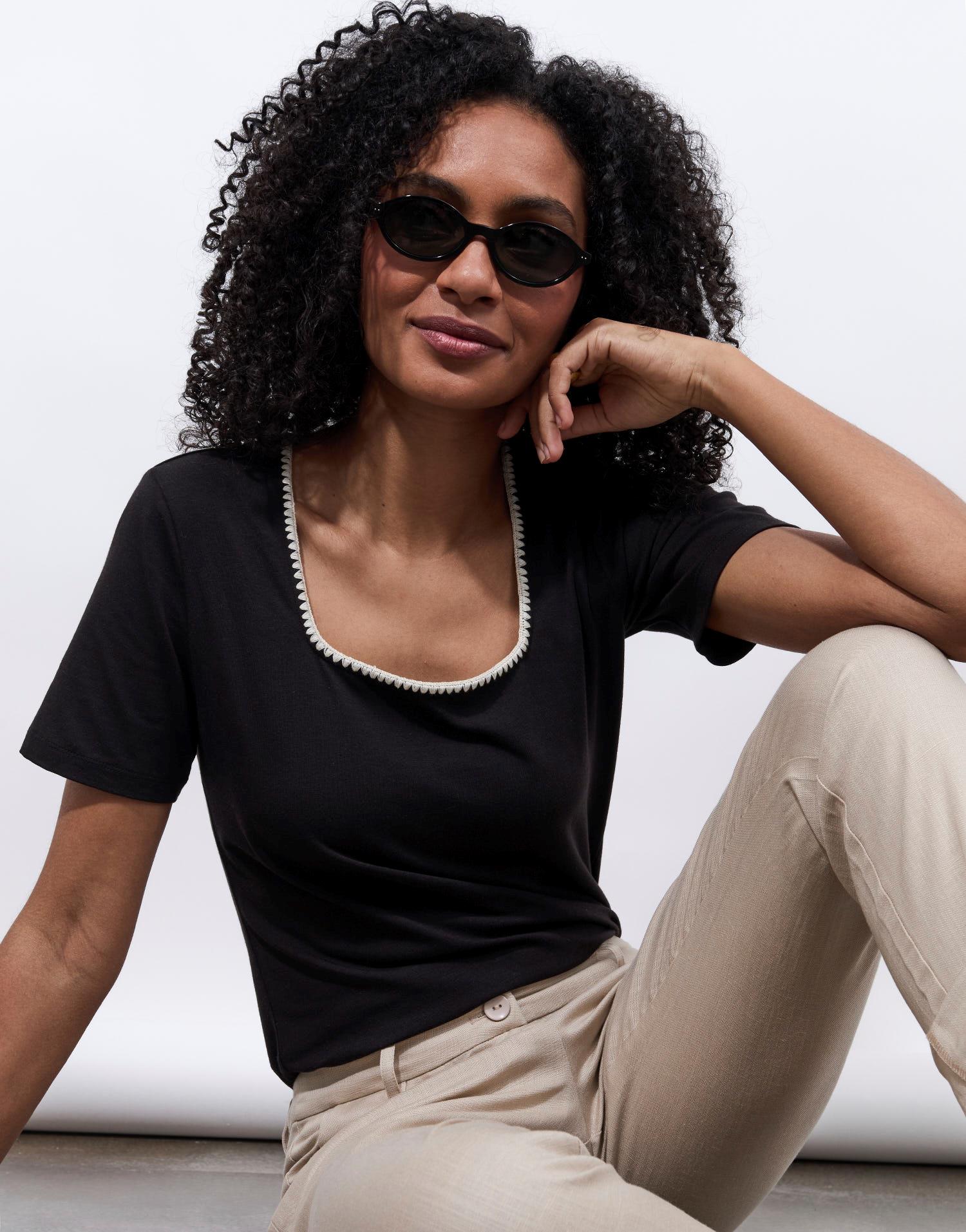 Détails produit : T-Shirt manches courtes uni décoré, Encolure carrée, manches courtes et décoré. Couleur : NOIR