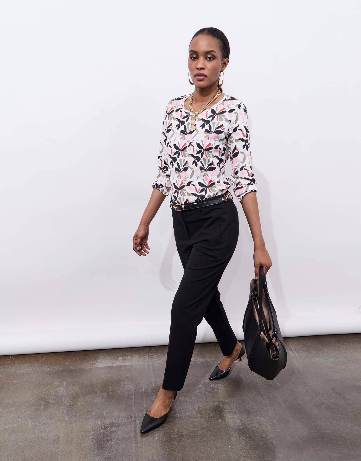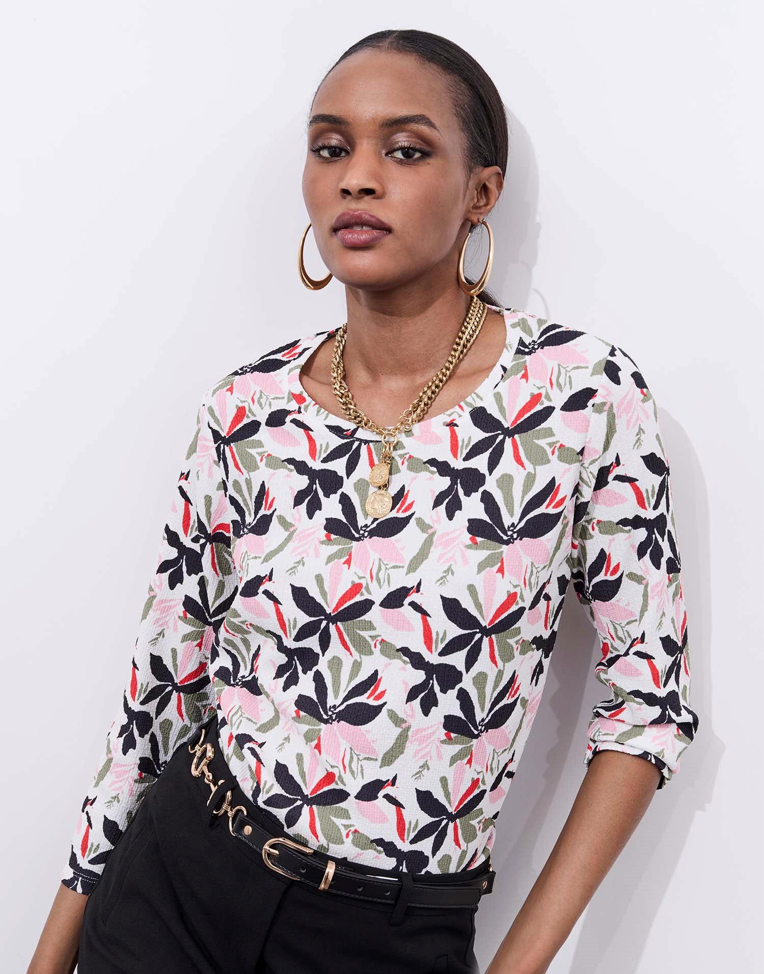 T-shirt imprimé à manches longues, doté d’une encolure arrondie. Son motif floral multicolore apporte une touche fraîche et féminine à ce modèle confortable et facile à porter. Idéal pour dynamiser une tenue du quotidien avec élégance.La mannequin mesure 1m75 et porte une taille 01.