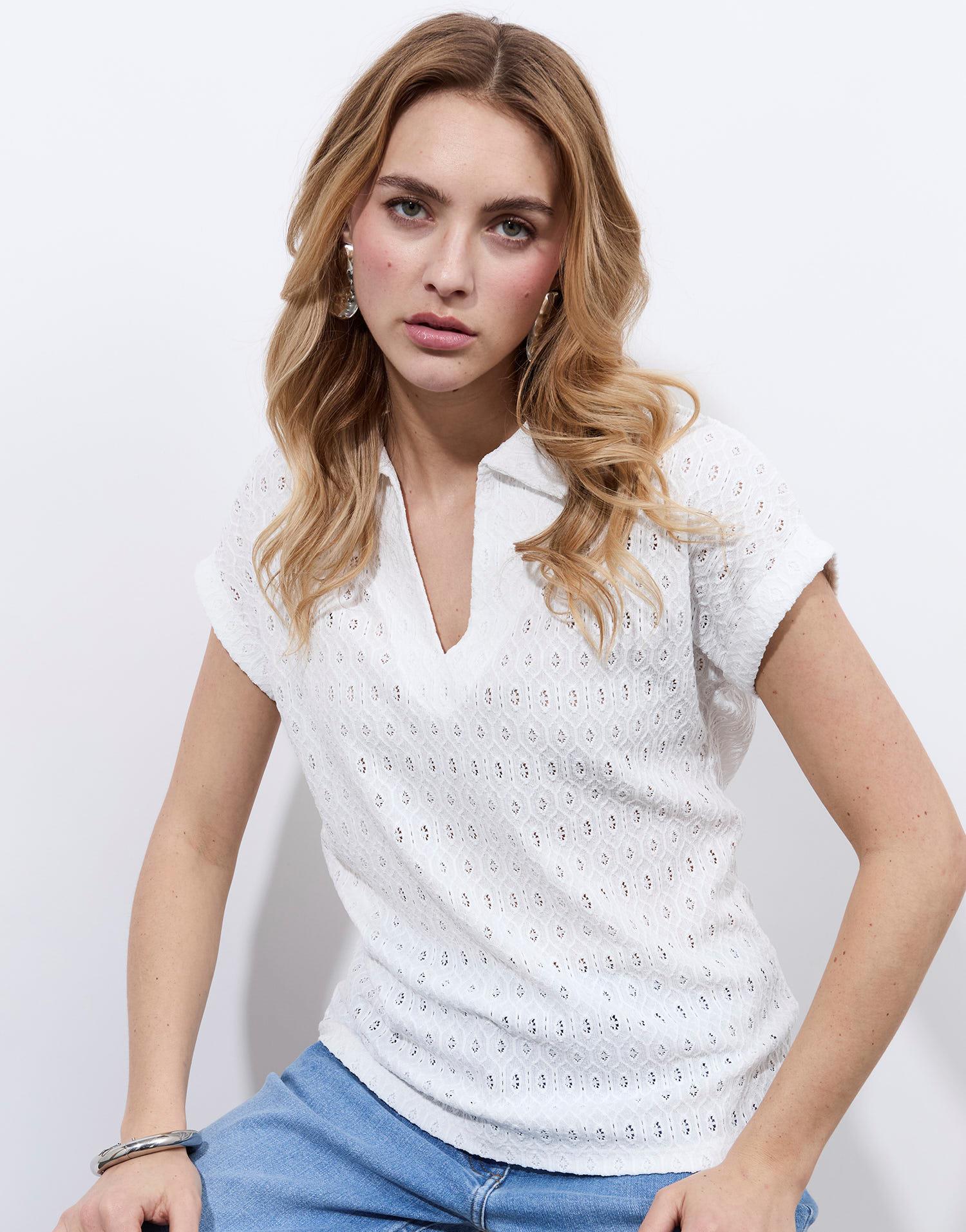 Détails produit : Top manches courtes uni, Col Polo. Couleur : BLANC